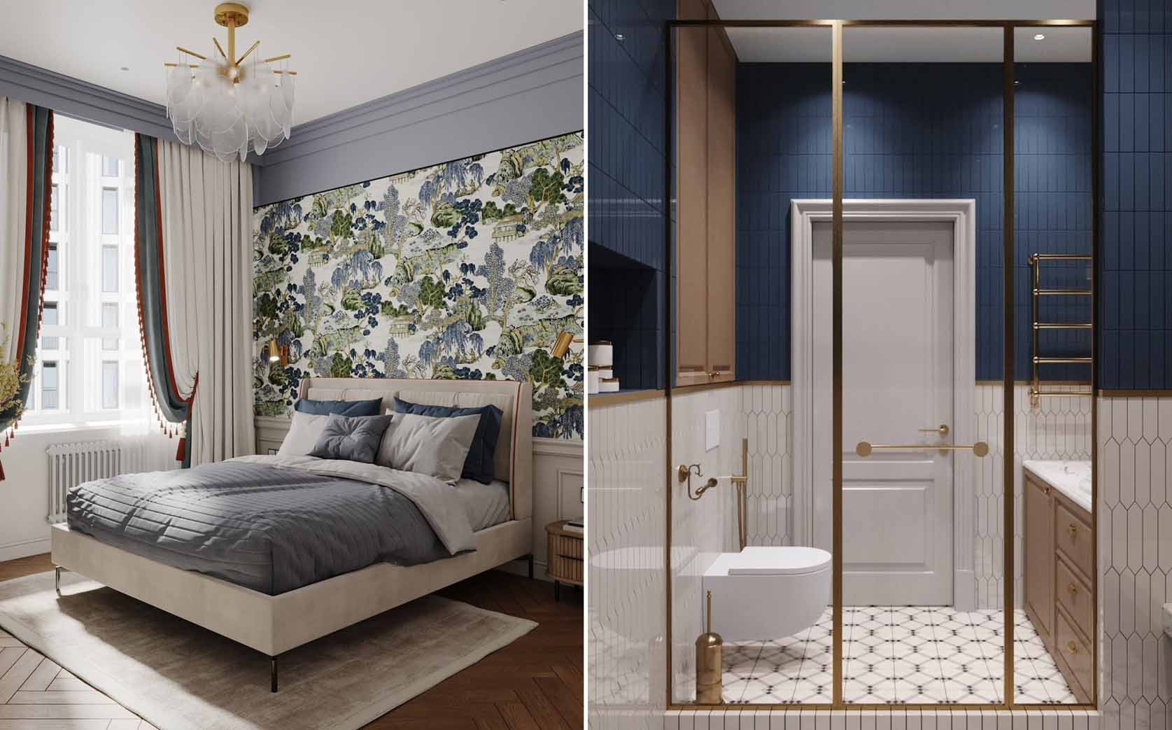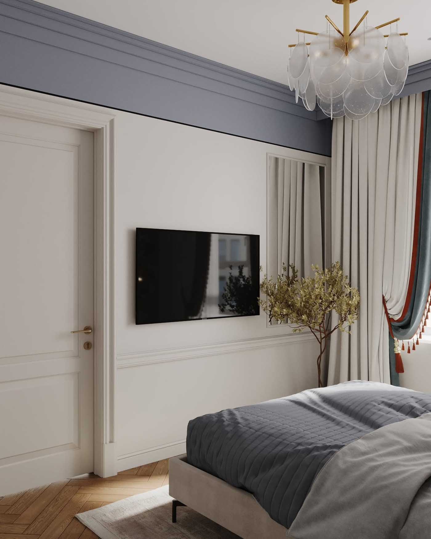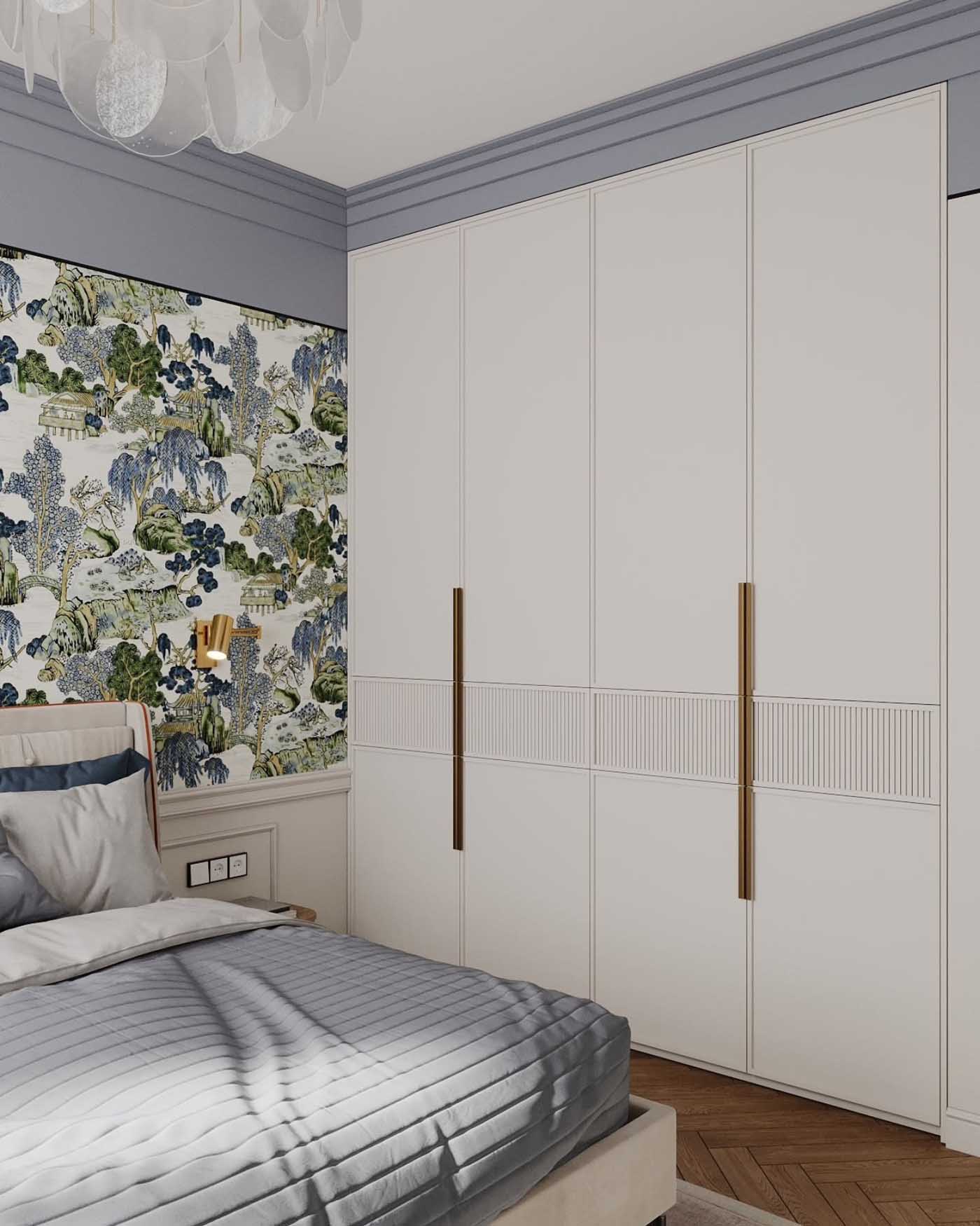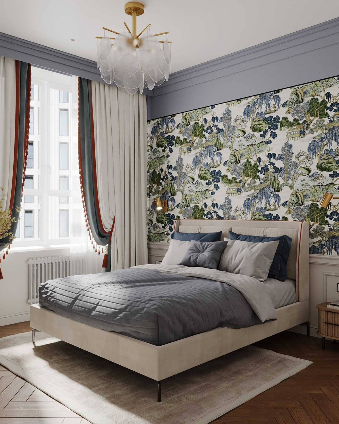 A háló egyik legerősebb megoldása a tapétázott ágy mögötti fal, amit a tervező keretezett felületként hozott létre. A falburkolat alul panelekkel zár, felül pedig egy hangsúlyos színű sáv fogja össze a kompozíciót. Ettől a mintás felület fókusz marad, de nem nyomja össze a szobát.