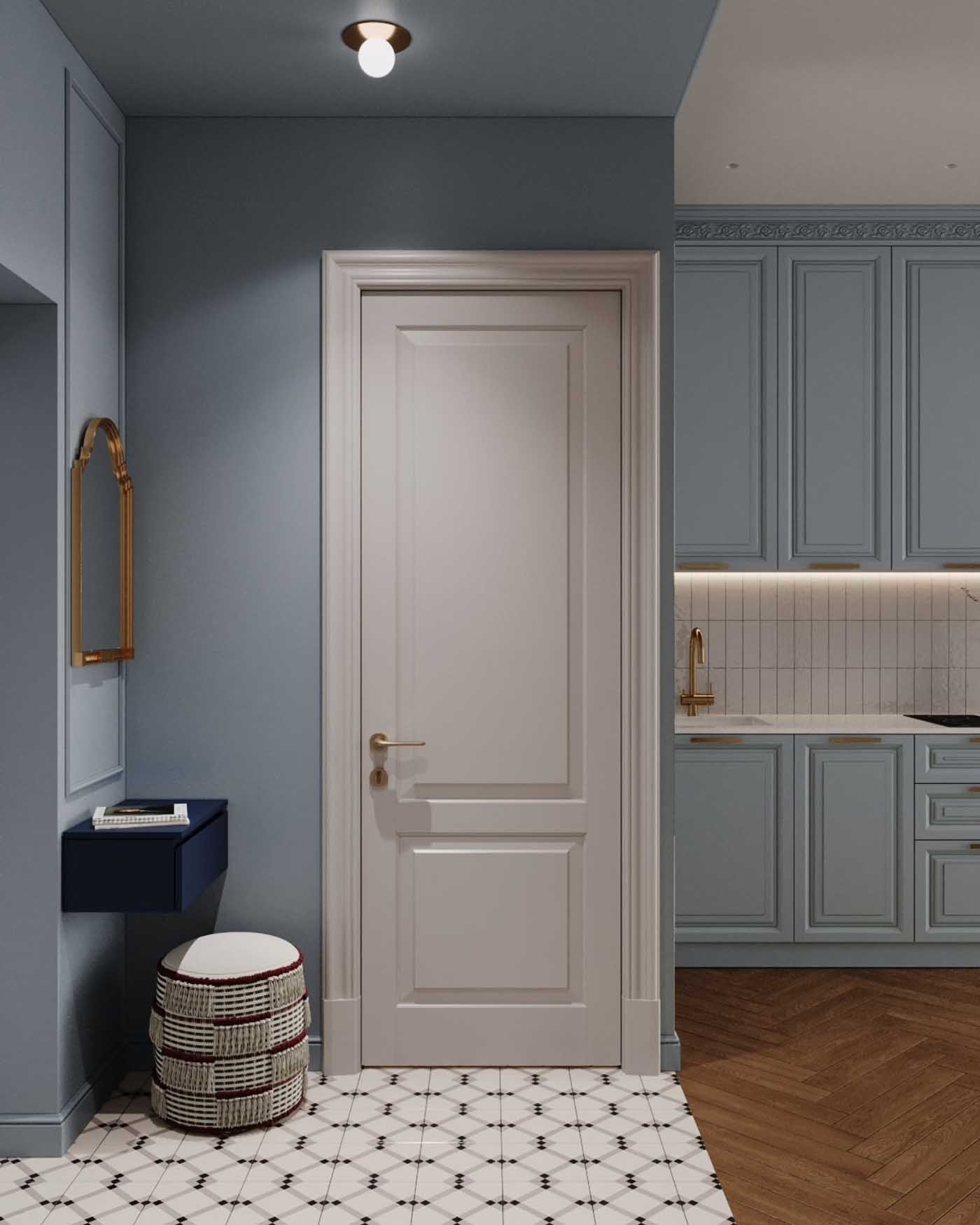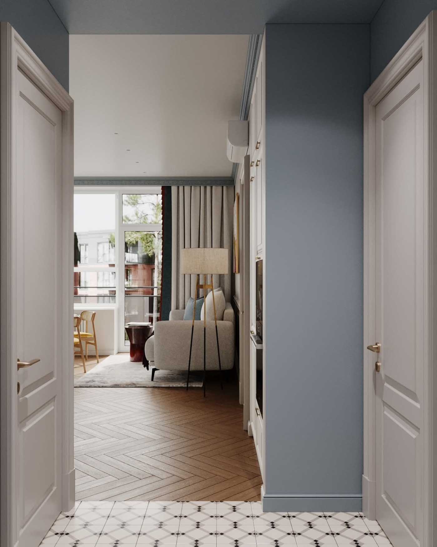 Bájos, és a kis alapterületen is jól szervezett életteret hozott létre a tervező egy fiatal párnak. A színpaletta tudatosan szűk: poros szürkés- ill. mély kékek, törtfehérek, a fa parketta meleg tónusa és visszafogott, de határozott sárgaréz részletek (fogantyúk, csaptelep, lámpatestek). Ez a fegyelmezett anyag- és színkezelés tipikusan olyan eszköz, ami kis alapterületnél nem csak esztétikai kérdés: segít abban, hogy a lakás sokféle funkciója egyetlen, koherens rendszernek hasson.