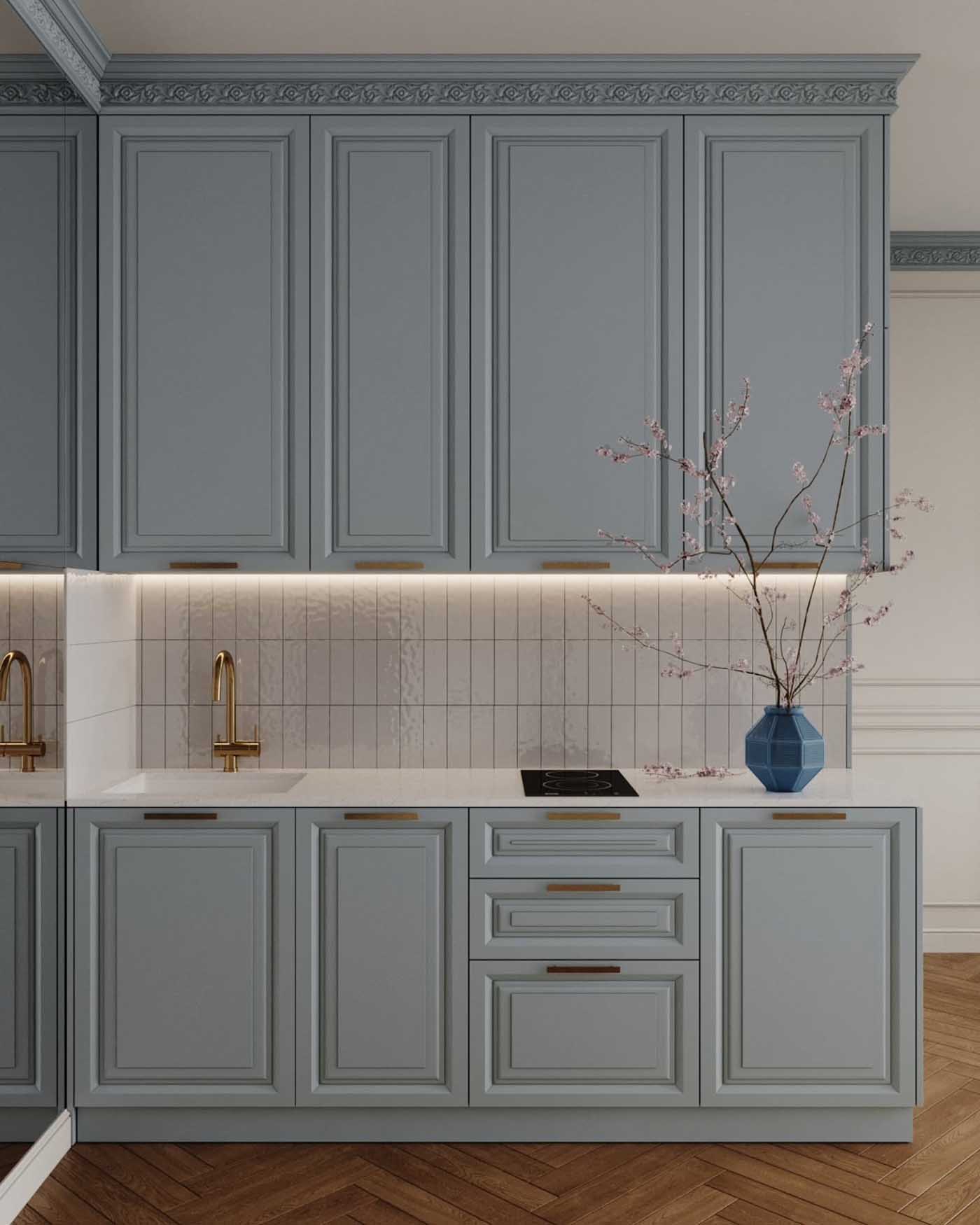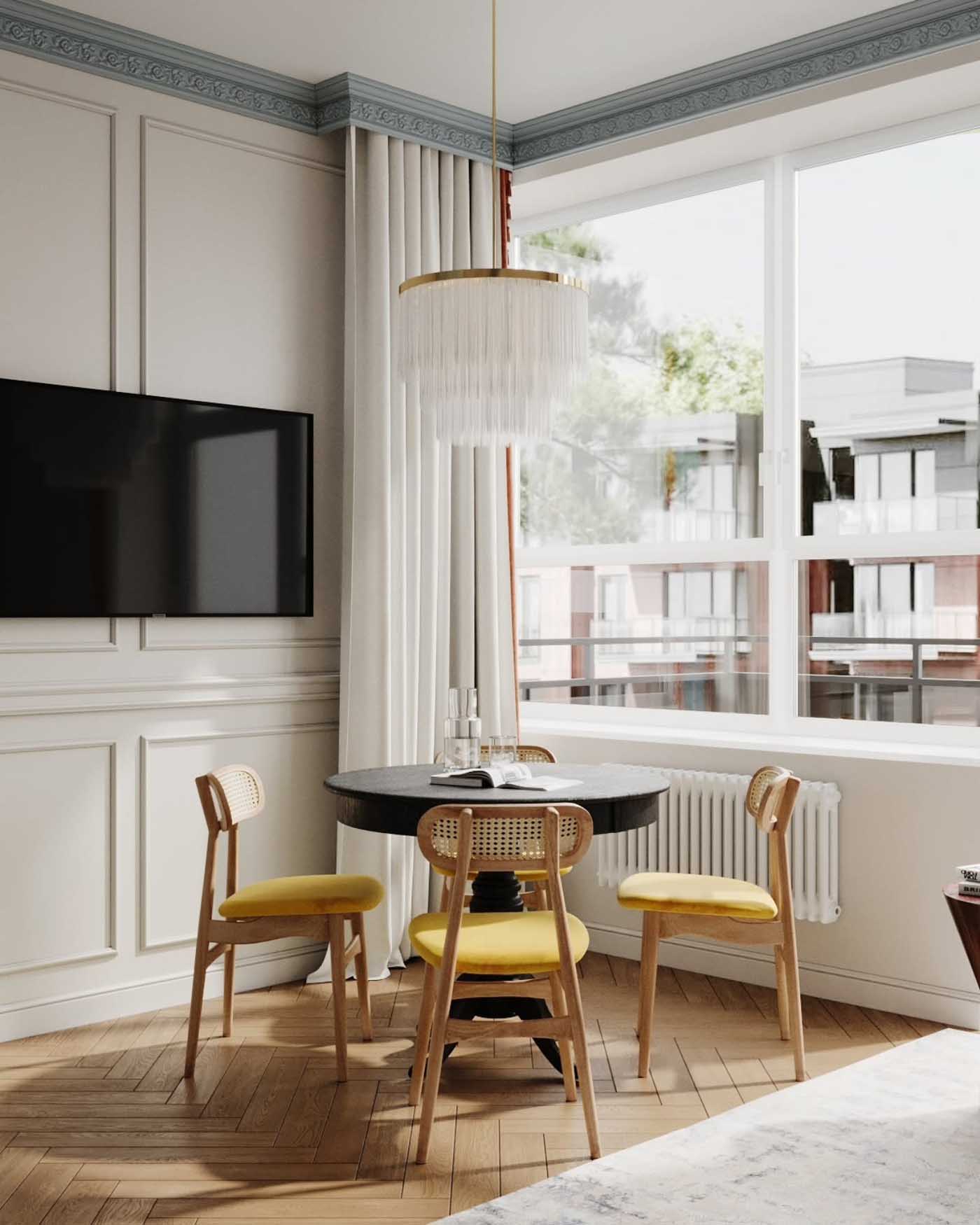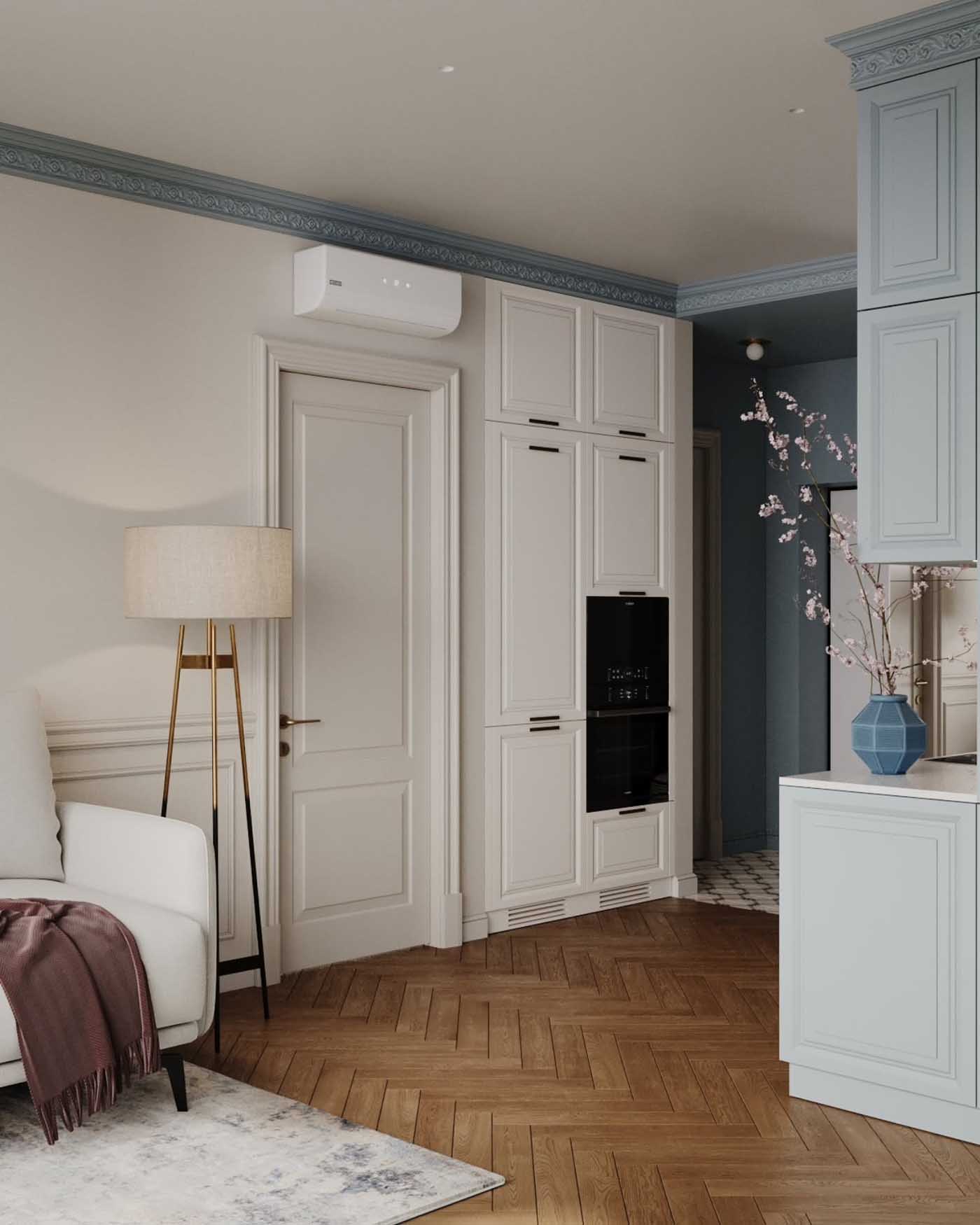 A 37 négyzetméteren a terek egymásra fűzése egyértelmű: az előszobából rövid közlekedőn át nyílik a nappali-konyha zóna, külön helyiségben kapott helyet a háló, a fürdő pedig a kis alapterület ellenére is tagolt, jól használható. A koncepciót a klasszikus arányok és díszítőelemek (falpárkányok, kazettás ajtók, profilozott szegélyek) és a modern, beépített bútorzat „dolgozza össze” – ettől az enteriőr egyszerre rendezett és otthonos, de zsúfoltságérzet nélkül.