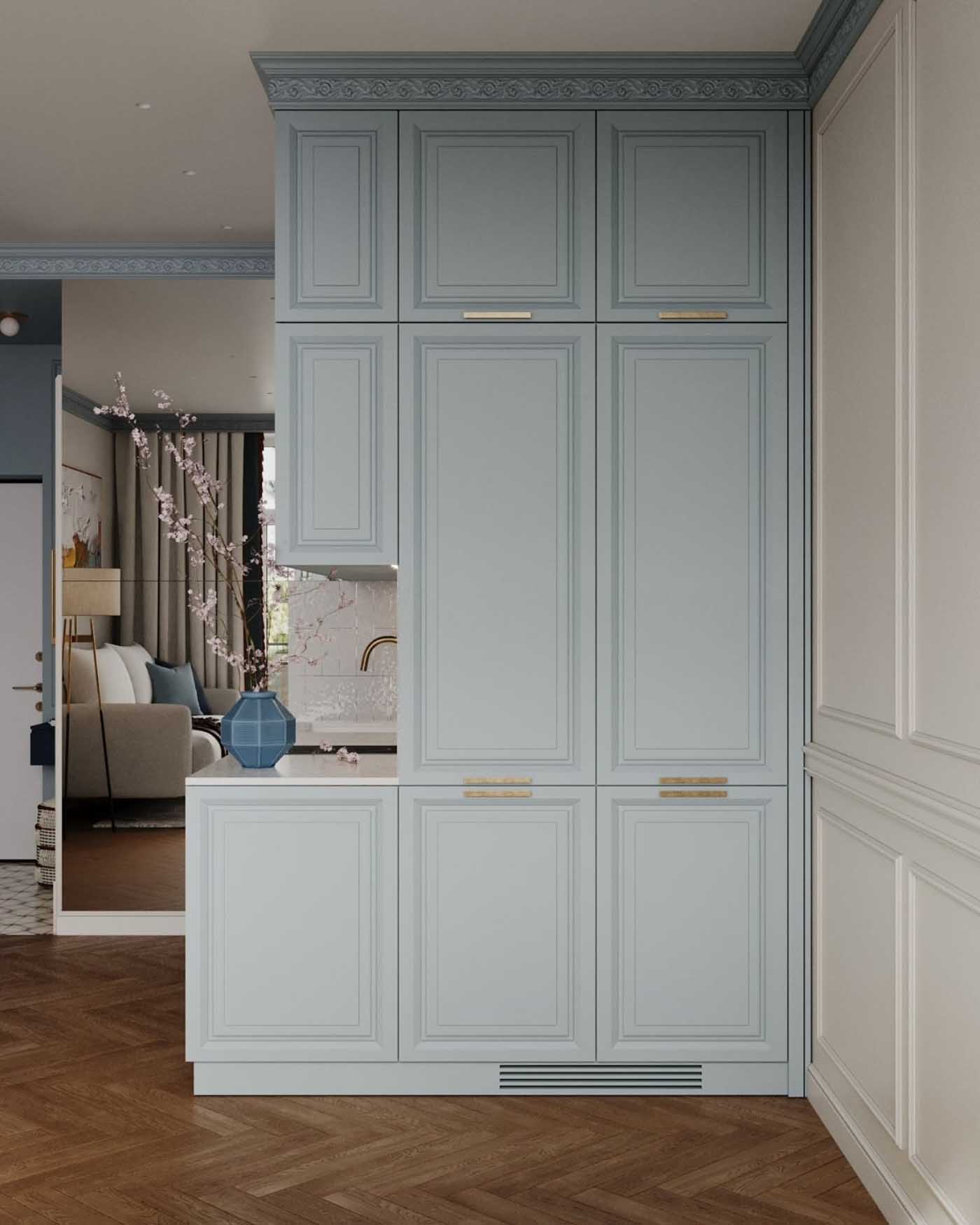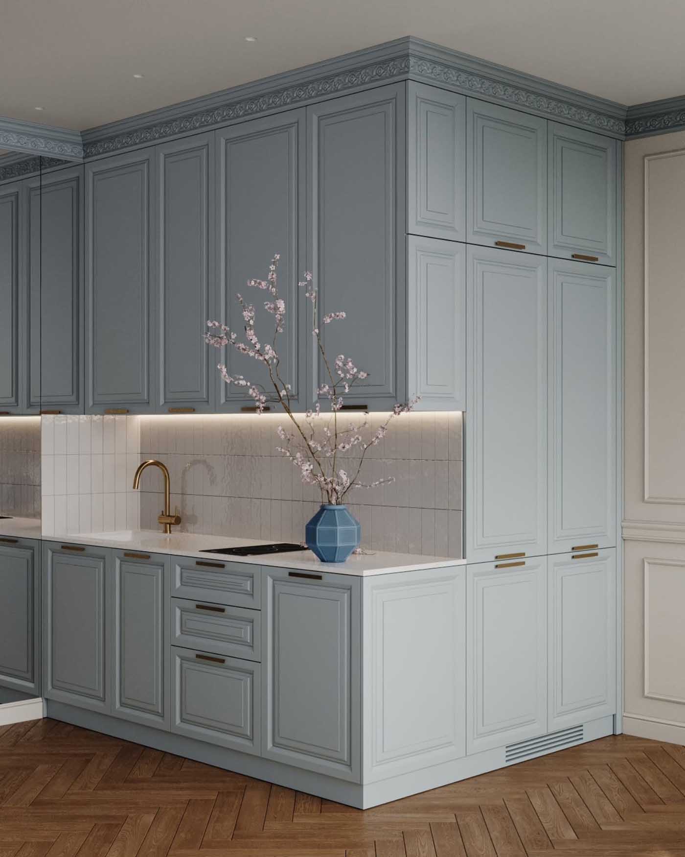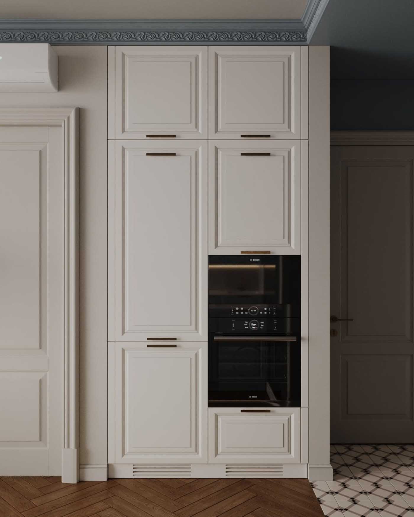 Profi ötlet: Mennyezetig beépített konyha (valóban mennyezetig), párkányos lezárással – a felső zóna a ritkán használt tárgyak tárolására szolgál, és „egy tömbnek” mutatja a konyhát.