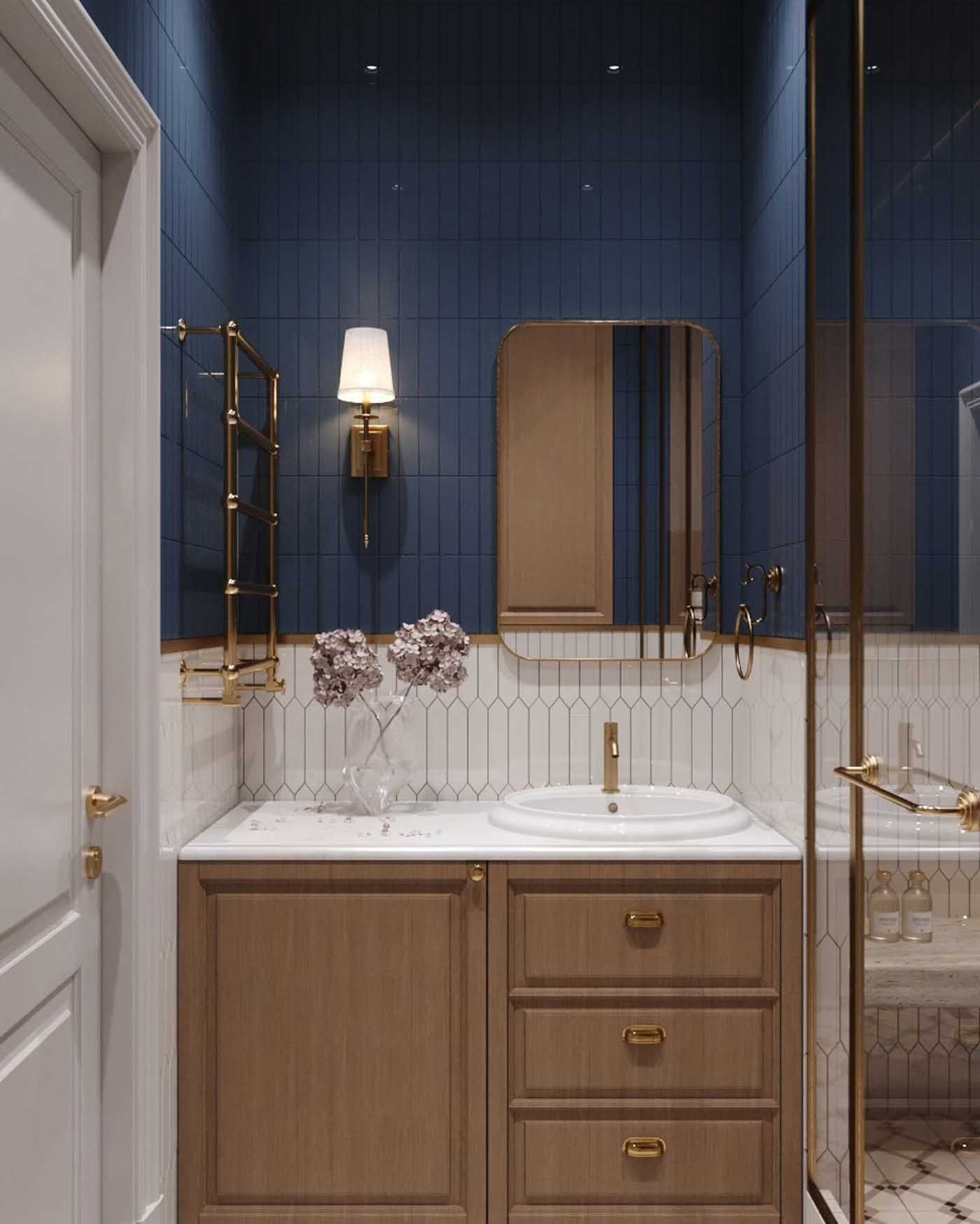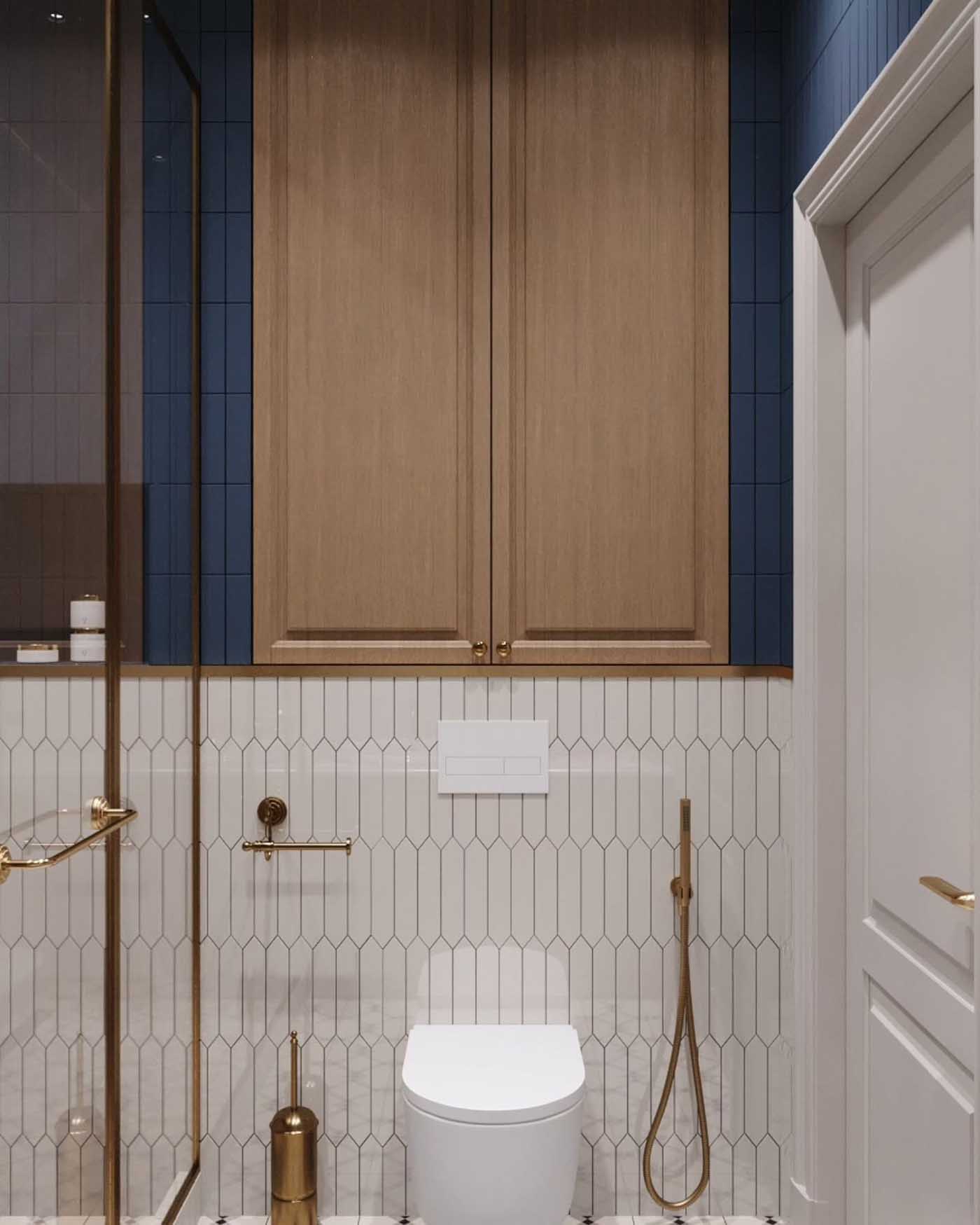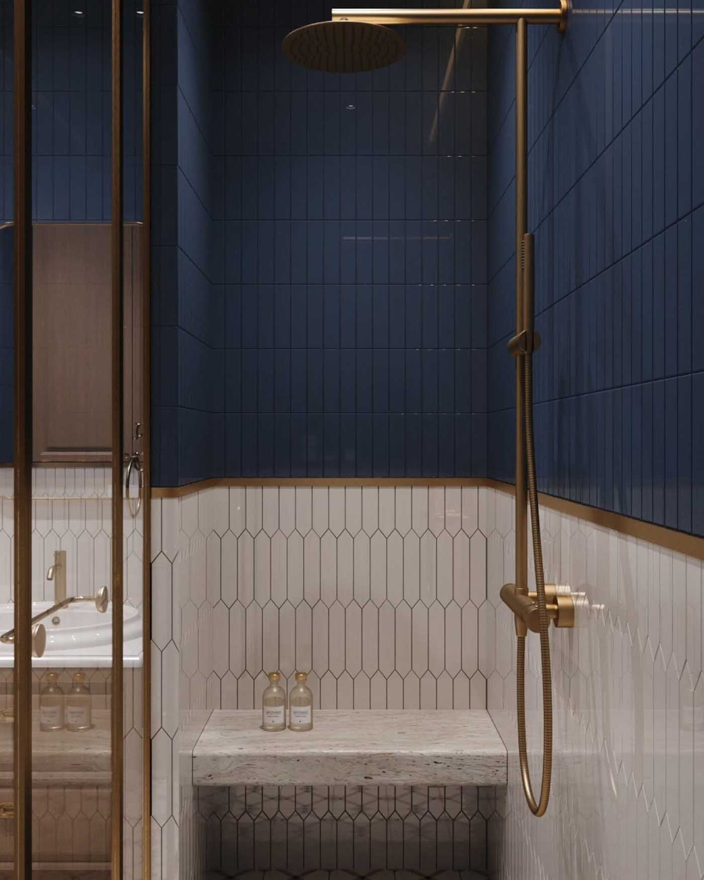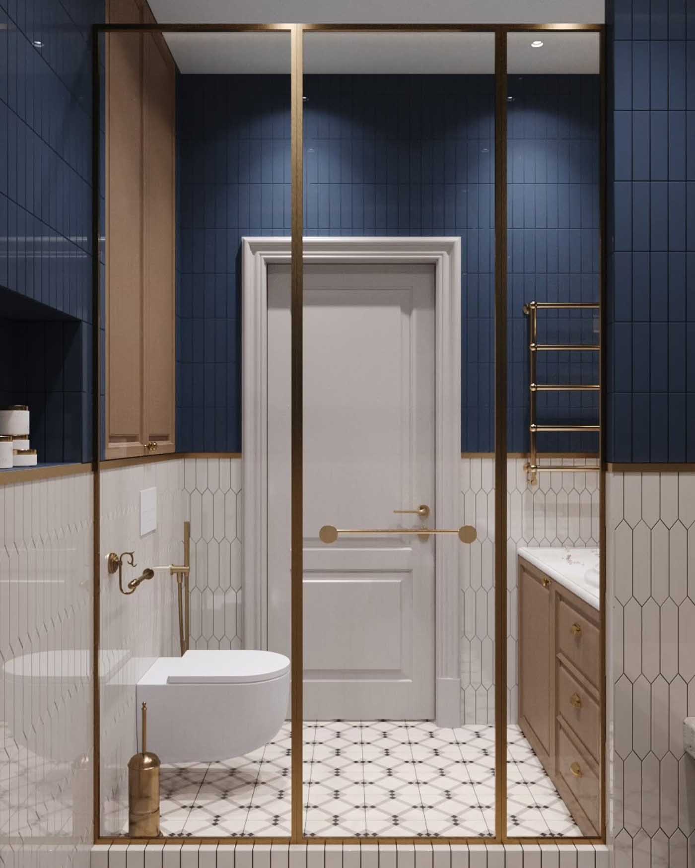 A fürdőben a vizes zónát egy arany tónusú keretes üvegfallal választották le. Ez a megoldás több szempontból is „kis alapterület-kompatibilis”: a fényt nem állítja meg, a kis helységben nem csökken a térérzet. A falburkolat itt is két részre tagol: alul világos, hosszúkás hatszög, felül sötétkék, függőleges kiosztású csempe. A függőleges tagolás optikailag „megnyújtja” a felületeket, de a lényeg inkább az, hogy a váltás magassága következetes, és a fürdő minden elemével együtt szerkesztett.