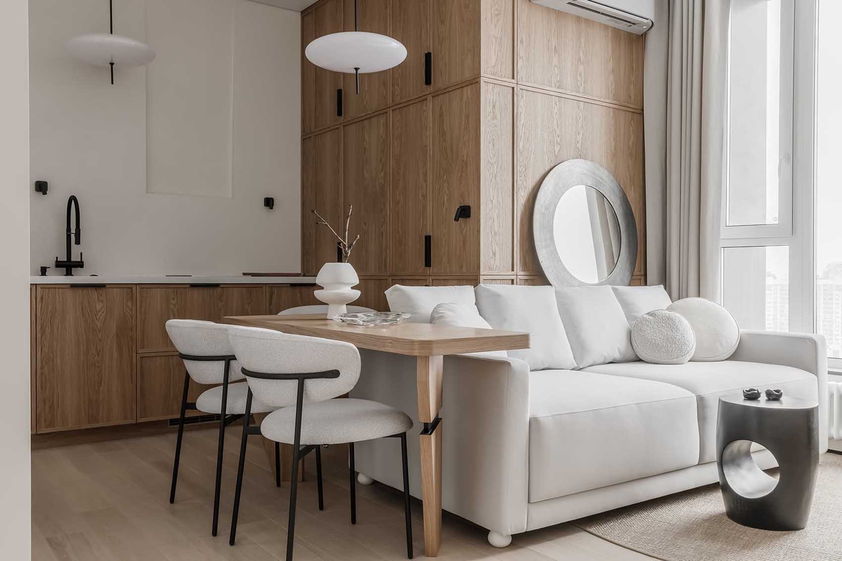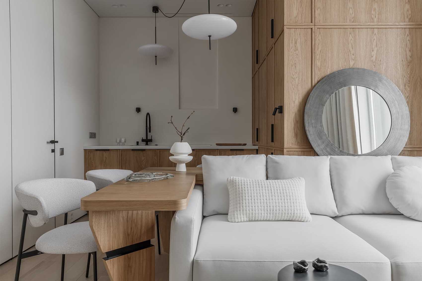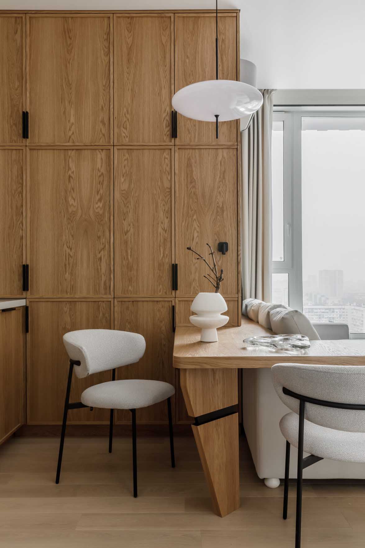 A fiatal férfinak berendezett lakásban a tervezési koncepció fókuszában a modern Japandi stílus és a wabi-sabi filozófia állt, amely egyfajta nyugalom szigeteként funkcionál a nyüzsgő nagyvárosban. Az enteriőr a férfi életmódjához és mindennapi szükségleteihez igazodik, a tervező igyekezett kerülni a túlzottan maszkulin, brutális megoldásokat. A letisztult, világos tónusok, a natúr fafelületek és a semleges színpaletta időtálló, békés hangulatot teremtenek. A minőségi, jól bevált anyaghasználat – a padlón végigfutó rétegelt fapadló, a festett és dekorvakolattal ellátott falak, valamint a fürdőszobai kőburkolatok – mind az ergonómia és az átgondolt egyszerűség szolgálatában állnak.