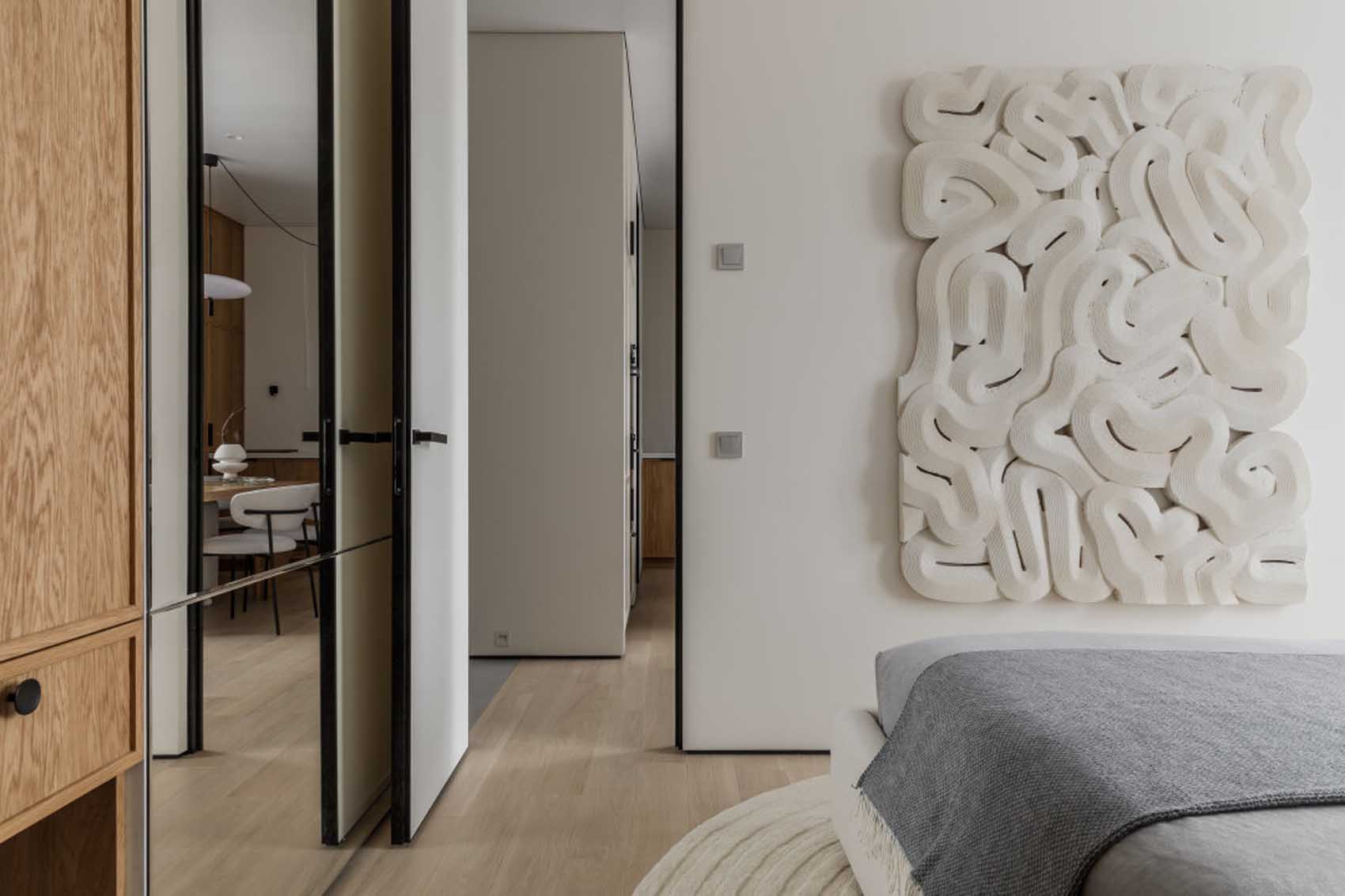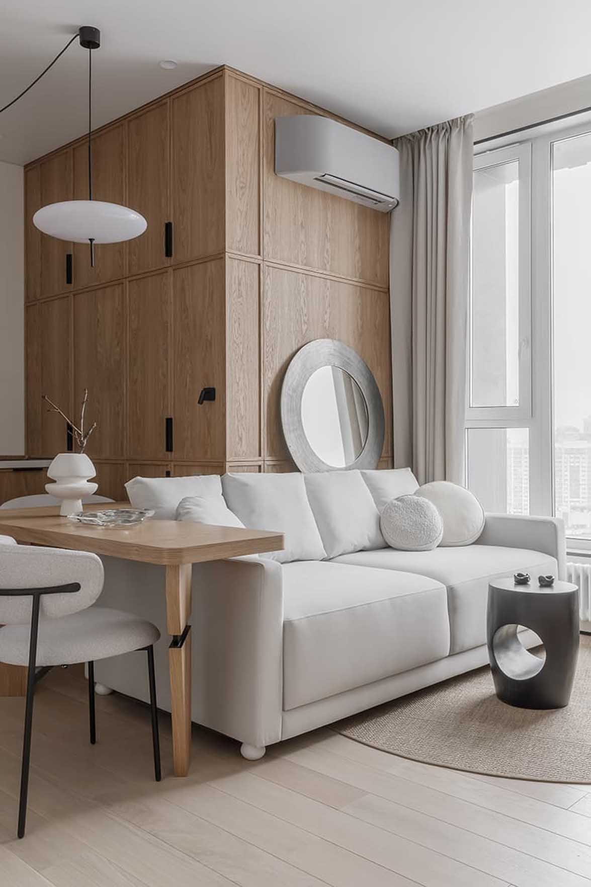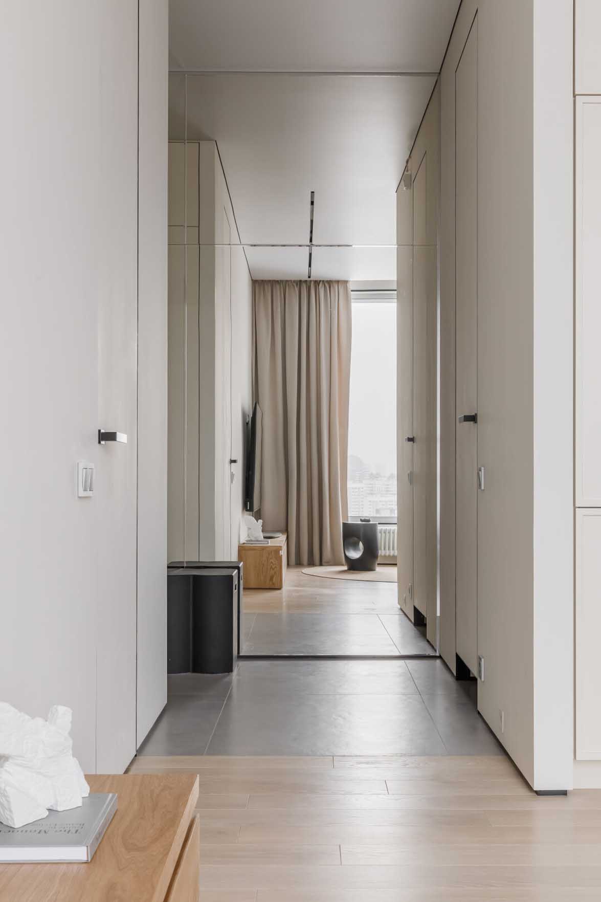 A fiatal férfinak berendezett lakásban a tervezési koncepció fókuszában a modern Japandi stílus és a wabi-sabi filozófia állt, amely egyfajta nyugalom szigeteként funkcionál a nyüzsgő nagyvárosban. Az enteriőr a férfi életmódjához és mindennapi szükségleteihez igazodik, a tervező igyekezett kerülni a túlzottan maszkulin, brutális megoldásokat. A letisztult, világos tónusok, a natúr fafelületek és a semleges színpaletta időtálló, békés hangulatot teremtenek. A minőségi, jól bevált anyaghasználat – a padlón végigfutó rétegelt fapadló, a festett és dekorvakolattal ellátott falak, valamint a fürdőszobai kőburkolatok – mind az ergonómia és az átgondolt egyszerűség szolgálatában állnak.