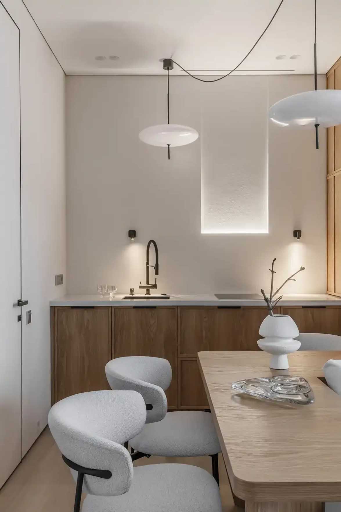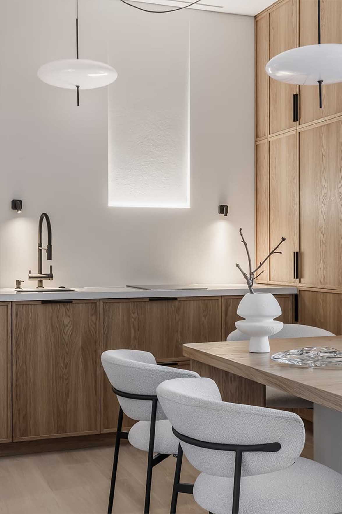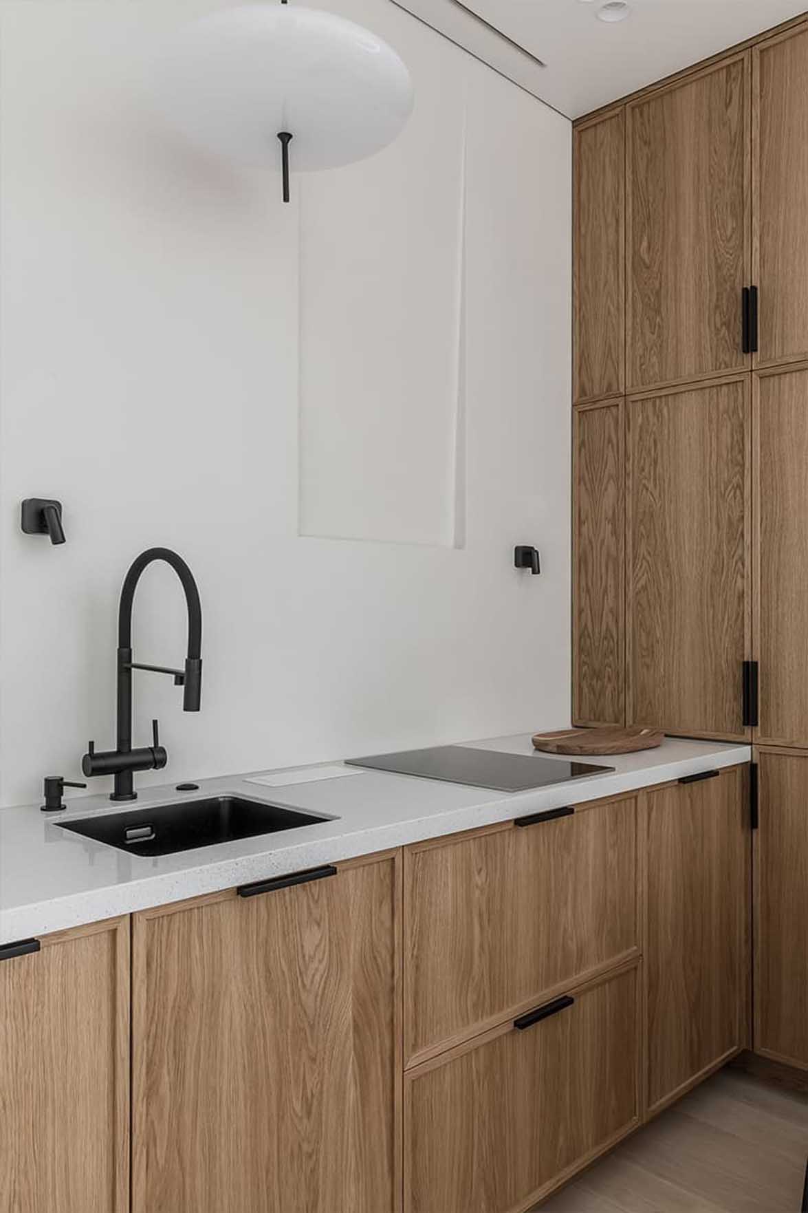 A nappalival egy légtérben található konyhában a tágasság érzetének megőrzése érdekében lemondtak a nehézkes felső szekrényekről. A tárolást és a praktikumot egy padlótól mennyezetig érő beépített blokk biztosítja, amely szinte az összes háztartási gépet magába foglalja. A kisebb eszközök, mint például a vízforraló, egy diszkrét, kihúzható platformon kaptak helyet. A munkafelület felett egy rejtett LED-világítással ellátott dekoratív falfülkét alakítottak ki, amelyet két fekete falikar és kontrasztos függőlámpák egészítenek ki, míg a pult célzott megvilágítását a falba süllyesztett, minimalista lámpatestek biztosítják. A konyhabútor fafurnér frontjai vizuálisan összekötik és egységesítik a konyha és a nappali terét.