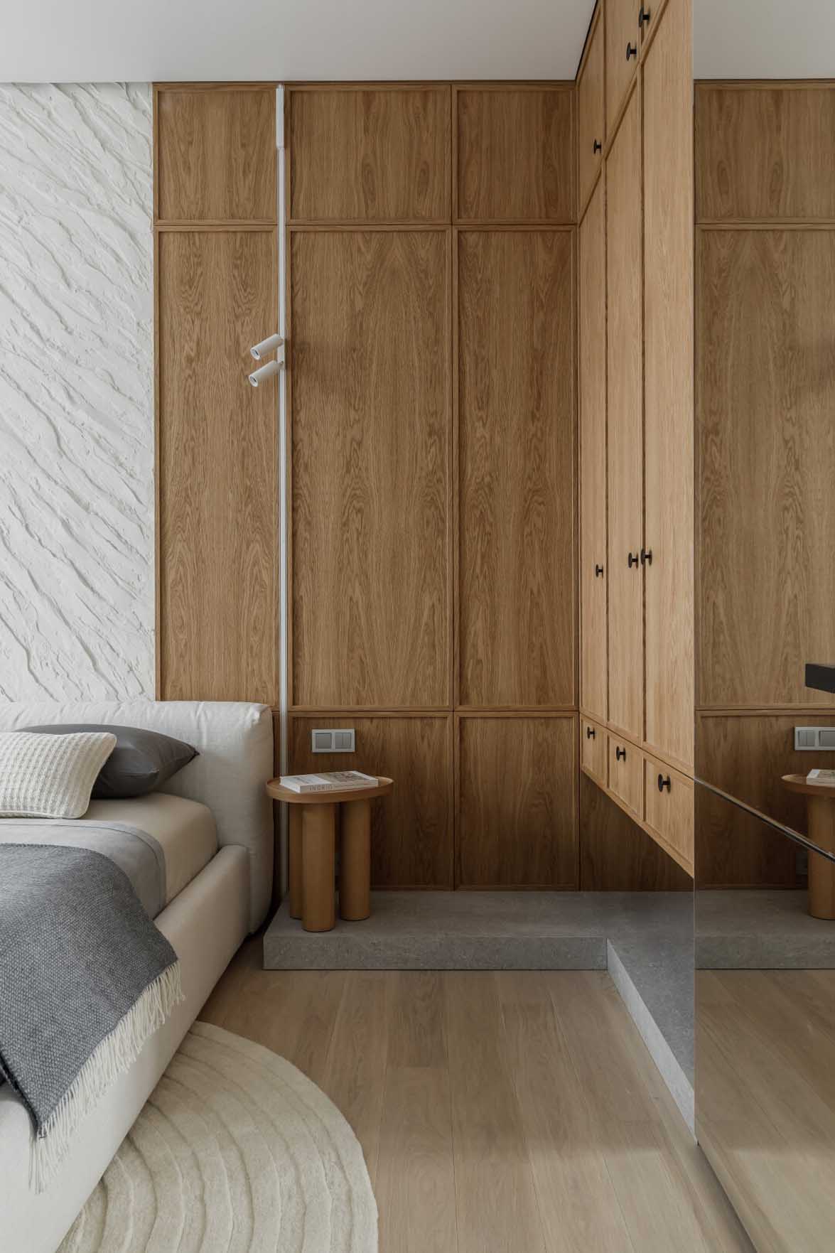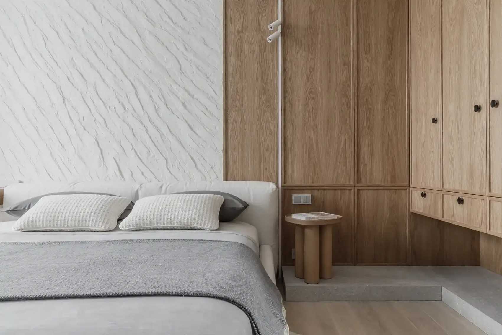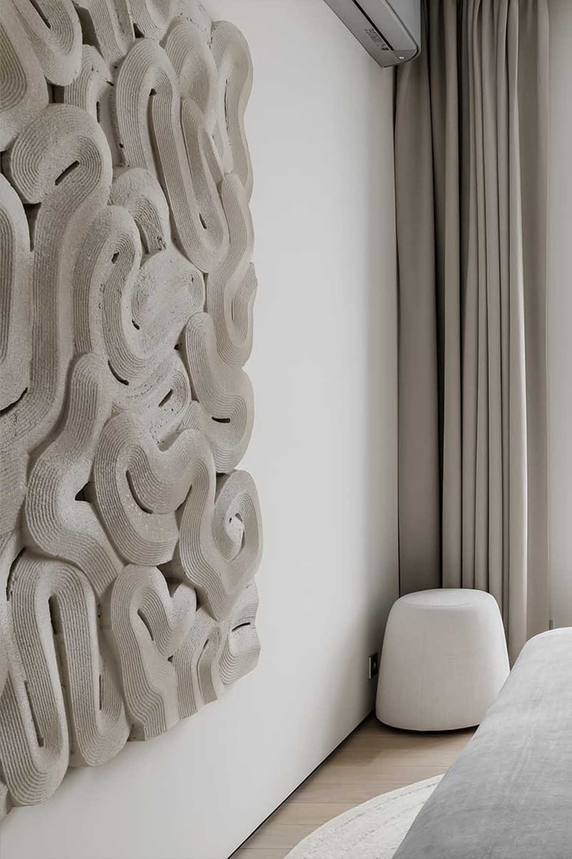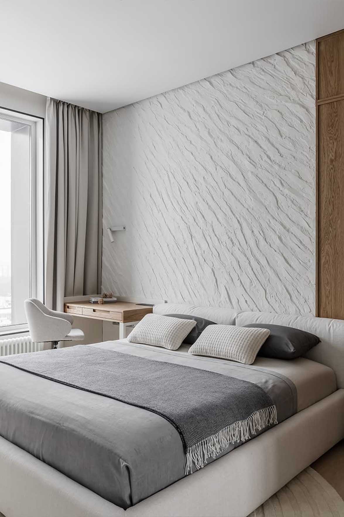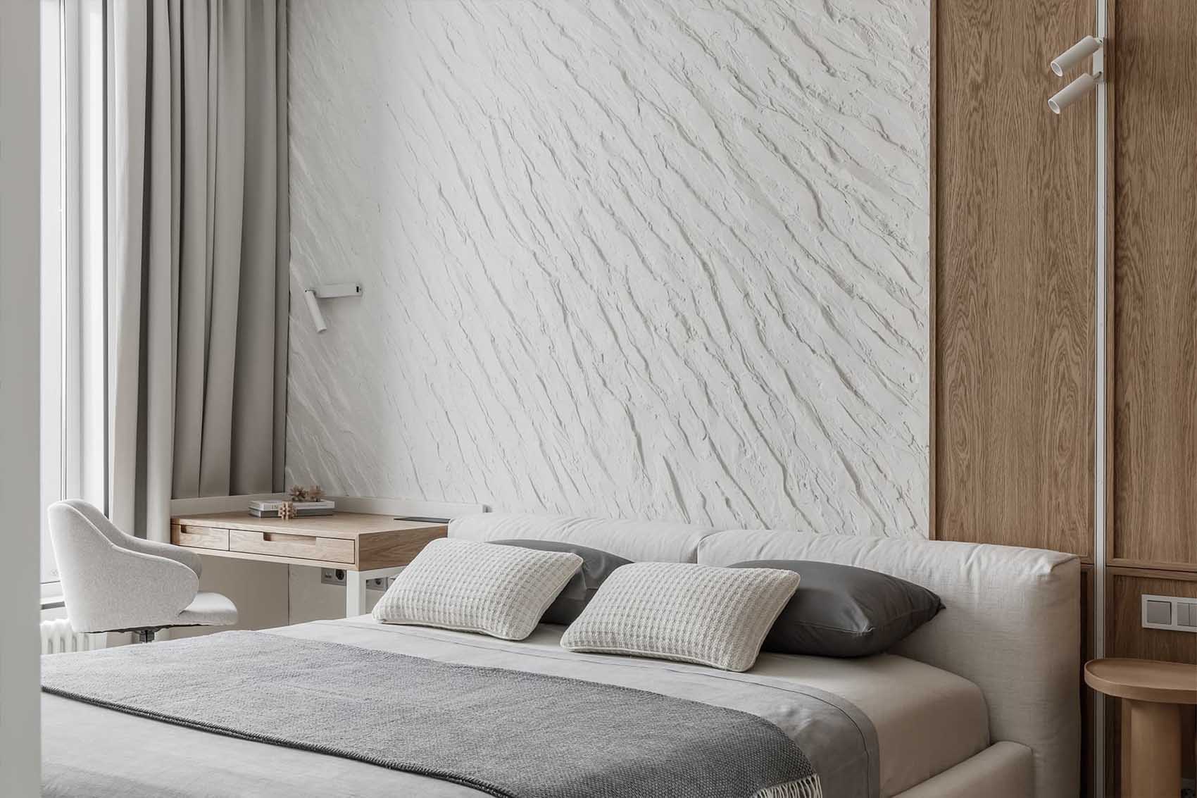 A nappali nyugodt hangulata a hálószobában is folytatódik, ahol az ágy mögötti fal szintén nyers, kőhatású textúrát kapott. Ezt a brutalizmust szépen lágyítja az ágy tapintható, puha kárpitozott fejvége és a lekerekített formájú szőnyeg. A szoba fő dekorációs eleme egy könnyed, kifejezetten ehhez a projekthez kézzel készített, térbeli fehér falipanel. A térben egy kényelmes dolgozóasztal is helyet kapott a tanuláshoz. A hagyományos, központi csillár helyett egy összetett világítási rendszert építettek ki: az akcentusfalat felső surlófények emelik ki, az asztalnál irányított lámpa biztosítja a munkafényt, míg az esti, “éjszakai” funkciót a padlóhoz közeli, illetve a fejvégnél elhelyezett lágy fényforrások látják el, tökéletesen alkalmazkodva a reggeli készülődés, a tanulás vagy a pihenés különböző forgatókönyveihez.