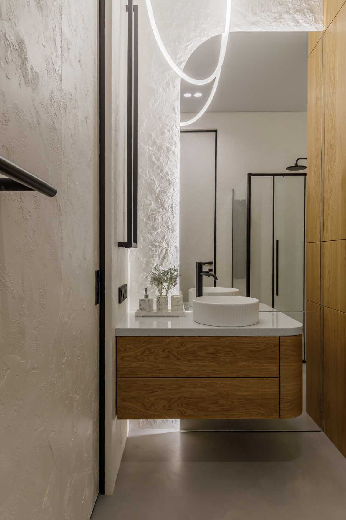 A kisméretű fürdőszobában a falakon alkalmazott dekoratív bevonat optikailag tágítja, levegősebbé teszi a teret. A falfelület textúráját egy speciális, érintésre szabályozható világítási rendszer emeli ki, amelynek köszönhetően a helyiség hangulata egyetlen mozdulattal megváltoztatható.