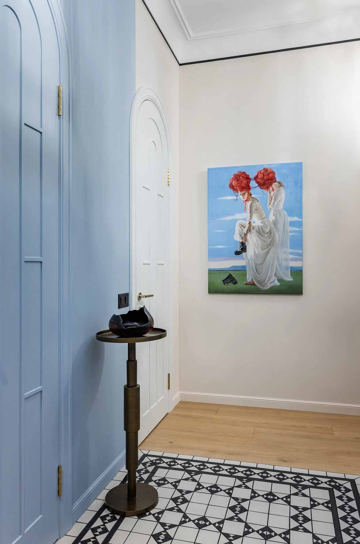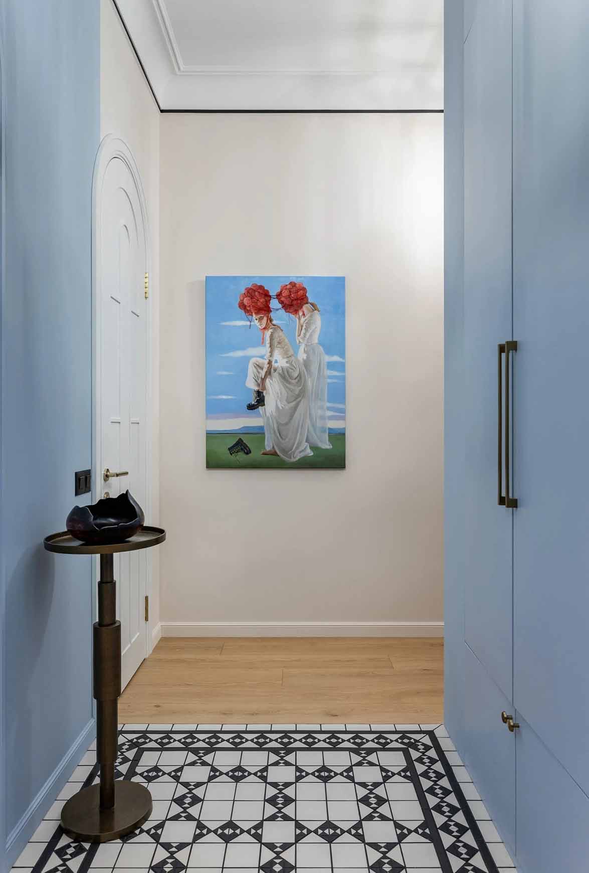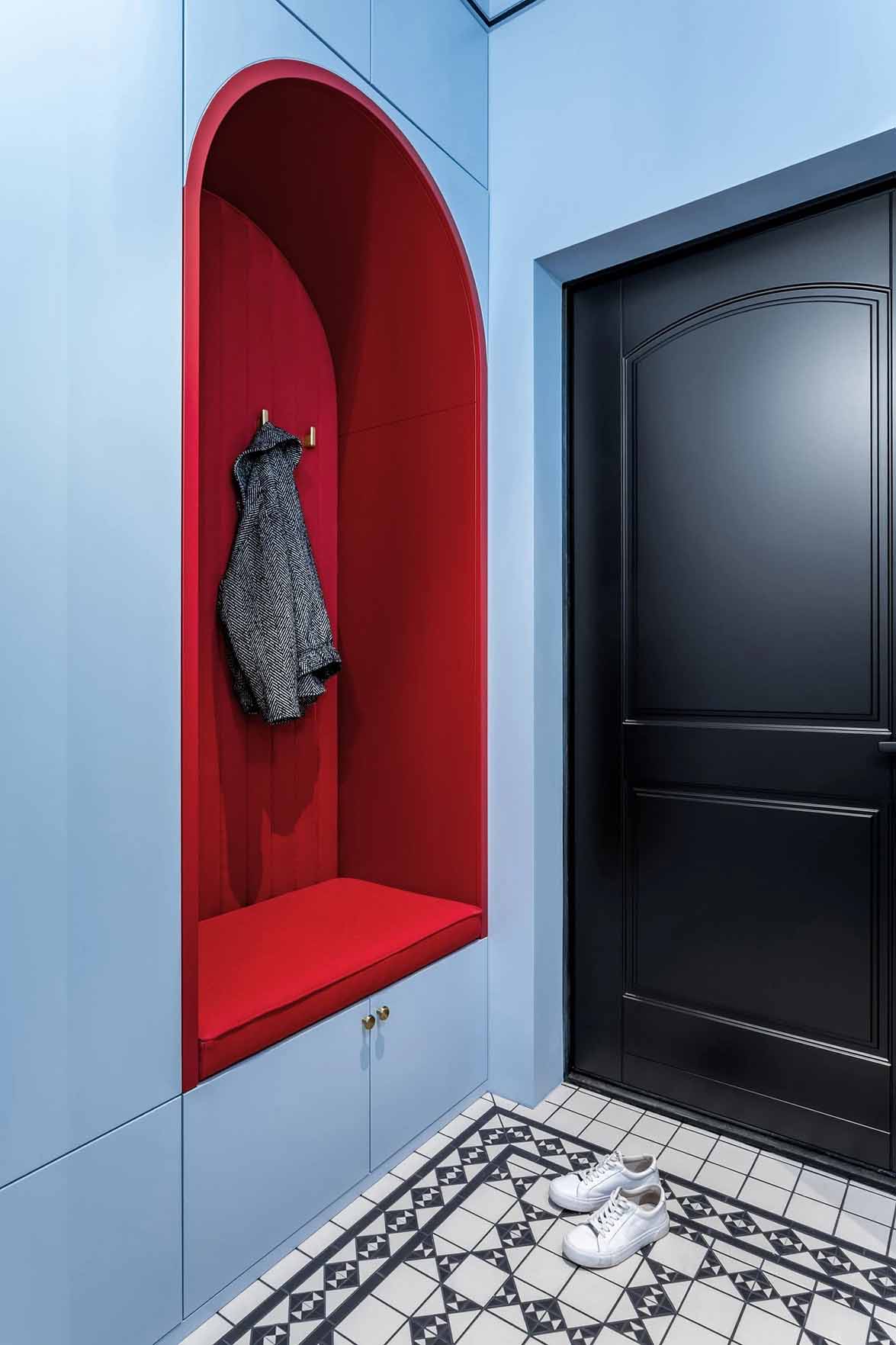 A belépő vendéget rögtön magával ragadja a látvány: a padlón fekete-fehér kerámialapokból kirakott „szőnyeg” fogad, amely elegáns kontrasztot alkot a halványkék falakkal. Az előszobában egy mélyvörösre festett íves falfülke jelenik meg, amely az első utalás a marokkói inspirációra. A praktikumról egy itt elhelyezett gardróbhelyiség gondoskodik. A mennyezetet a technikai rendszerek (szellőzés) miatt itt 40 centiméterrel lejjebb hozták, de a látványos világítási megoldások és a tiszta vonalvezetés feledtetik a belmagasság csökkenését.