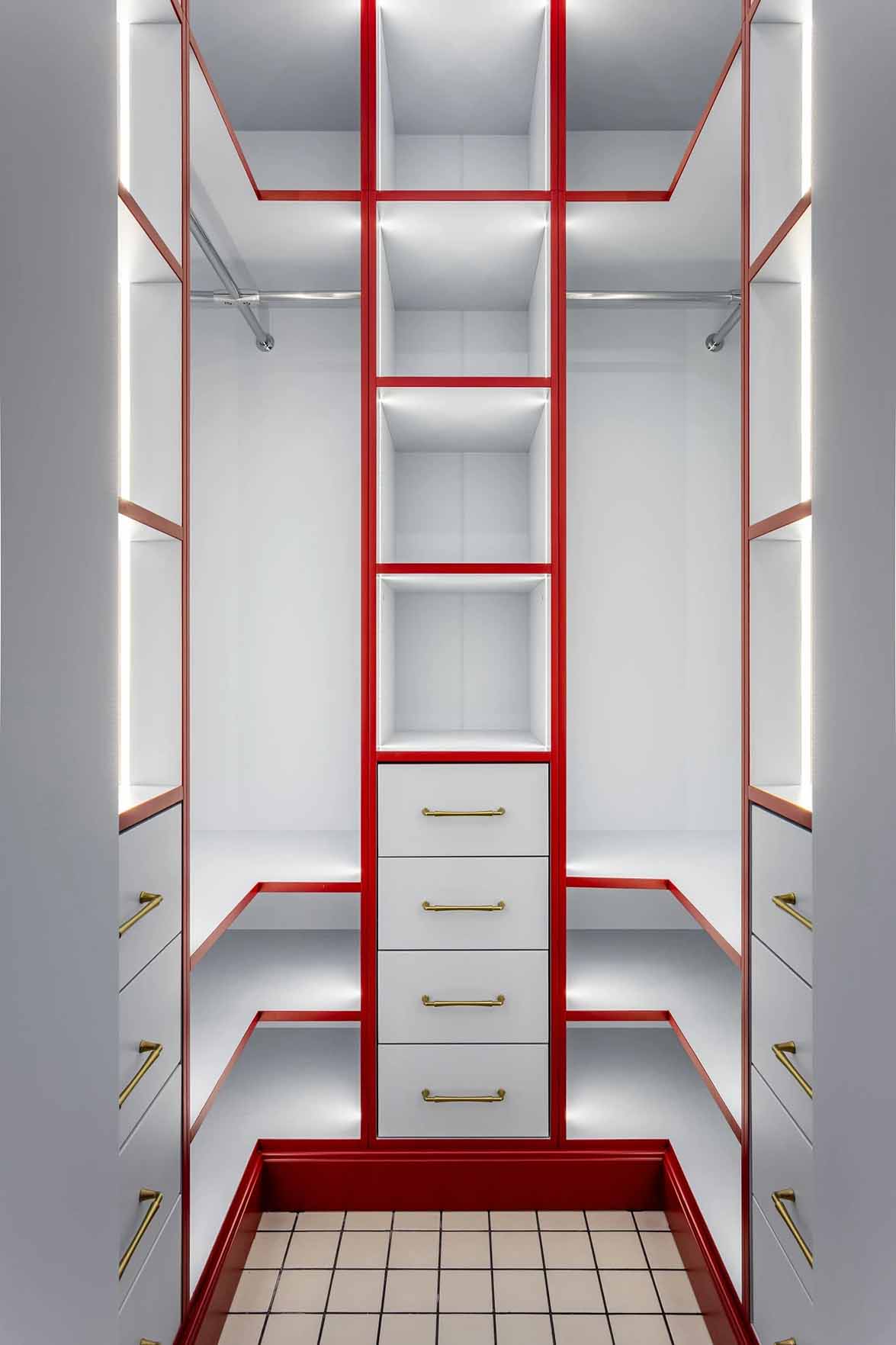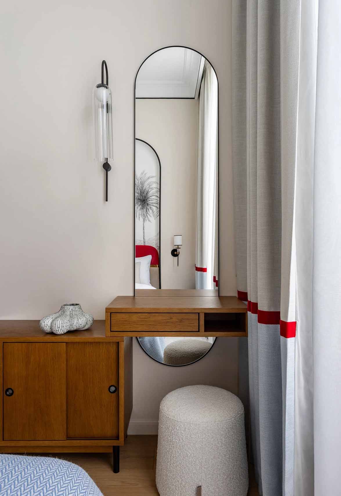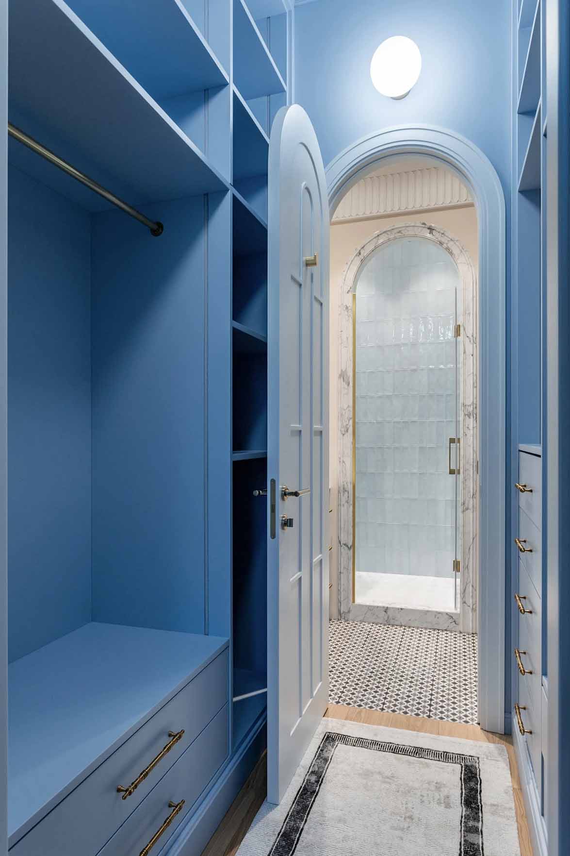 A belépő vendéget rögtön magával ragadja a látvány: a padlón fekete-fehér kerámialapokból kirakott „szőnyeg” fogad, amely elegáns kontrasztot alkot a halványkék falakkal. Az előszobában egy mélyvörösre festett íves falfülke jelenik meg, amely az első utalás a marokkói inspirációra. A praktikumról egy itt elhelyezett gardróbhelyiség gondoskodik. A mennyezetet a technikai rendszerek (szellőzés) miatt itt 40 centiméterrel lejjebb hozták, de a látványos világítási megoldások és a tiszta vonalvezetés feledtetik a belmagasság csökkenését.