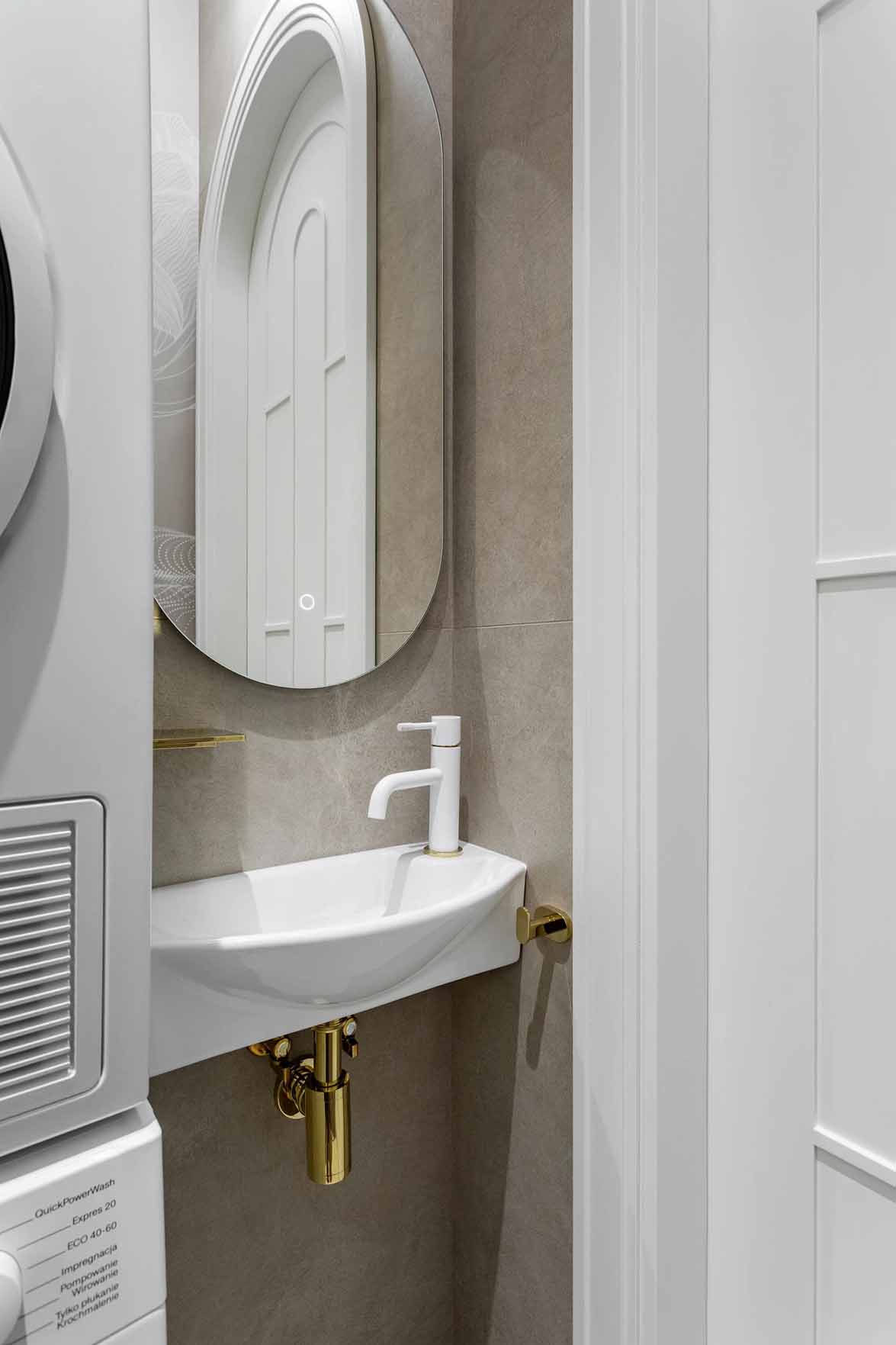 A lakásban három vizesblokk található. A vendég WC az előszobából nyílik, falait márvány és halvány kékes, szürkés tónusok díszítik. Itt helyezték el a mosó- és szárítógépeket is.