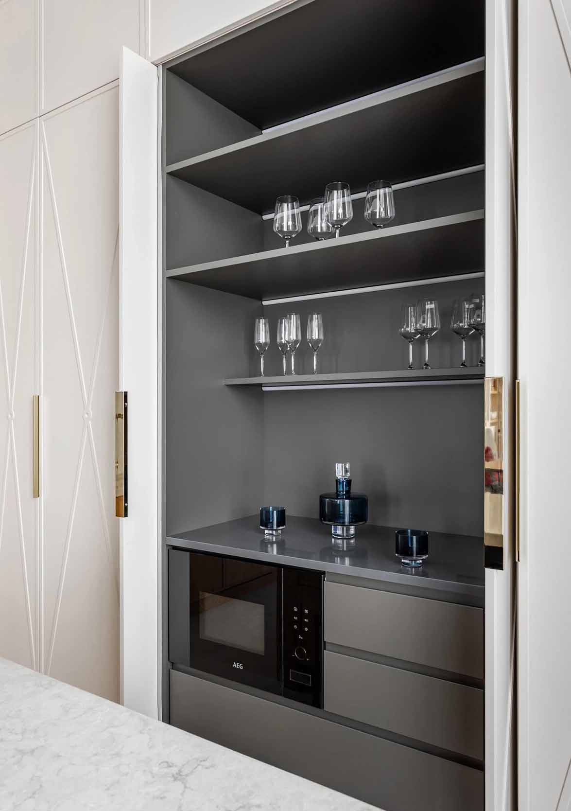 Az étkező közvetlenül a nappali és a konyha között helyezkedik el, vizuális hidat képezve a két funkció között. A konyha kialakítása a „vizuális zaj” minimalizálására törekszik: a konyhai gépek és eszközök nagy része eltolható ajtók mögé rejthető, így a konyha inkább a társasági tér elegáns folytatásának tűnik. A térben csak a konyhasziget marad hangsúlyos, amely inkább hat egy finoman kidolgozott bútordarabnak, mintsem konyhai munkafelületnek.