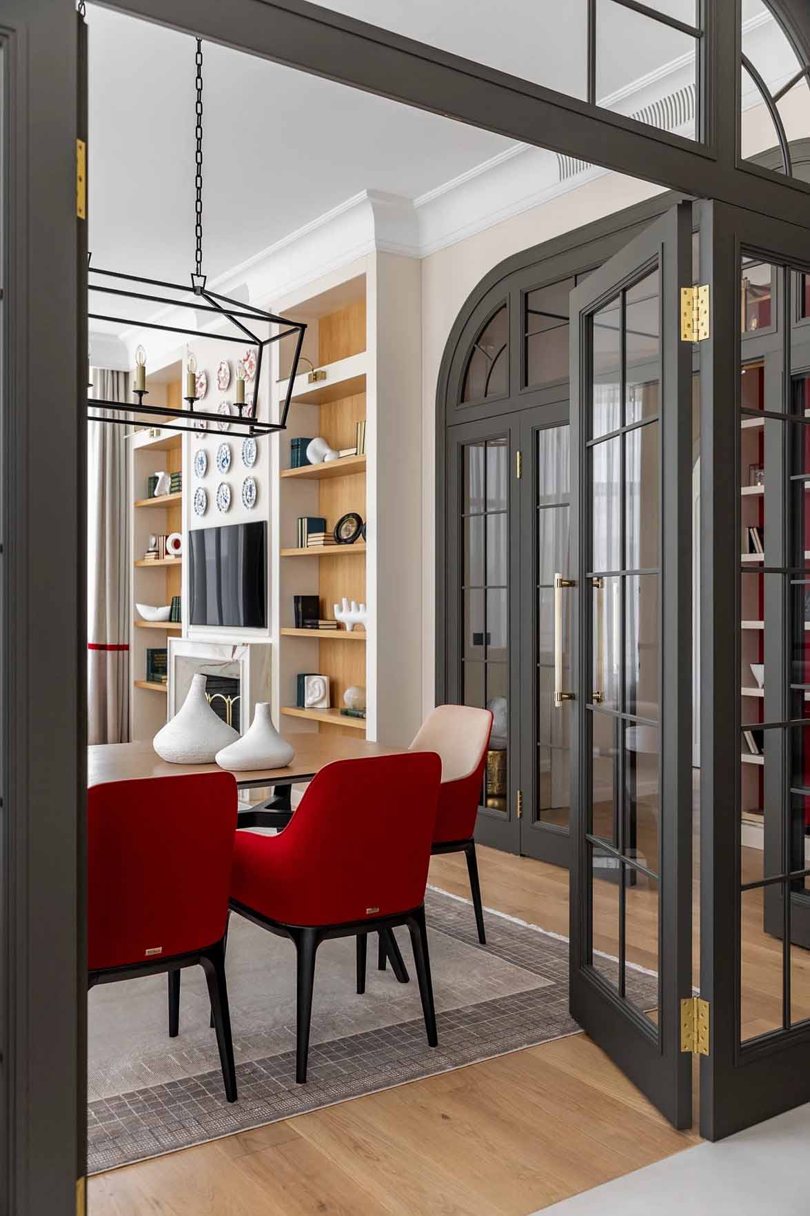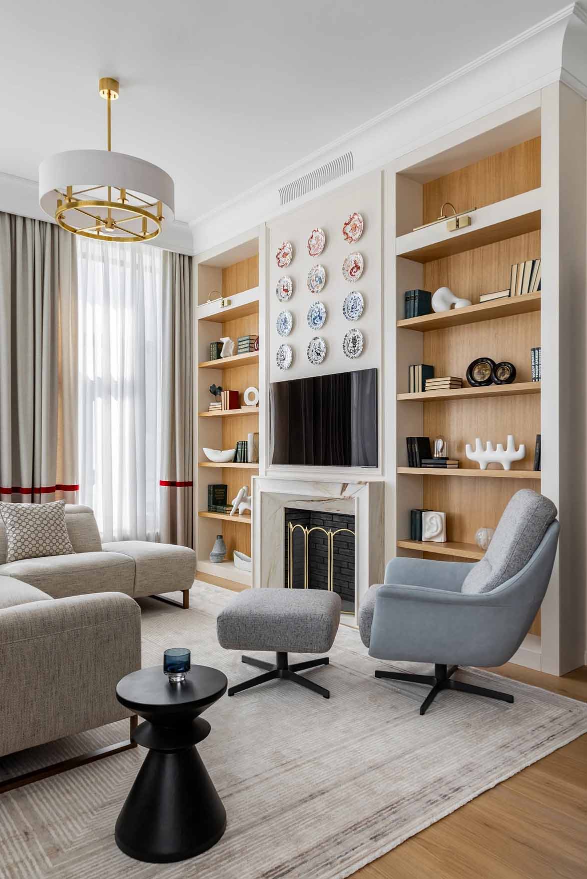 A lakás szíve a napfényben úszó nappali, két oldalon ablakokkal. A helyiség kompozíciós középpontja egy neoklasszikus stílusú, márványkeretes kandalló, amely ünnepélyességet és kölcsönöz a térnek. A bútorok – a kanapé vonalvezetése, a függönyök esése és az íves könyvespolcok – mind a központi építészeti motívumot, az ívet ismétlik meg. A nappali padlóburkolata minőségi fa parketta, amely természetes textúrájával lágyítja az összképet.