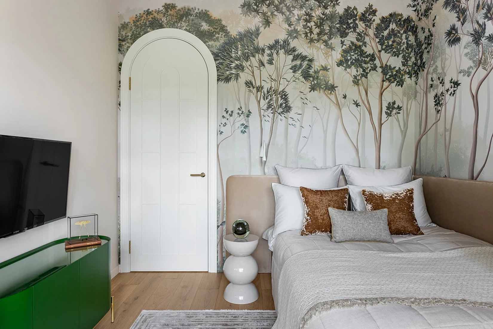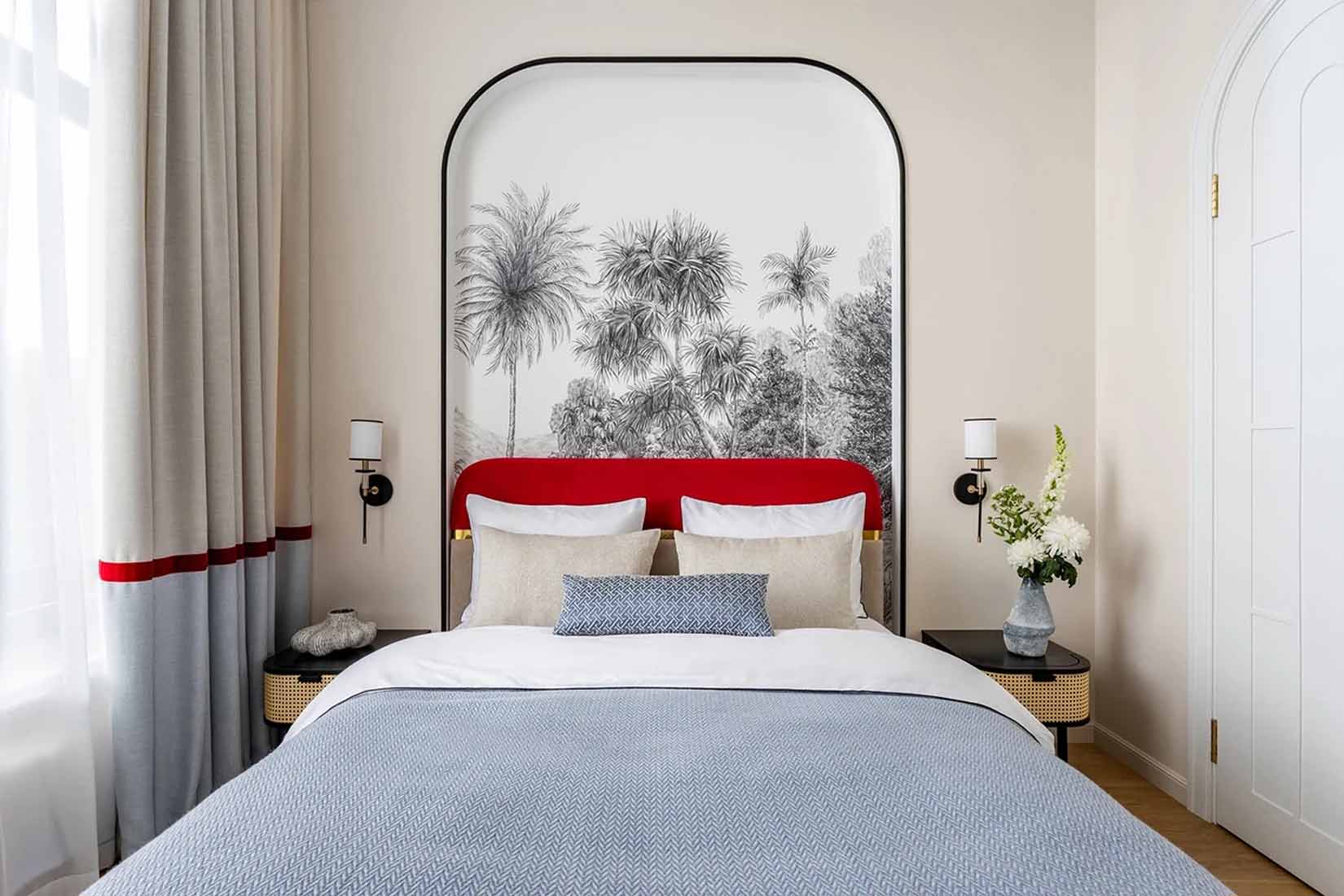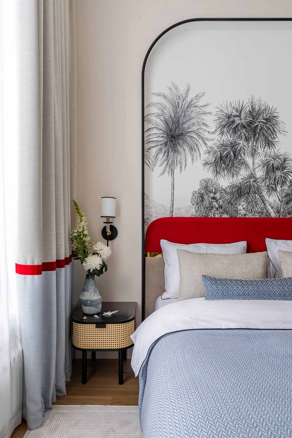 A hálószobában a nyugalom és a grafikus elegancia dominál. A falakat növényi motívumokkal díszített panelek borítják, a fejtámla mögötti falat pedig egy gipszkarton szerkezettel mélyítették be, így a franciaágy egy intim fülkébe kerül. Ez a fülke rejti a beépített világítást, a kapcsolókat és a csatlakozókat is. A dekorációhoz használt grafikus tapéták fekete vonalai visszaköszönnek a lámpatesteken és a textileken is, egységes esztétikai élményt nyújtva.