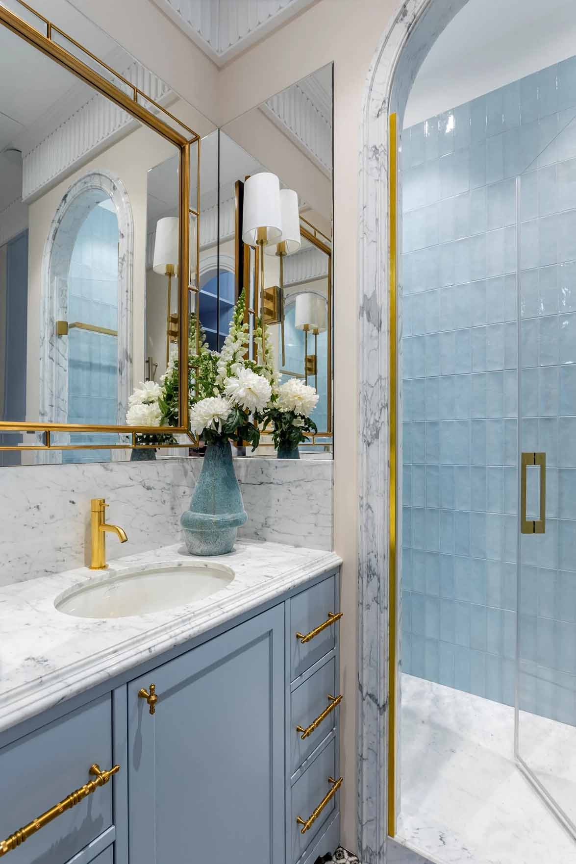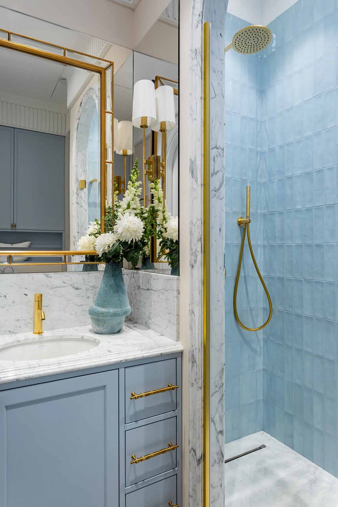 A lány szobájához tartozó fürdő igazi ékszerdoboz: Chinoiserie stílusú tapéta, fűzöld színű komód és rózsaszínes árnyalatú bézs csempék alkotnak benne romantikus, nőies egységet.