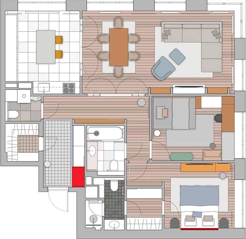 Az ingatlan eredetileg egy válaszfalak nélküli, üres tér volt, ami lehetővé tette, hogy a tervező teljesen a lakók igényeire szabott alaprajzot hozzon létre. A cél egy tiszta és logikus struktúra kialakítása volt. A lakás két fő részre oszlik: egy tágas, egybefüggő közösségi zónára és egy privát hálószobai blokkra. A térszervezés egyik legfontosabb eleme, hogy az előszobából nyíló folyosóról látványos, kétszárnyú íves ajtókon keresztül lehet bejutni a nappaliba, így a természetes fény mélyen behatol a lakás belső részeibe is. A privát zónákban a gyerekszobához is külön fürdő tartozik, a szülői hálóból pedig egy gardróbon keresztül közvetlen út vezet a saját fürdőszobába, elkerülve ezzel a felesleges folyosókat.