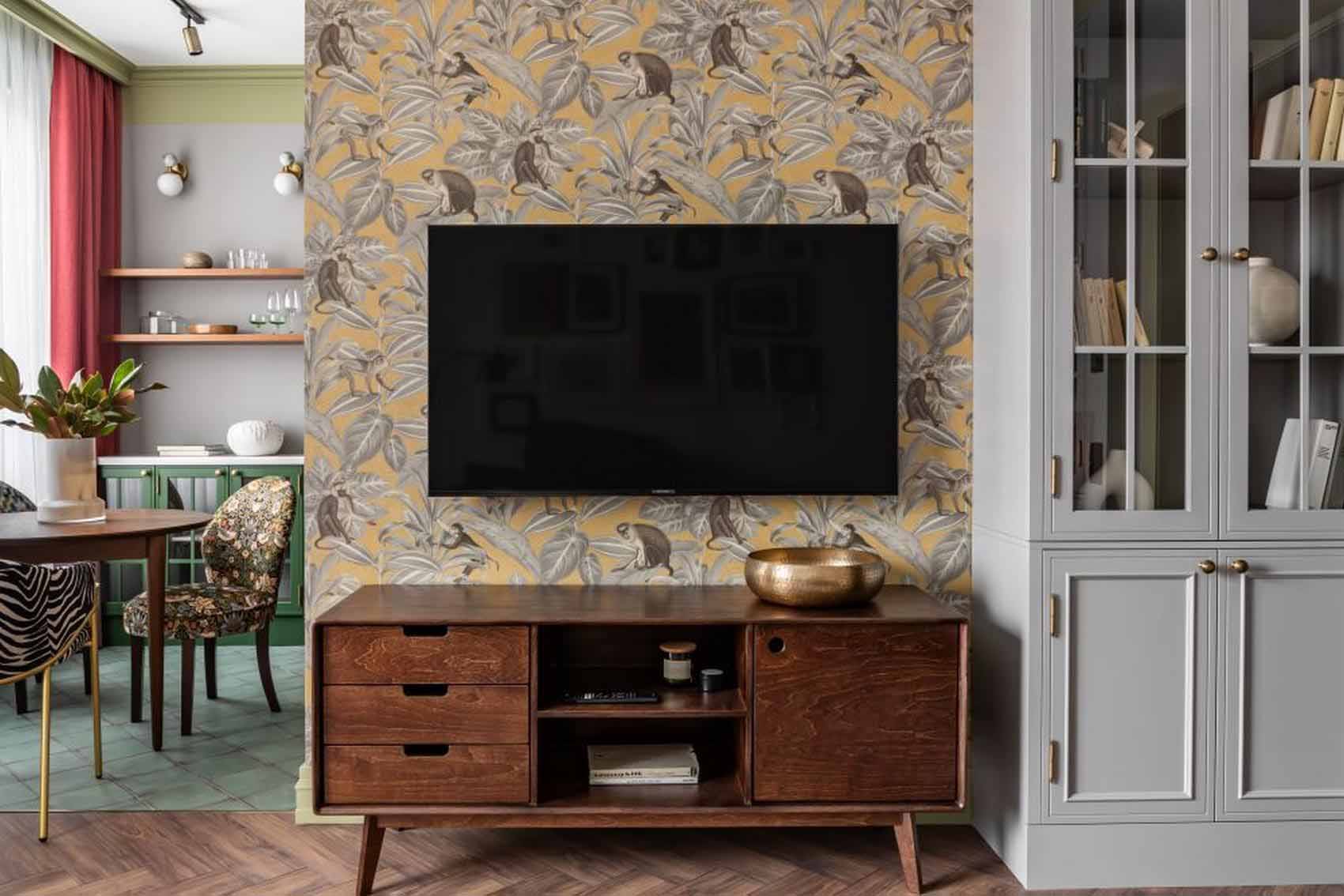 A nappali padlóját laminált parketta borítja, falain pedig a festés és a tapéta kombinációja érvényesül. A televízió mögötti falfelületet egy felfedező-tematikájú, majommintás tapéta díszíti, amely játékosságot visz a térbe. A berendezésnél a 60-as évek stílusát idéző bútorokra esett a választás: a tévéállvány és a tálalószekrény is ezt a vintage esztétikát képviseli. A tervezők tudatosan kerestek olyan minőségi, de elérhető árú gyártót, aki képes volt visszaadni a korszak hangulatát anélkül, hogy az az egyedi gyártású dizájnbútorok költségeit igényelte volna.