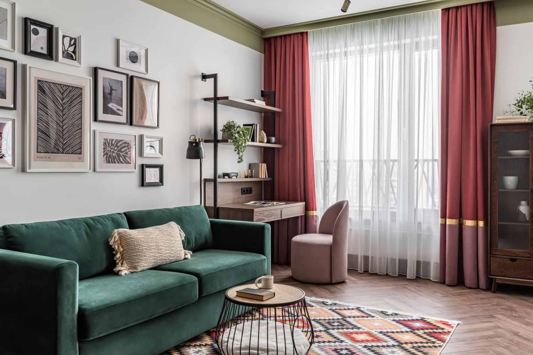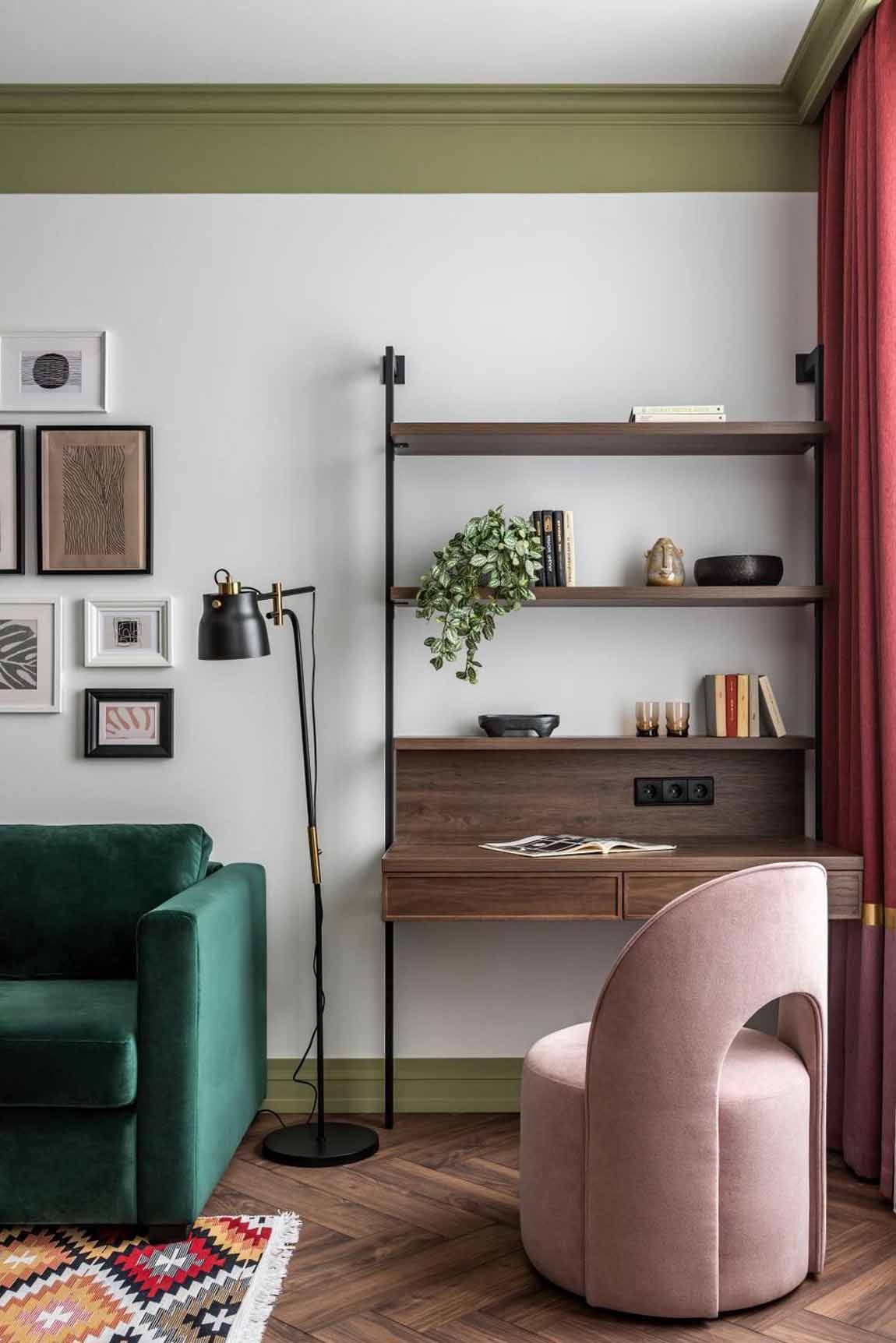 A vibrálóan életteli és karakteres enteriőr egy grafikusként dolgozó, sokat utazó fiatal hölgy igényei szerint lett berendezve. A cél egy olyan nem mindennapi, színes élettér kialakítása volt, amely egyszerre alkalmas baráti összejövetelekre és a meghitt, nyugodt esték eltöltésére. Kiemelt szempont volt továbbá, hogy a lakás elegendő helyet biztosítson a külföldi utakról hozott szuveníreknek, könyveknek és a tulajdonos különleges gyűjteményeinek.
