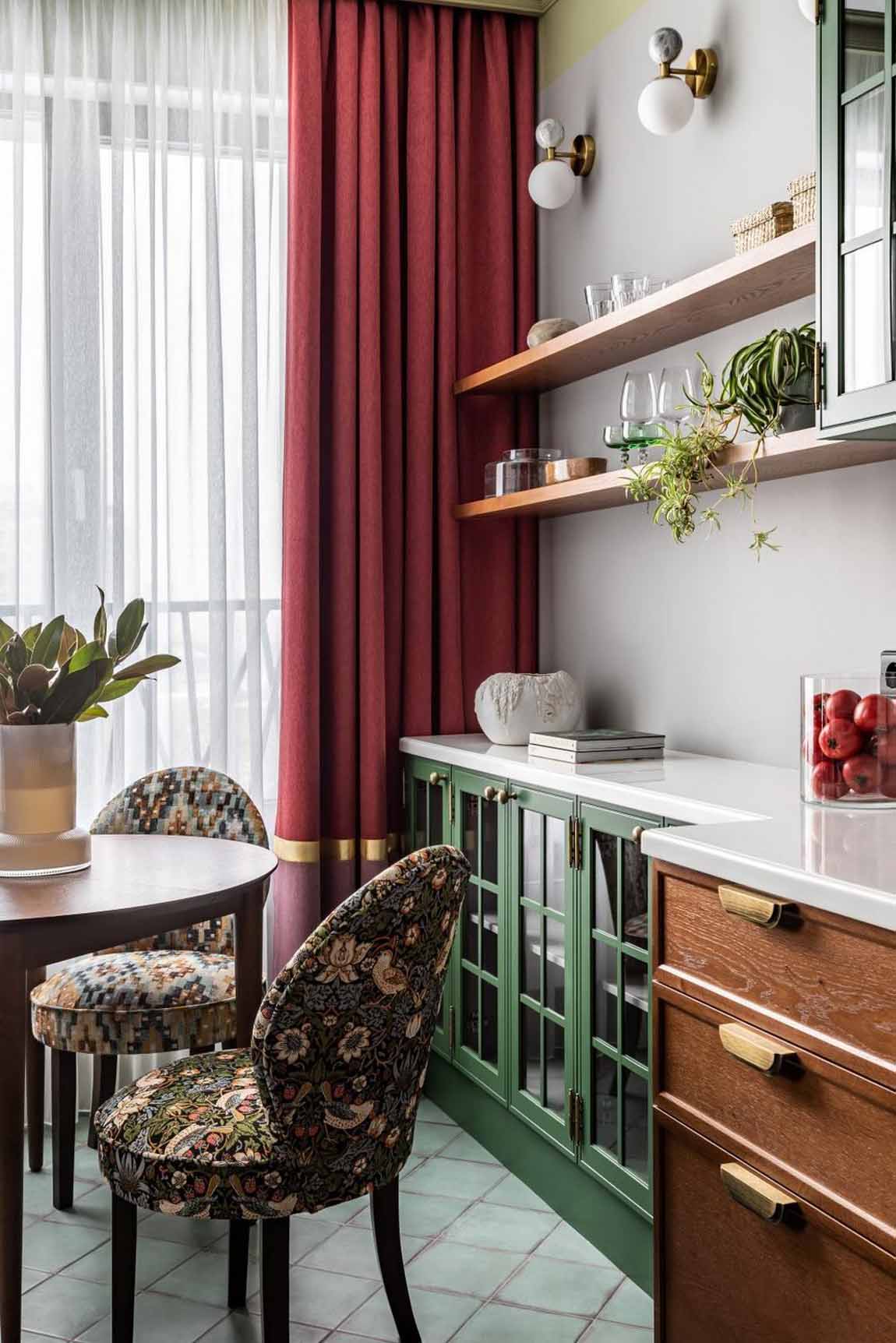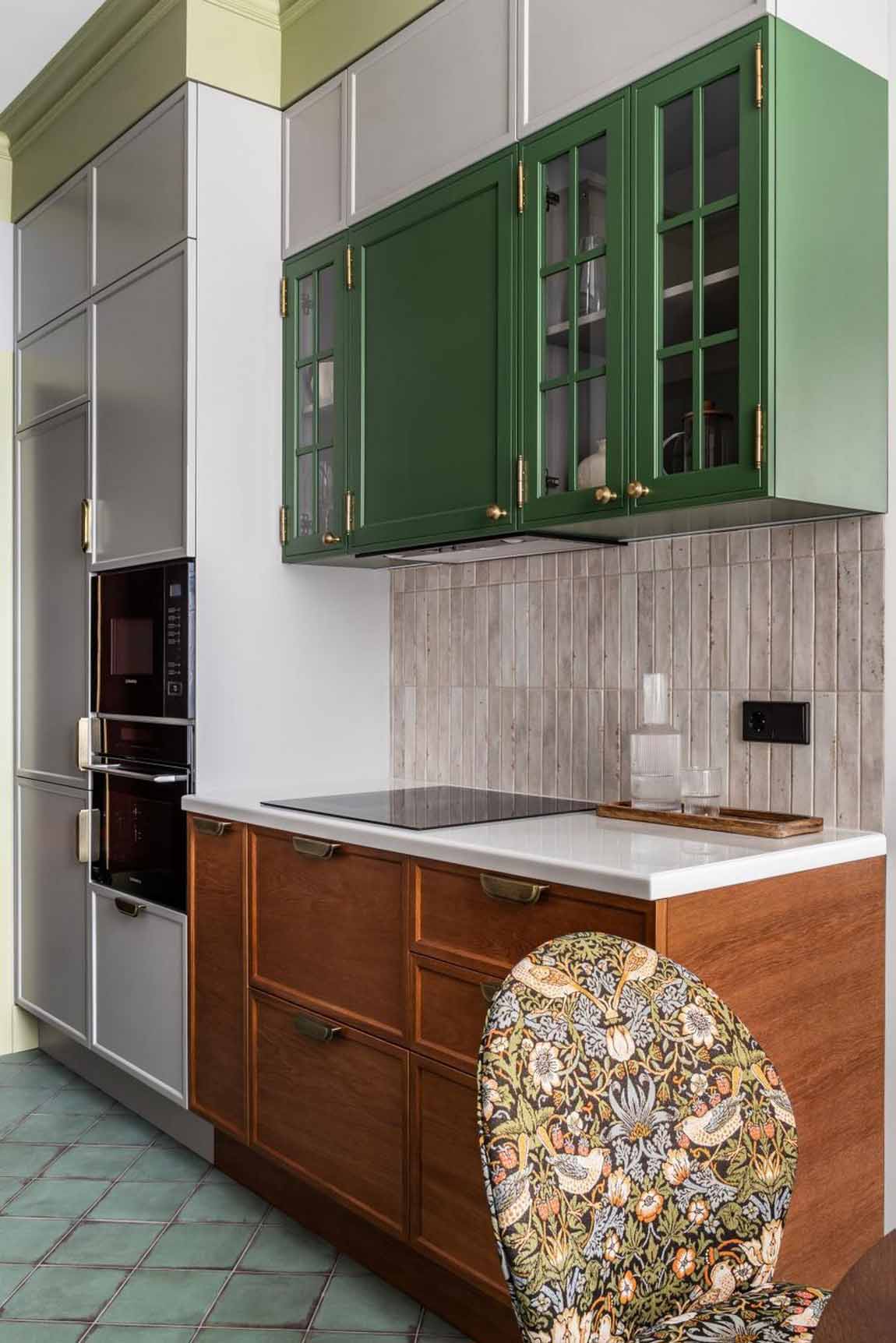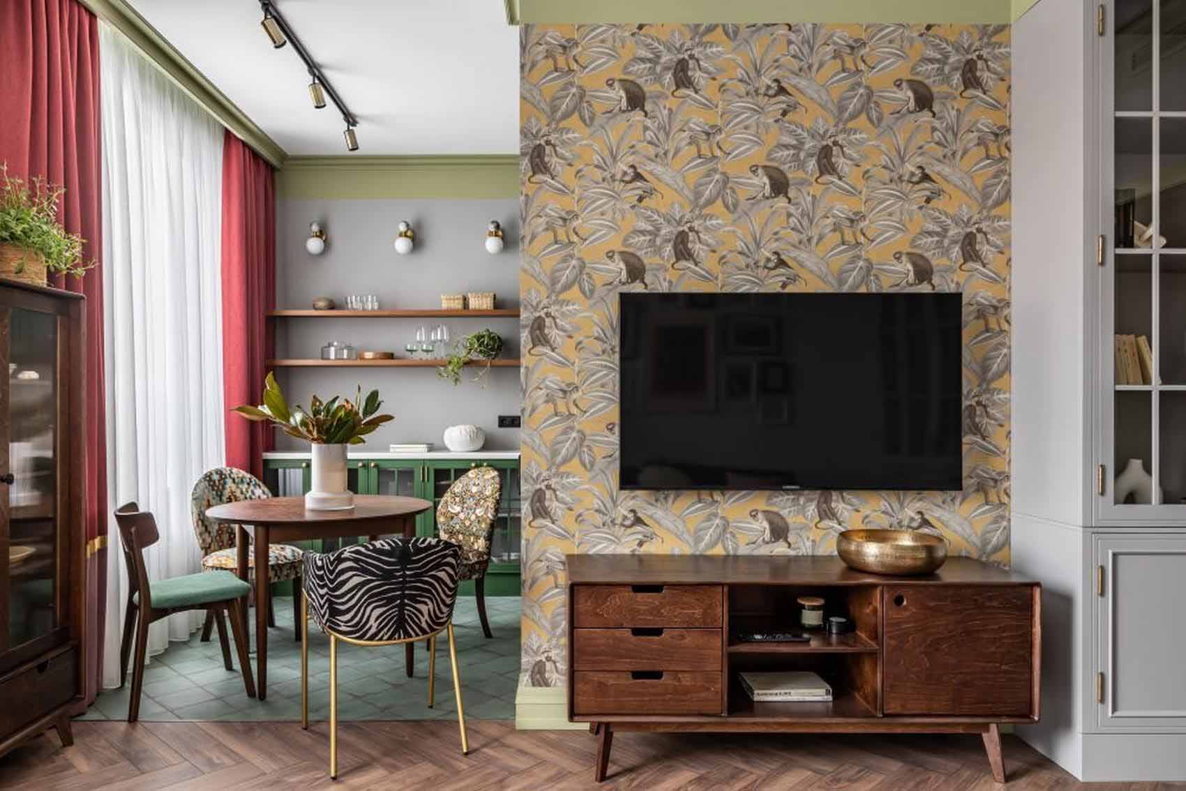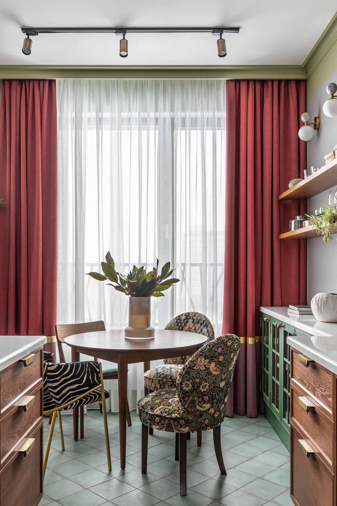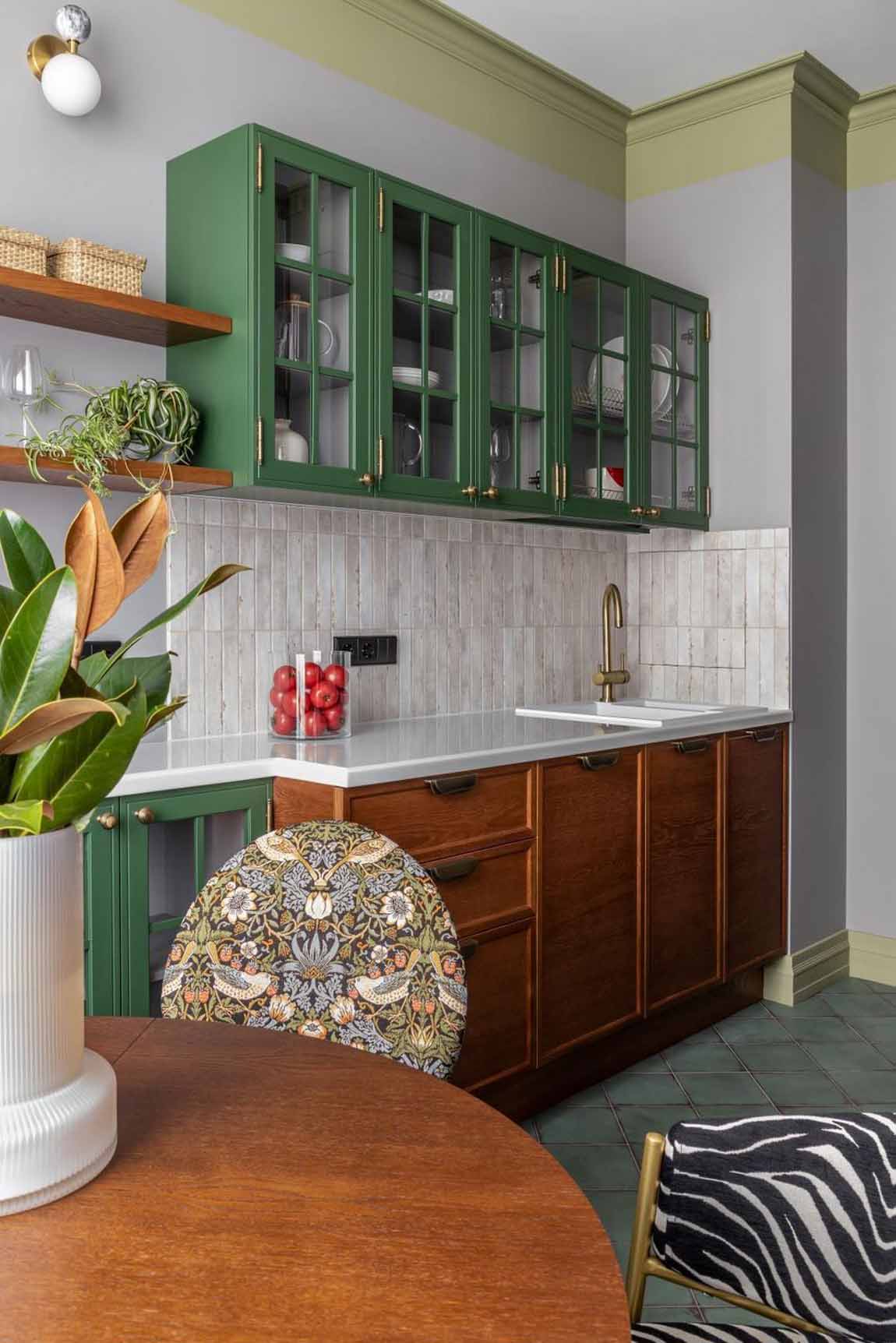 Az étkező zóna a lakás egyik legizgalmasabb pontja a változatos kialakítású székeknek köszönhetően. A kompozícióban helyet kapott két azonos formájú, de eltérő mintázatú darab – az egyik absztrakt, a másik virágmintás kárpittal –, valamint egy zöld ülőfelületű fa szék, amely rímel a konyha színeire. A karakteres, zebracsíkos mintájú szék egyedi darab, amely hangsúlyos akcentusként koronázza meg a teret.