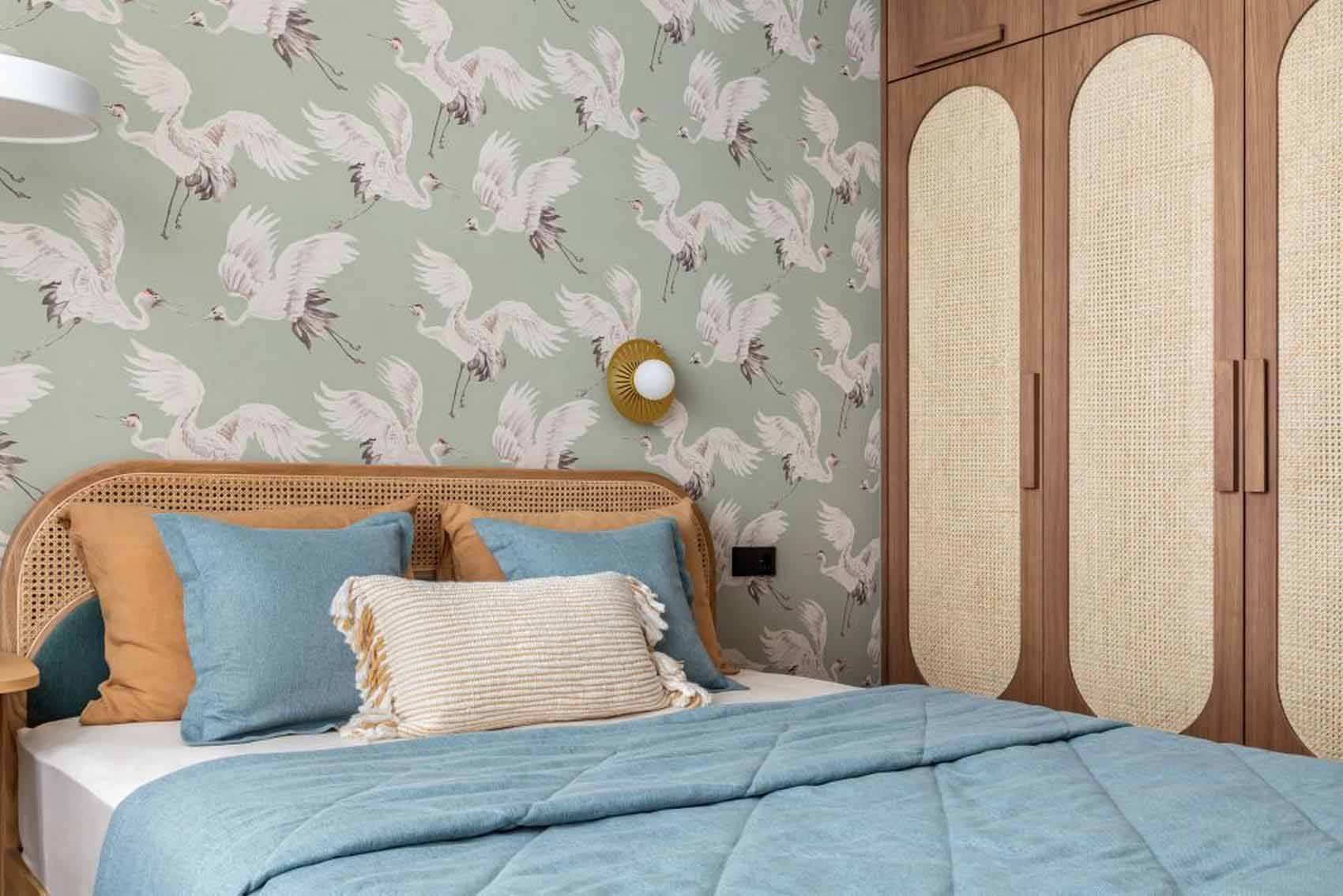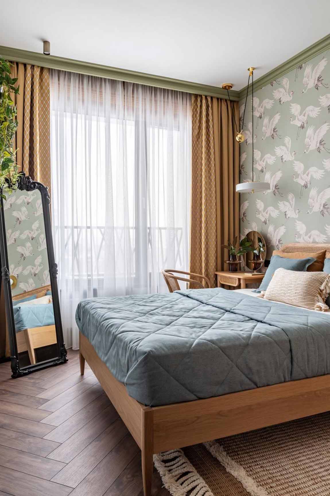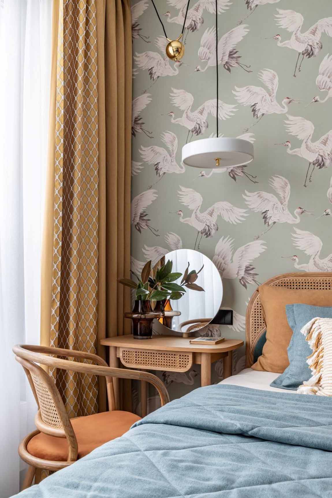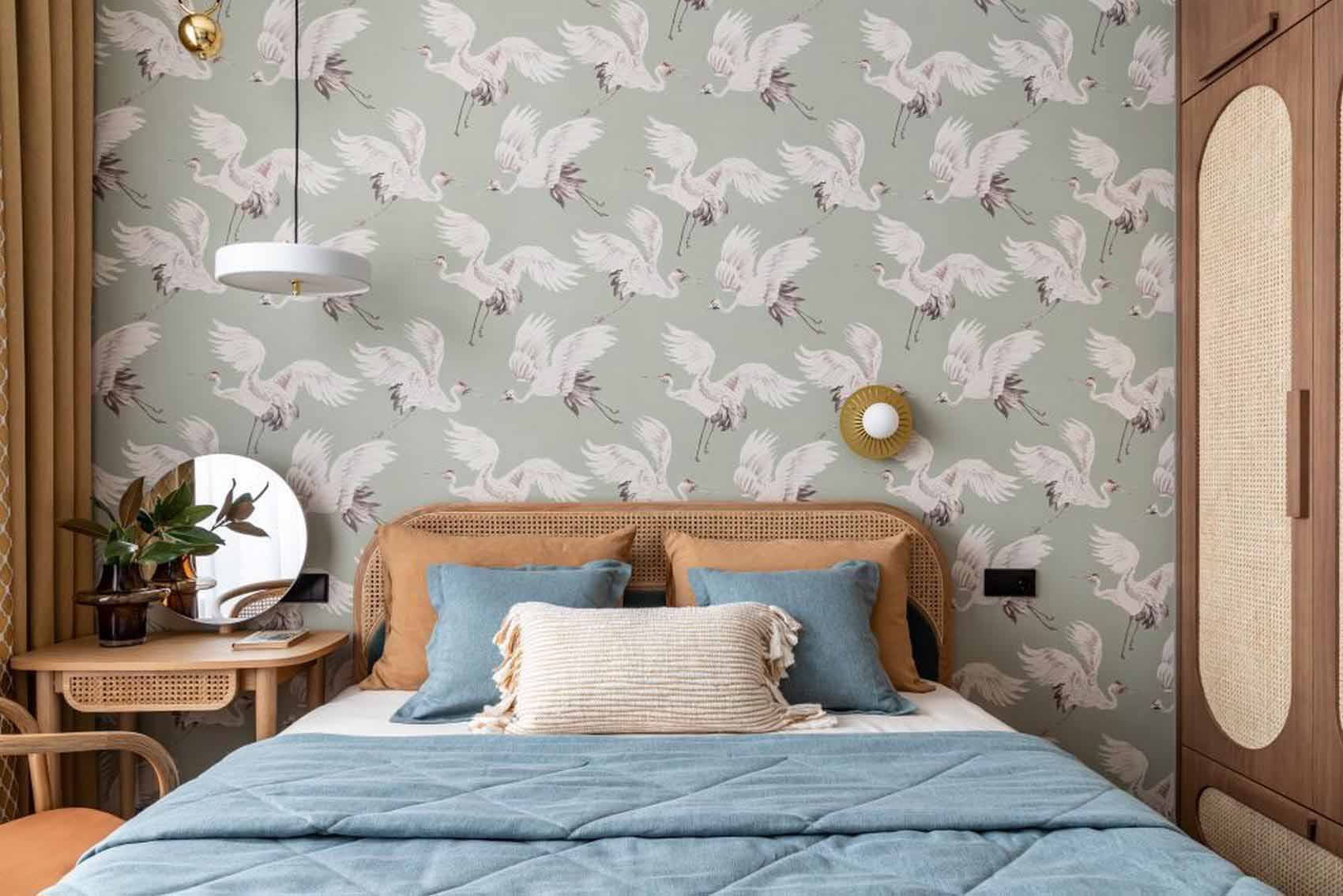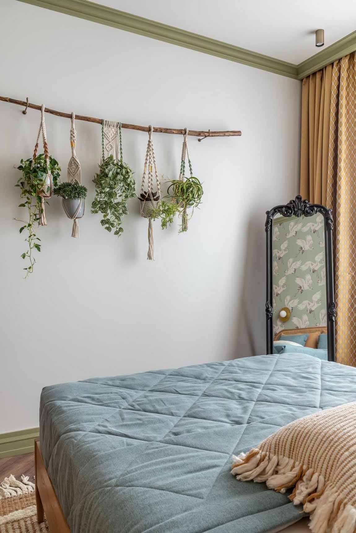 A hálóban folytatódik a nappaliban megkezdett stílus: a padlón laminált burkolat, a falon pedig egy darvakat ábrázoló falfestmény (freskó-szerű tapéta) látható az ágyfejvég mögött. Ebben a helyiségben tudatos döntés volt a televízió elhagyása. Helyette egy természetközeli dekorációs megoldást alkalmaztak: a falra egy erdőben talált faágat rögzítettek textilboltban vásárolt konzolokkal, amelyre kézzel csomózott makramé kaspók kerültek. A kaspók színeit és formáját hosszas egyeztetés során hangolták a szoba árnyalataihoz, megteremtve a teljes vizuális harmóniá