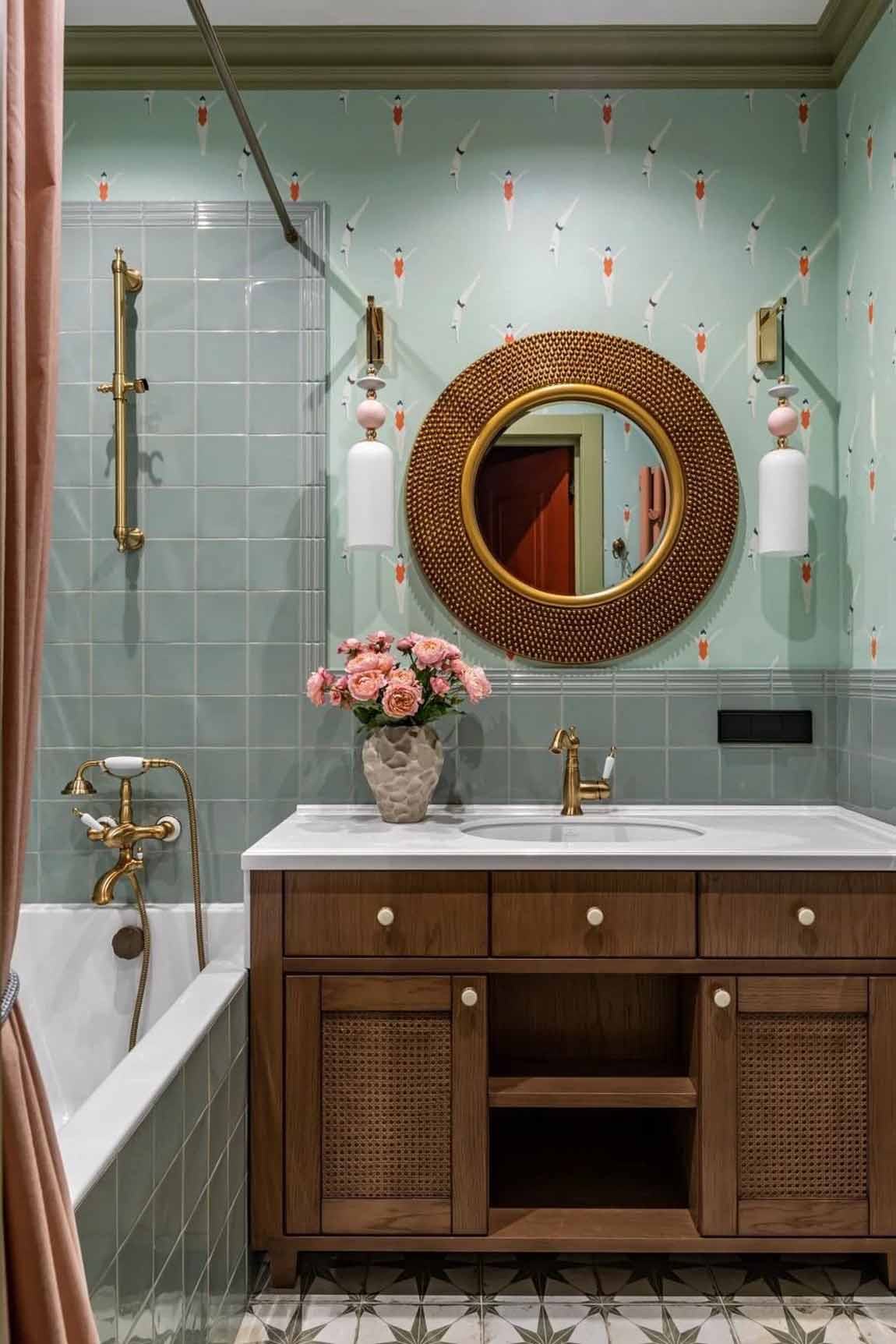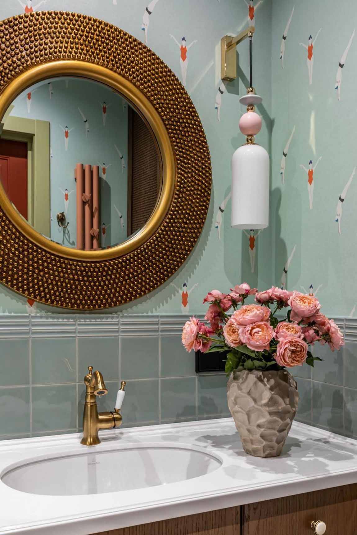 A vizesblokk stílusa szorosan kapcsolódik a lakás többi részéhez, szintén a mediterrán életérzést közvetíti. A falakon kézműves hatású, egyenetlen szélű, mázas kisméretű csempéket használtak, amelyeket a felsőbb szakaszokon nedvességálló tapétával kombináltak. A domináns menta színt rózsaszín részletek – a törölközőszárító, a falikarok elemei és a függöny – ellensúlyozzák, friss és üde kontrasztot alkotva.