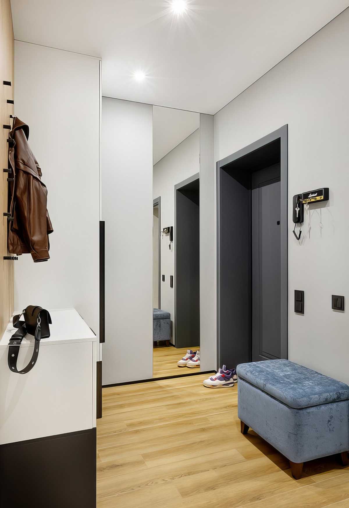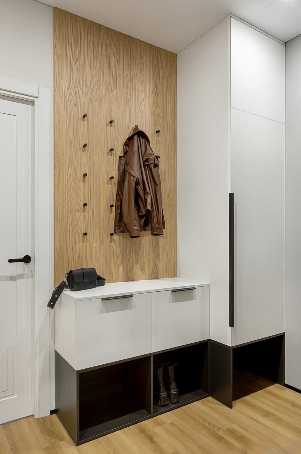 A bejárati ajtó belső burkolata a beltéri ajtókéval megegyező dizájnt kapott, a kávák pedig sötét, strapabíró borítást a mindennapi használat megkönnyítésére. A padlót itt, ahogy a többi lakóhelyiségben is, ellenálló vinyl burkolattal látták el. A tárolást egy bejárattal szemben elhelyezett keskeny gardróbszekrény és egy cipős szekrény oldja meg. Utóbbi alsó része nyitott polcos kialakítású, amely kényelmes helyet biztosít a lábbeliknek és a robotporszívónak, míg felette egy falra szerelt, akasztós panel kapott helyet.