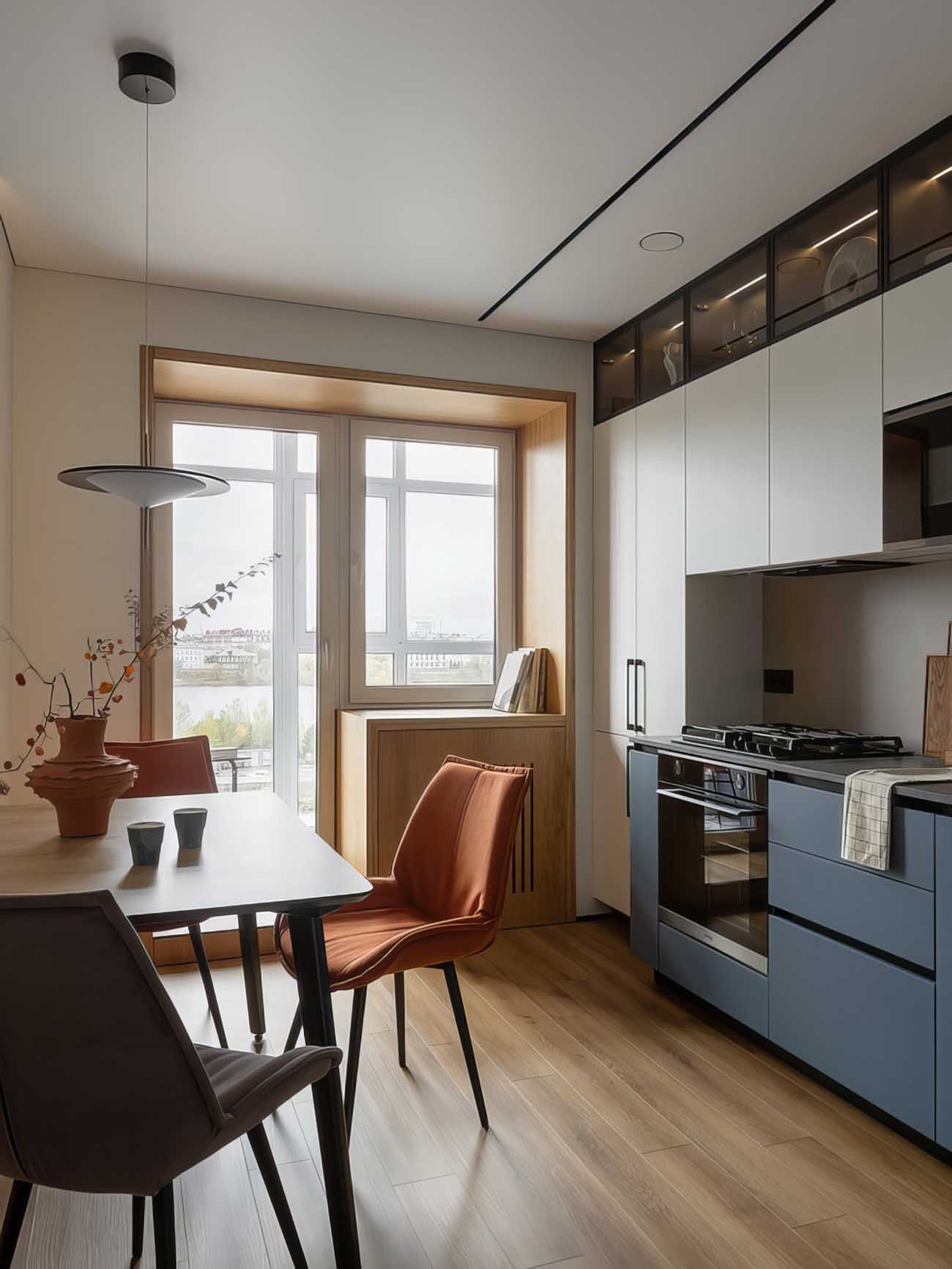 A sarokelrendezésű konyhabútor felső szekrényei egészen a mennyezetig érnek. A legfelső, üvegajtós tárolórészt belső világítással látták el, amely a munkalap feletti rejtett LED-fényekkel és az étkezőasztal feletti függőlámpával együtt többféle világítási variációt tesz lehetővé. Az ablak melletti szekrény csökkentett mélységű, hogy pontosan illeszkedjen a nyíláshoz, diszkréten elrejtve a gázcsövet és a mérőórát. A letisztult összképet a teljesen beépített hűtőszekrény, sütő és mosogatógép teszi teljessé. A komfortérzetet ezen a területen padlófűtés növeli.