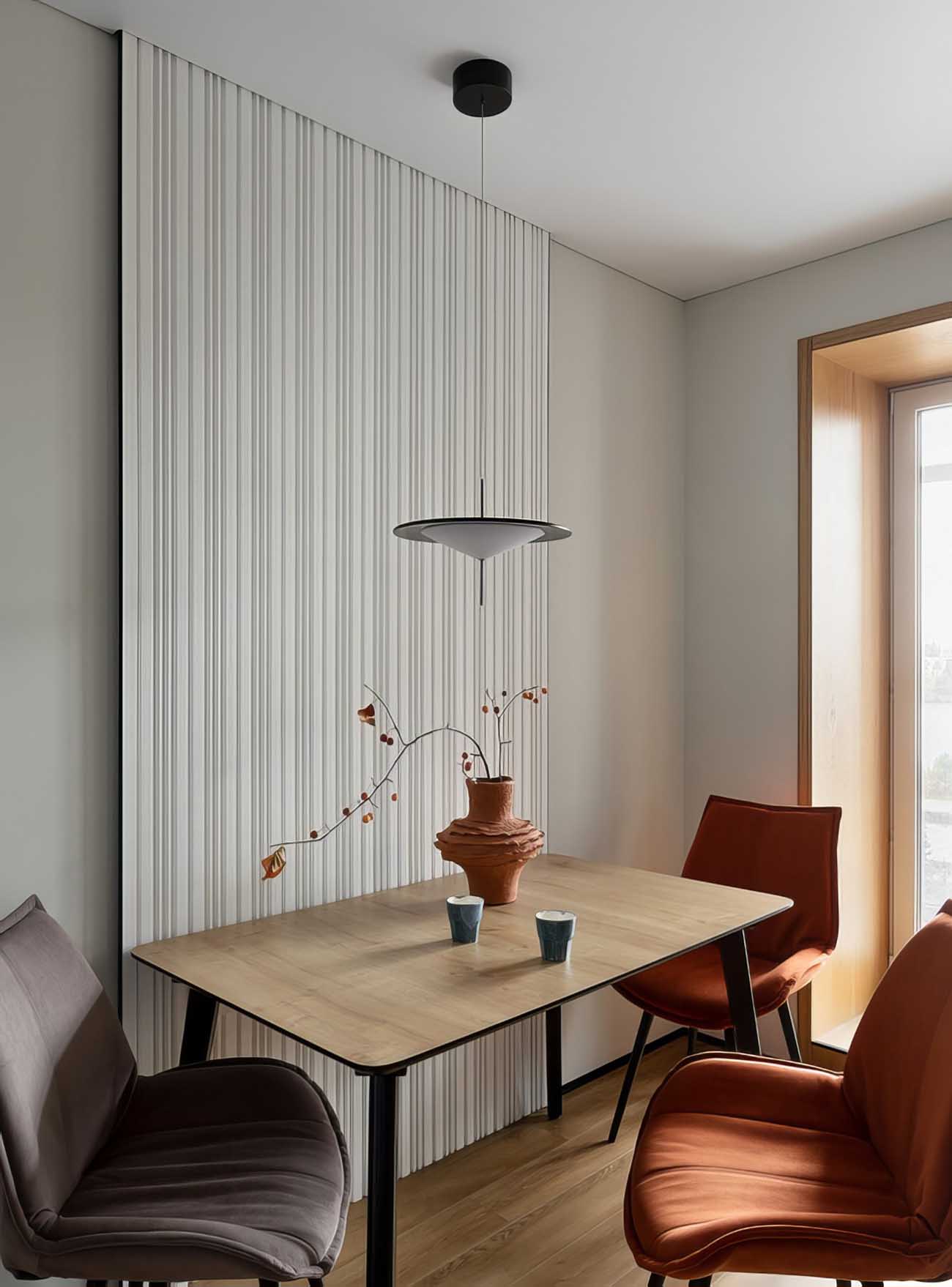 A konyhában az étkezőasztal melletti falat izgalmas, térhatású panelekkel emelték ki.