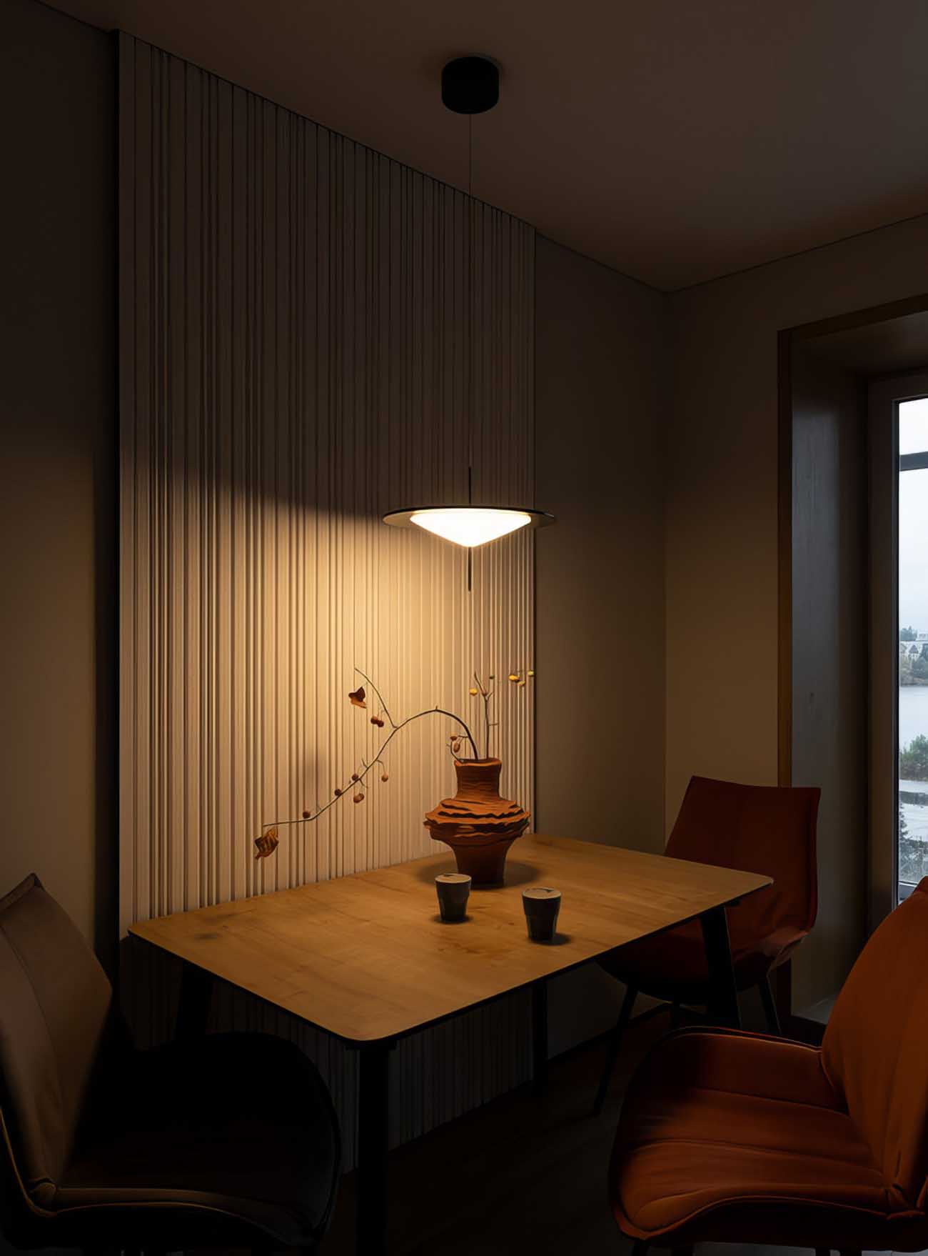 A 64 négyzetméteres lakás egy 2000 után épült társasházban található. Az eredeti alaprajz egy különálló hálószobát, átjárható nappalit, konyhát, fürdőszobát, egy kis méretű külön mosdót és egy tárolóhelyiséget foglalt magában. A hálószobából és a konyhából is nyílik egy-egy erkély, ahonnan zavartalan kilátás nyílik a közeli tóra. A térszervezést nagyrészt megőrizték, csupán az előszoba és a nappali közötti ajtónyílást szüntették meg az egybenyitott, szellős hatás elérése érdekében. A lakás egészében a kortárs dizájnt erősítik a mennyezet síkjába simuló világítótestek és a diszkrét mikroszegélyek.