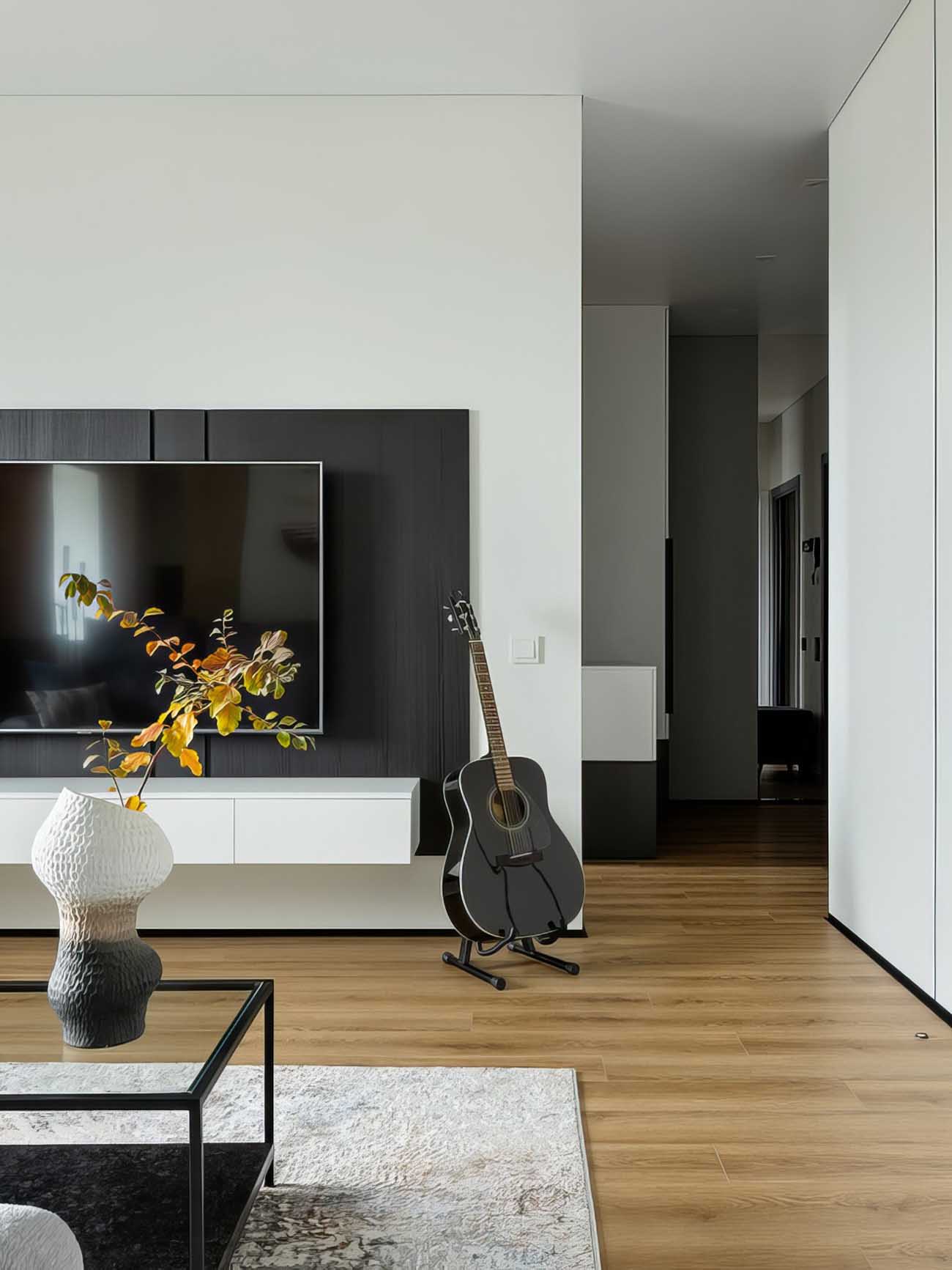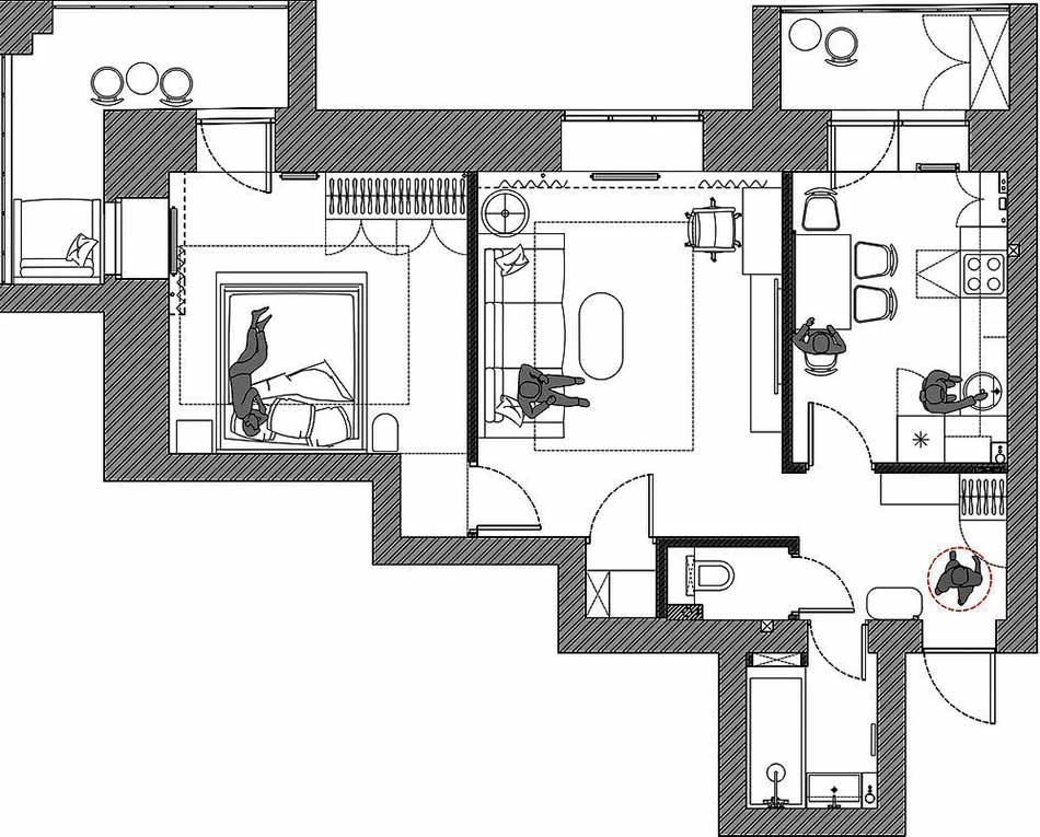 A felújítás egy aktív – futás, röplabda, snowboard – egyedülálló férfi számára készült. A cél egy elavult, 2000-es évekbeli enteriőr átalakítása volt a modern igényeknek megfelelően. A tervező feladata egy olyan otthonos, meleg hangulatú élettér létrehozása volt, amely reflektál a tulajdonos személyiségére, és elegendő tárolóhelyet biztosít a sportfelszerelések számára. Az alapvető stílusirányzat a tiszta építészeti vonalakkal és beépített bútorokkal operáló minimalizmus maradt, amelyet etno stílusú, természetes anyagokból készült, kézműves hatású dekorelemek tettek melegebbé.