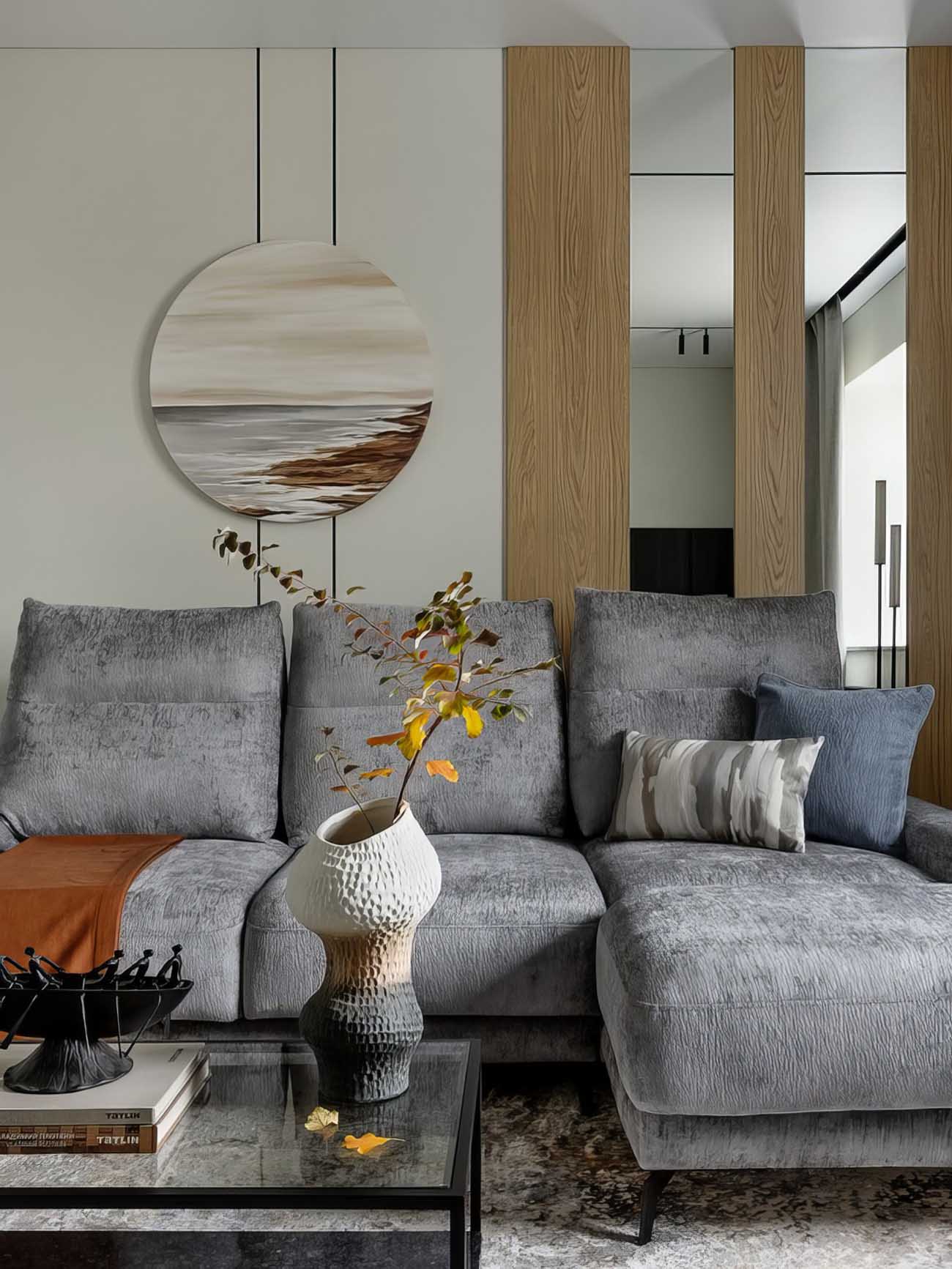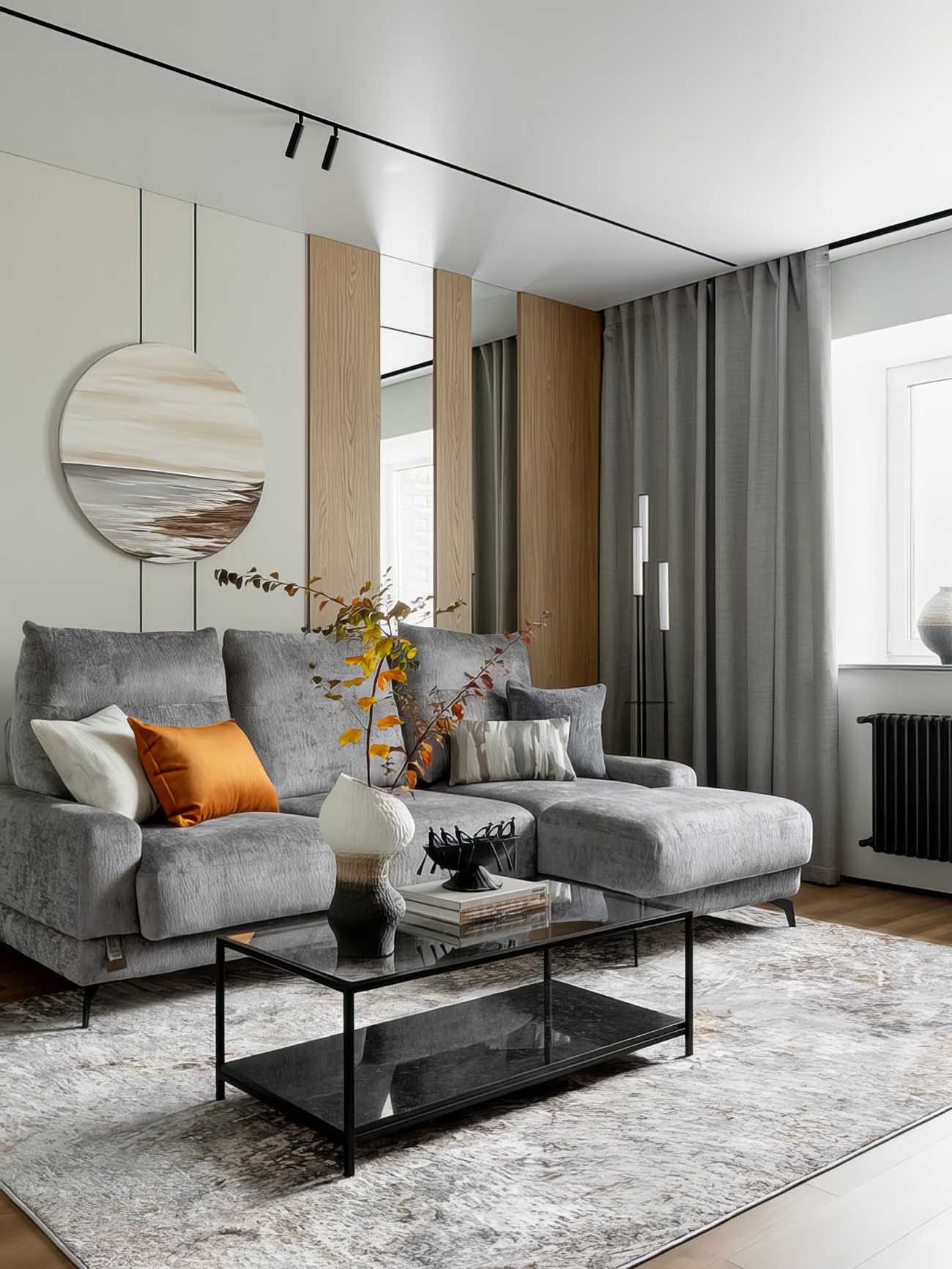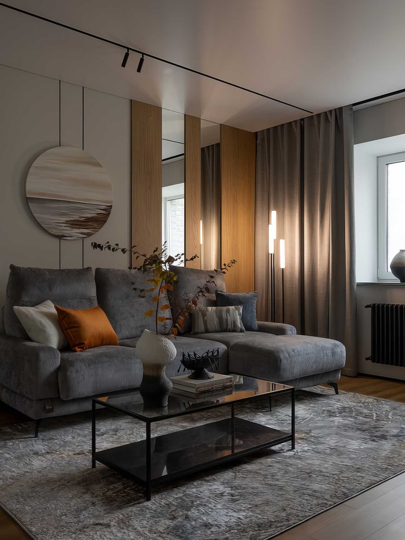 A nappali falain festett hatású tapétát alkalmaztak, amely távolról letisztult megjelenést nyújt, közelről viszont kellemes, szövethez hasonló textúrát mutat. A tér fókuszpontjait a fekete fémprofilok, a magas támlájú kanapé mögötti, tükörbetétes fa hatású panelek, valamint a szemközti fal sötét fa burkolata adják. Ez utóbbi zónában kapott helyet a televízió konzolja és a lebegő kialakítású íróasztal is, amely alatt szintén padlófűtés gondoskodik a kényelemről. Az általános világítást süllyesztett spotlámpák és beépített lineáris fényforrások adják, míg a munkaasztal fölé sínrendszeres, irányítható spotlámpák, a kanapé mellé pedig egy hangulatos állólámpa került.