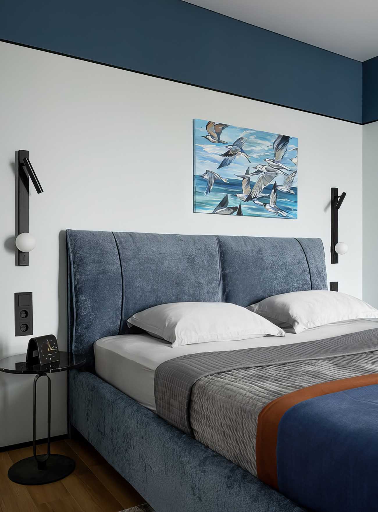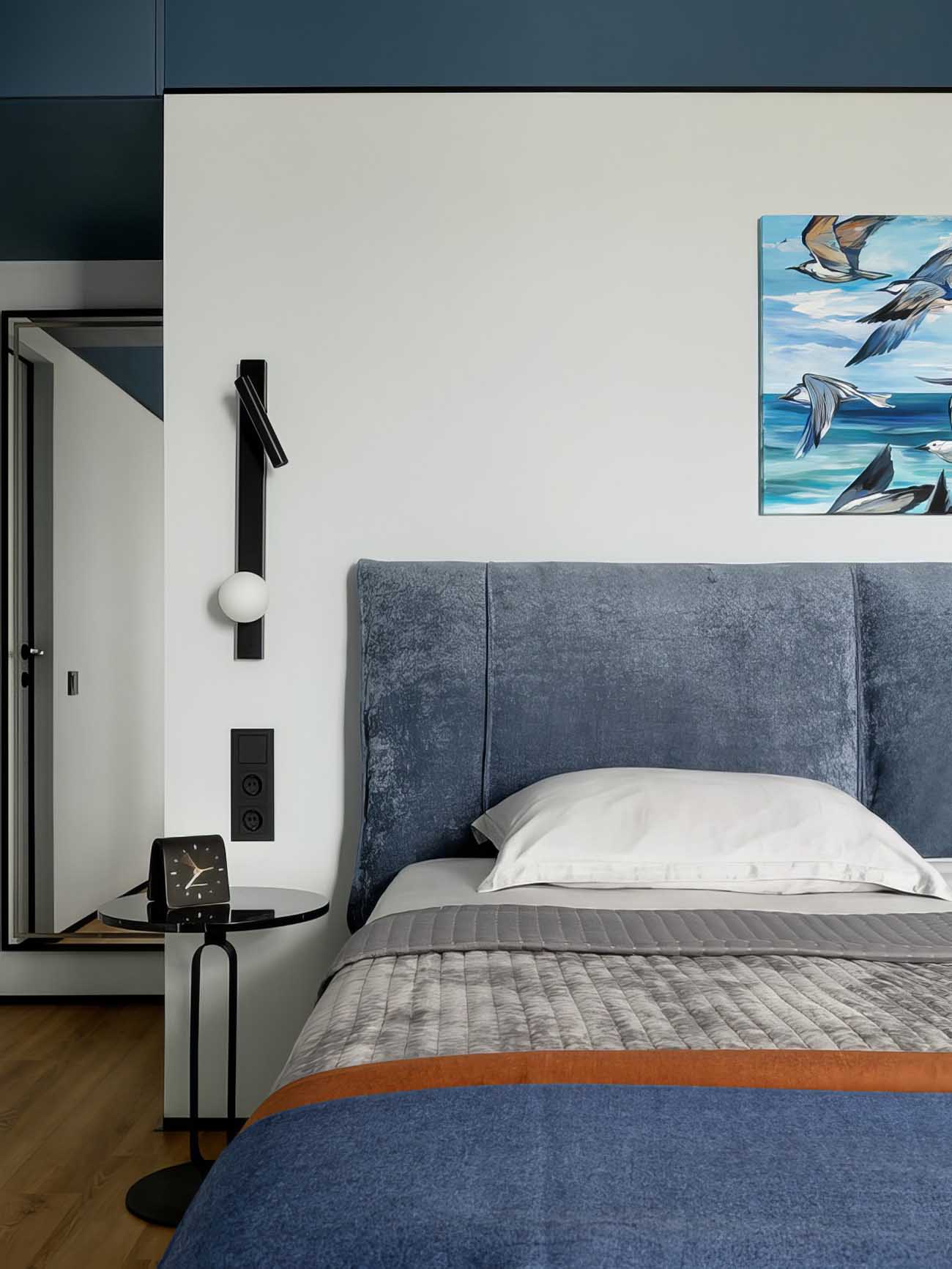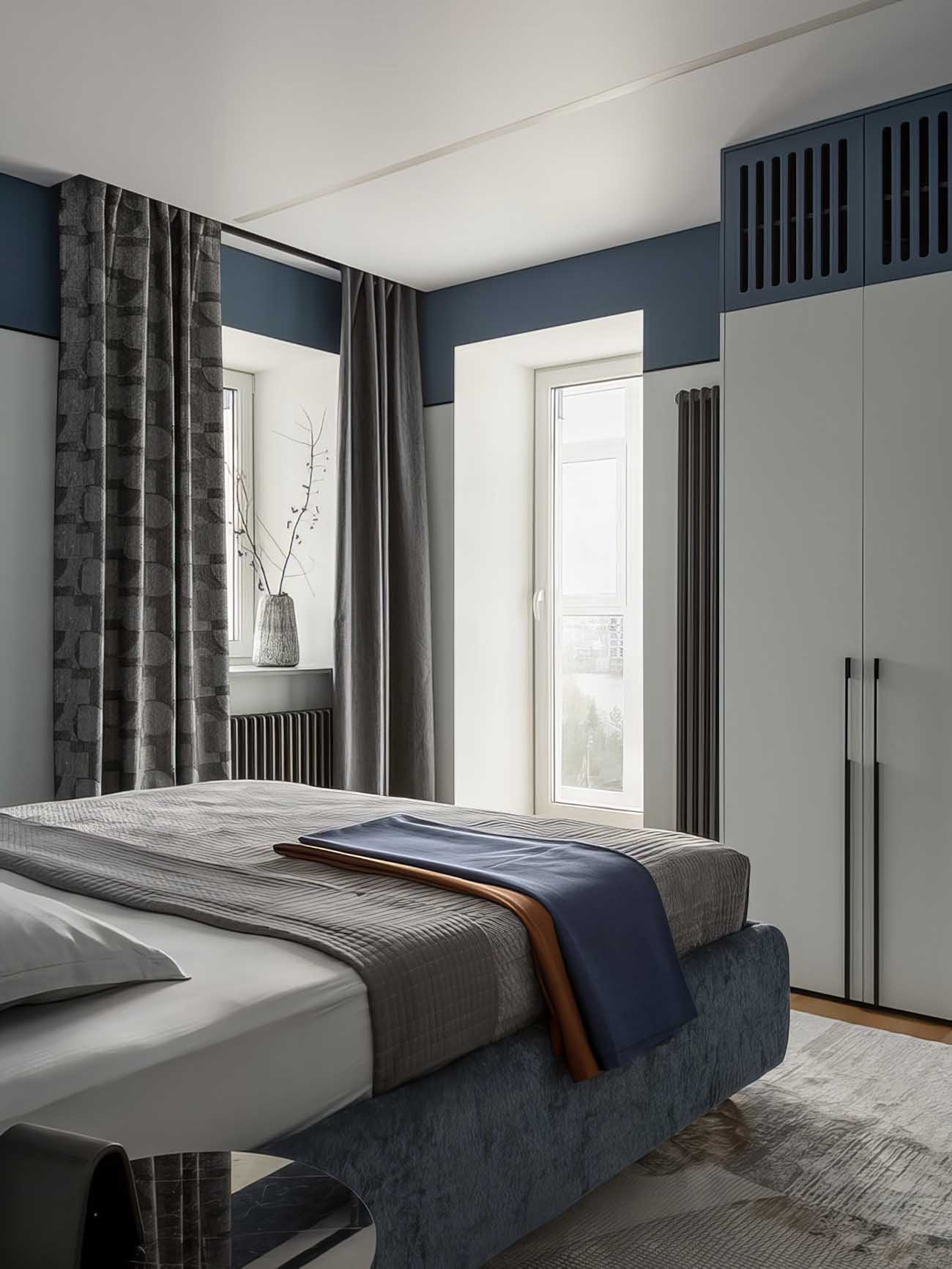 A hálószobában a világos tapétát a mennyezet alatt egy kék sávval kombinálták. Ez a vizuális trükk optikailag integrálja a bejárat felett kialakított galériás tárolót, amelyet a tulajdonos kifejezetten a sportfelszerelései számára kért. Az erkélyajtó mellett kapott helyet a ruhásszekrény, melynek felső, lamellás kialakítású ajtaja mögött a klímaberendezés beltéri egységét rejtették el, biztosítva a szabad légáramlást. A világításról a mennyezeti lámpák mellett az ágy két oldalán elhelyezett, kör alakú burával és irányítható spotokkal ellátott fali olvasólámpák gondoskodnak.