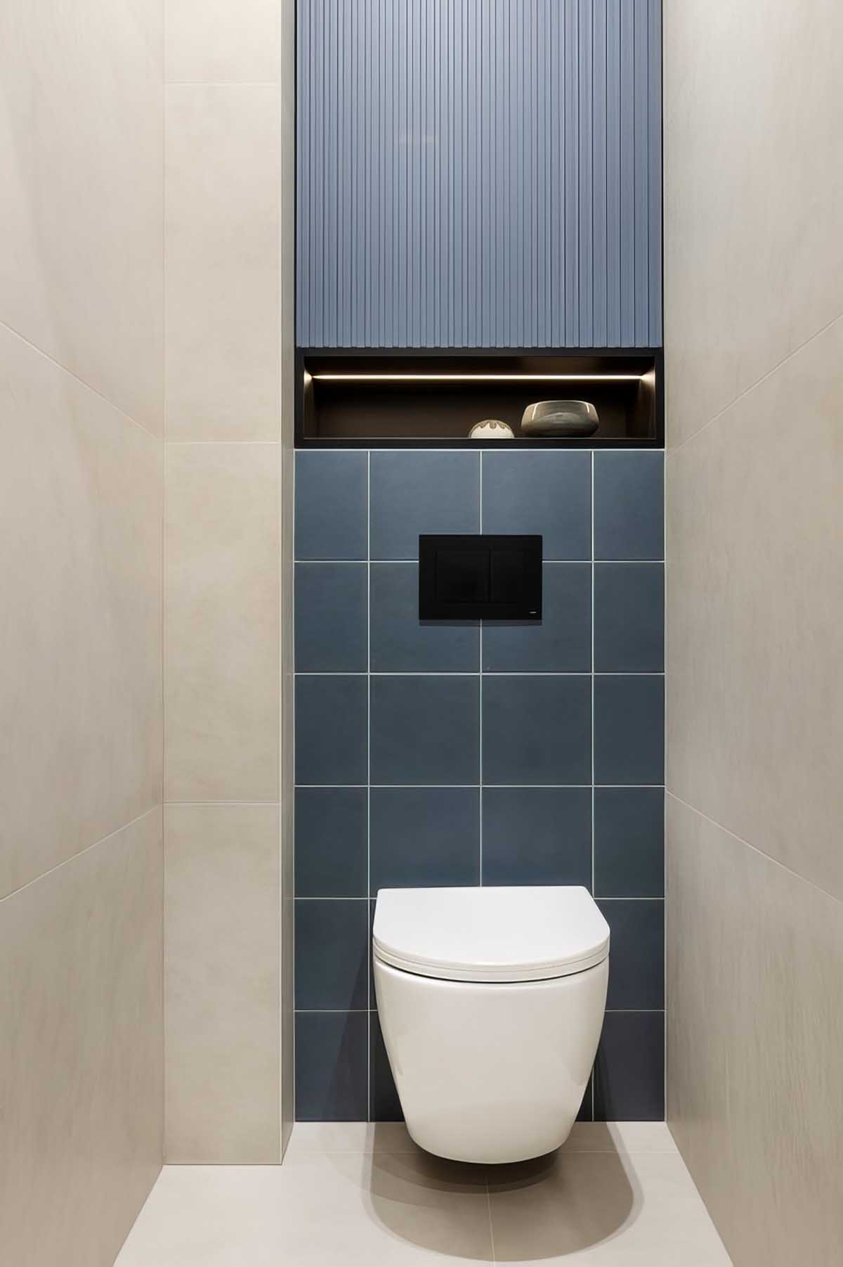 A fürdőszobában a kád és a mosdószekrény mögötti falat kék, négyzet alakú csempével burkolták, amelyet a mennyezet alatt egy körkörös mintájú, térhatású bordűr zár le. A többi falon és a padlón nagyméretű, bézs színű greslap található, amely a különálló mellékhelyiségben is visszaköszön. A toalett feletti beépített szekrény praktikusan rejti el a vízmelegítőt, míg a mosógép az eredeti alaprajzban is szereplő, különálló tárolóhelyiségbe került.