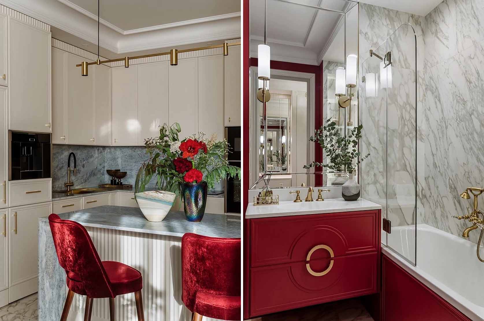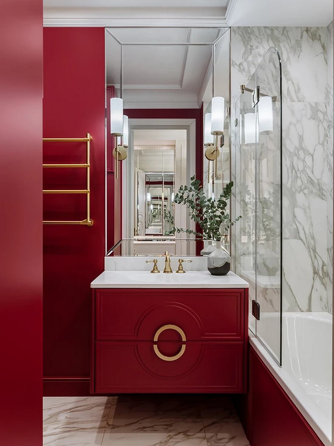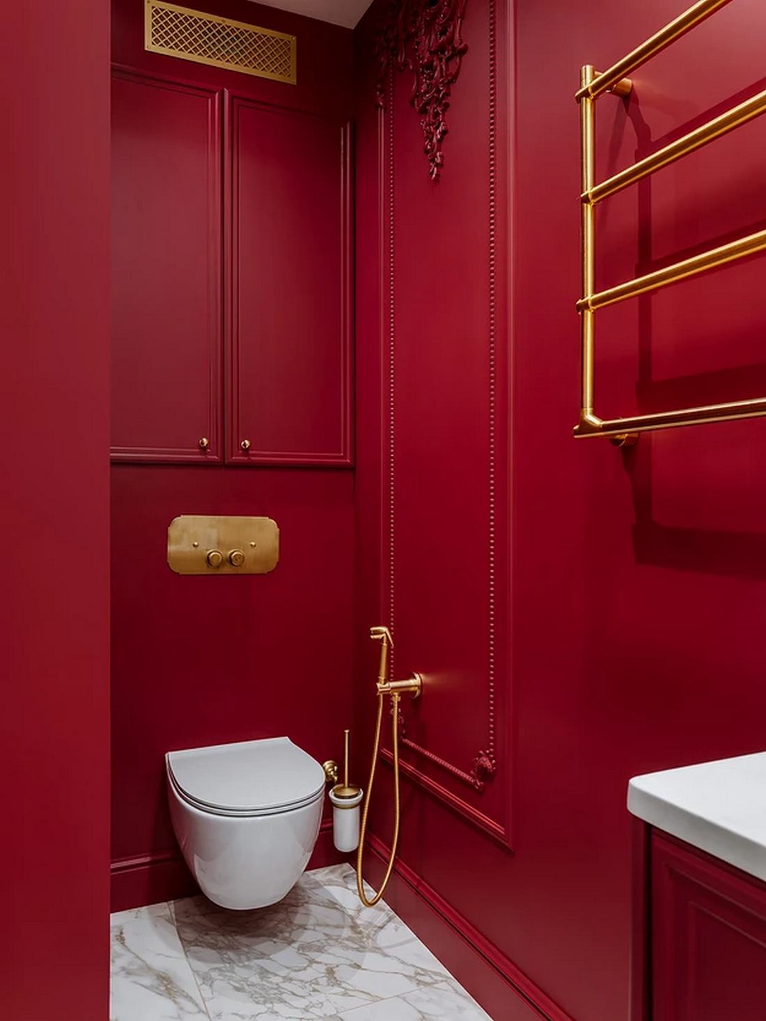 Míg a lakás többi részét a visszafogott elegancia jellemzi, a fürdőszobában a tulajdonos színek iránti vágya teljesedett ki. Itt egy dinamikus, élénkpiros árnyalat dominál a falfestésen, amelyet márványmintás kerámialapokkal kombináltak. A mosdószekrényt egyedileg gyártatták, hogy színe tökéletesen passzoljon a falhoz.