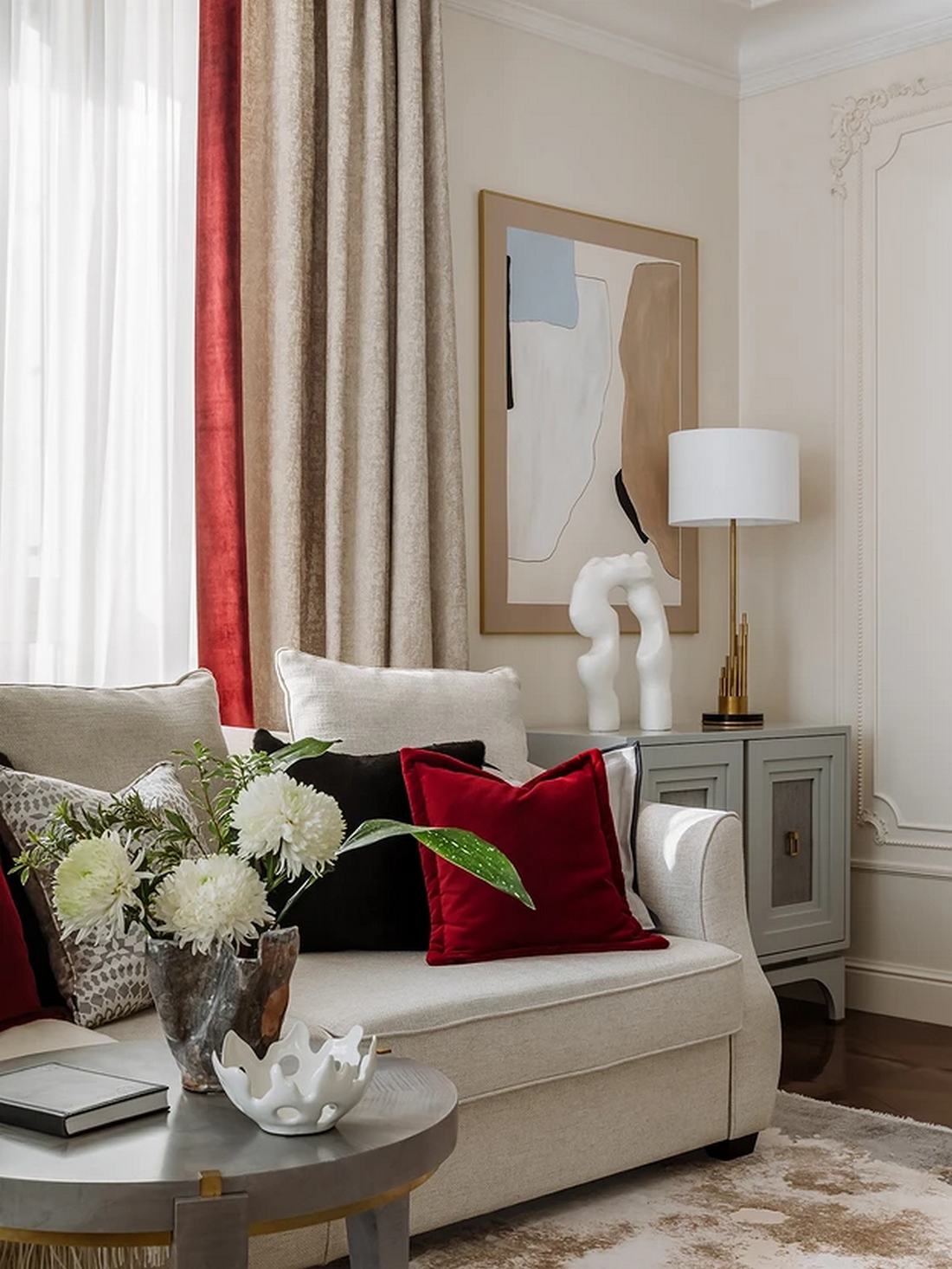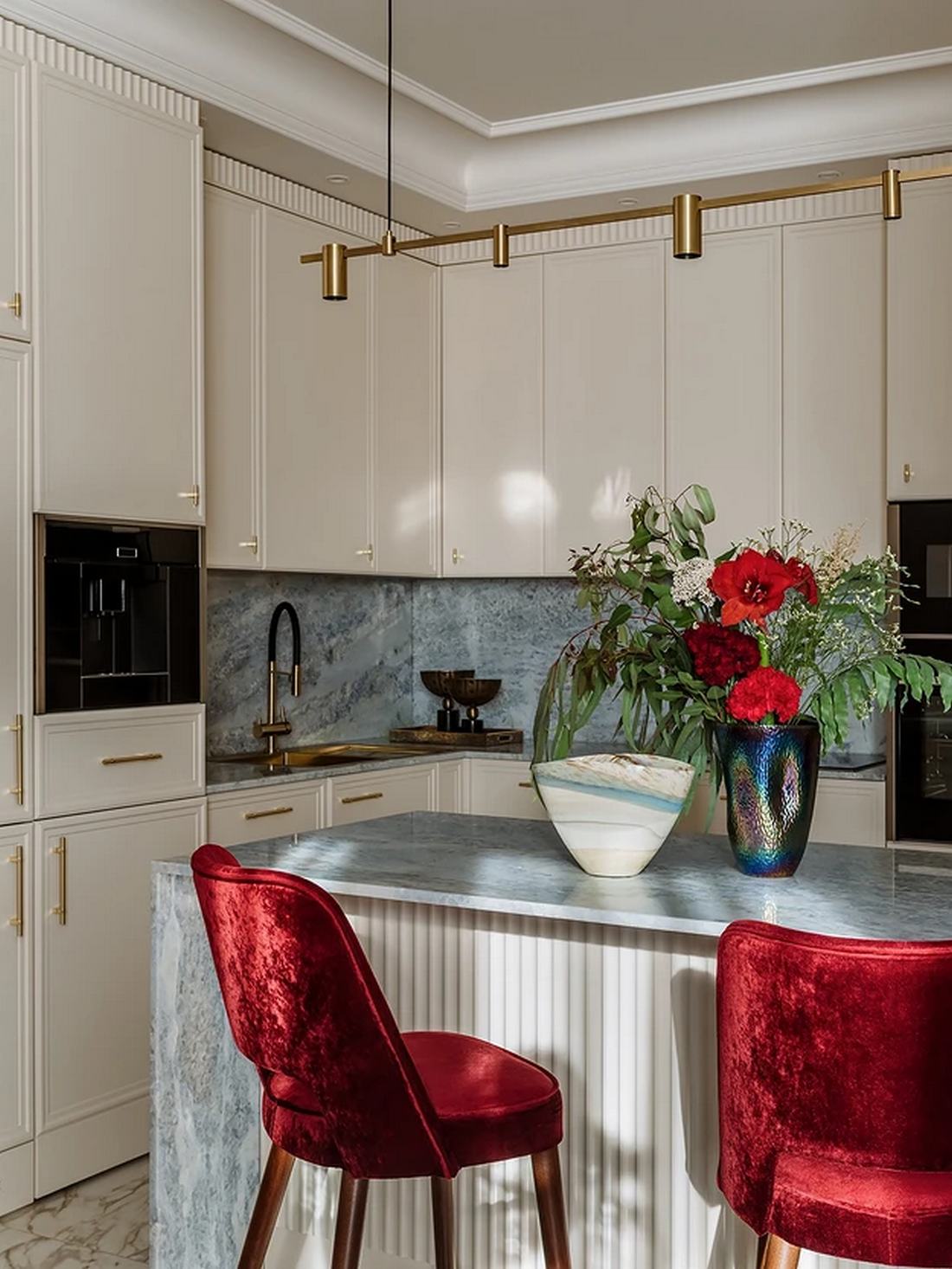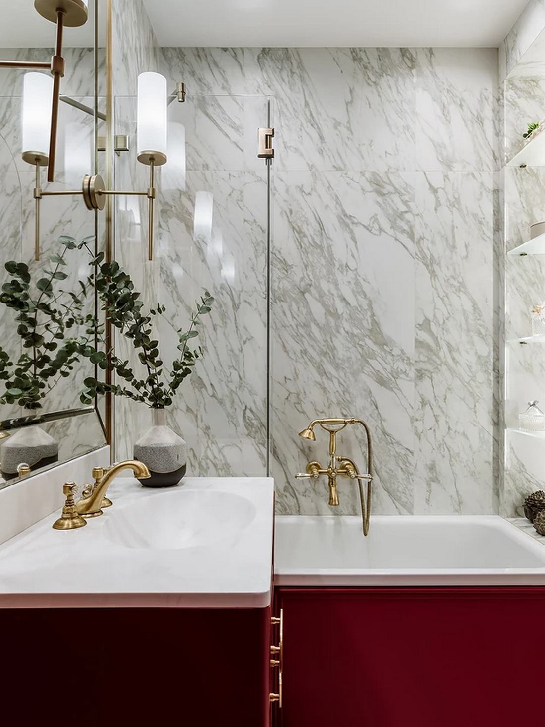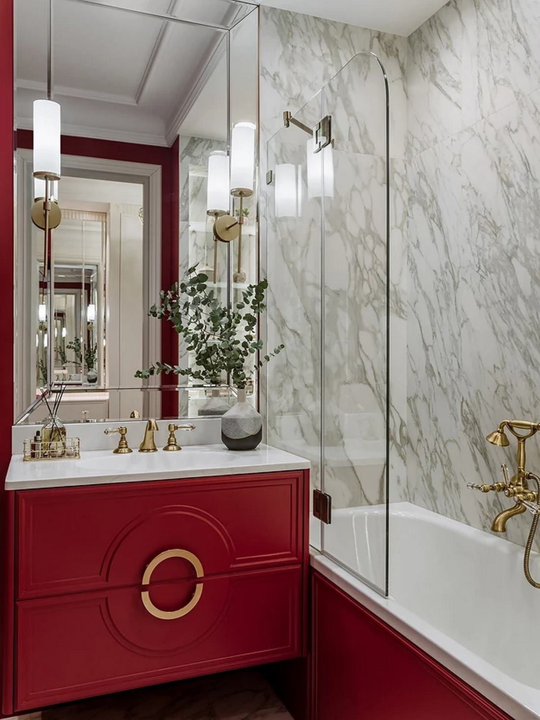 Míg a lakás többi részét a visszafogott elegancia jellemzi, a fürdőszobában a tulajdonos színek iránti vágya teljesedett ki. Itt egy dinamikus, élénkpiros árnyalat dominál a falfestésen, amelyet márványmintás kerámialapokkal kombináltak. A mosdószekrényt egyedileg gyártatták, hogy színe tökéletesen passzoljon a falhoz.