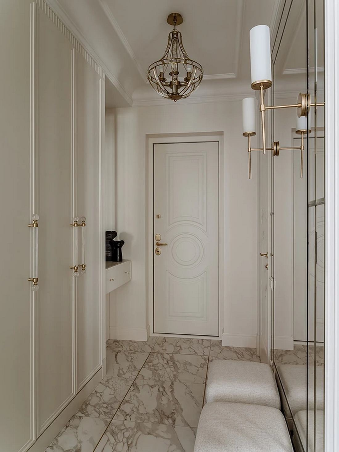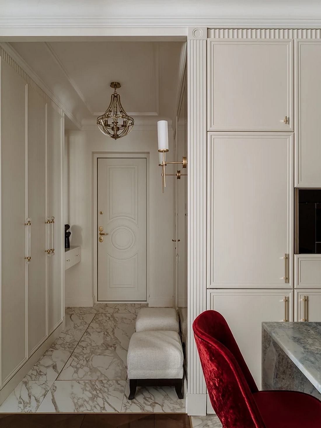 A tárolást ezen a kis alapterületen mesterien oldották meg: az előszobában egy hatalmas beépített szekrényrendszer kapott helyet, amely elnyeli a kabátokat, cipőket, táskákat, sőt a háztartási eszközöket is, mint a vasalódeszka vagy az állóporszívó. A funkciót egy apróságok tárolására alkalmas konzolasztal és egy elegáns mennyezeti lámpa egészíti ki. A padlót itt – és a konyhában is – márványmintás kerámia burkolat fedi.