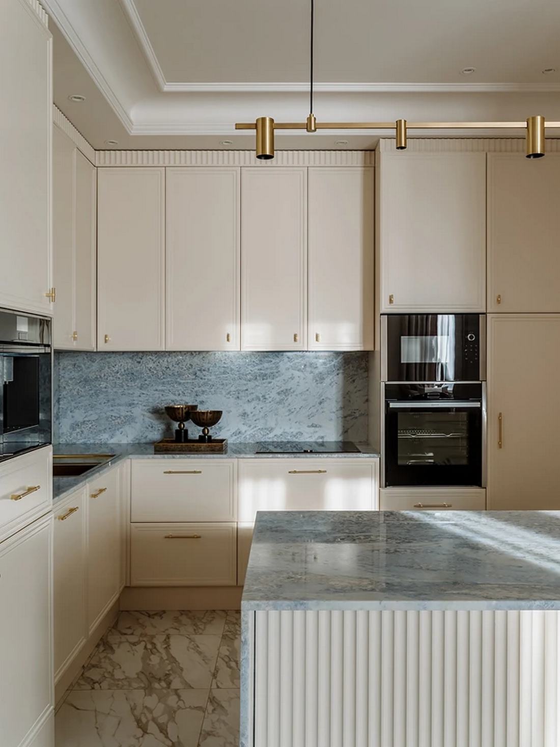 A helyiség legfőbb ékessége a kék árnyalatú, természetes kvarcit, amely a munkapulton, a konyhaszigeten és a hátfalon is megjelenik. Ez az anyag nemcsak esztétikailag kiemelkedő, de rendkívül praktikus választás is, hiszen karcálló és bírja a magas hőt. A világításról a sziget fölé belógatott, modern sínrendszerre emlékeztető függeszték gondoskodik.