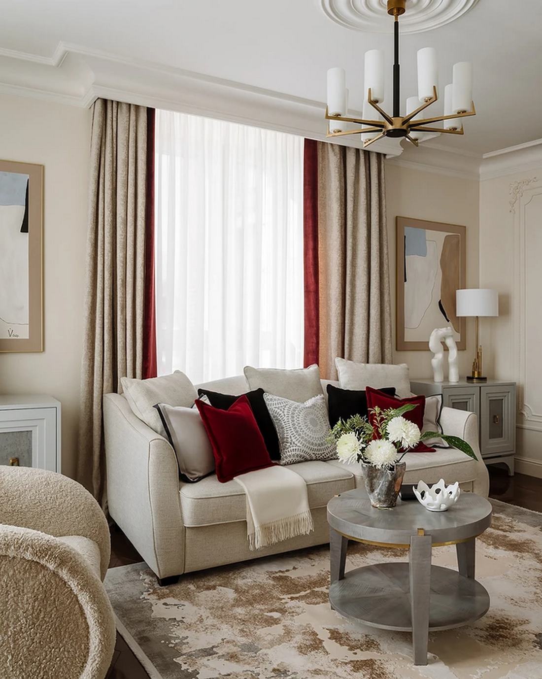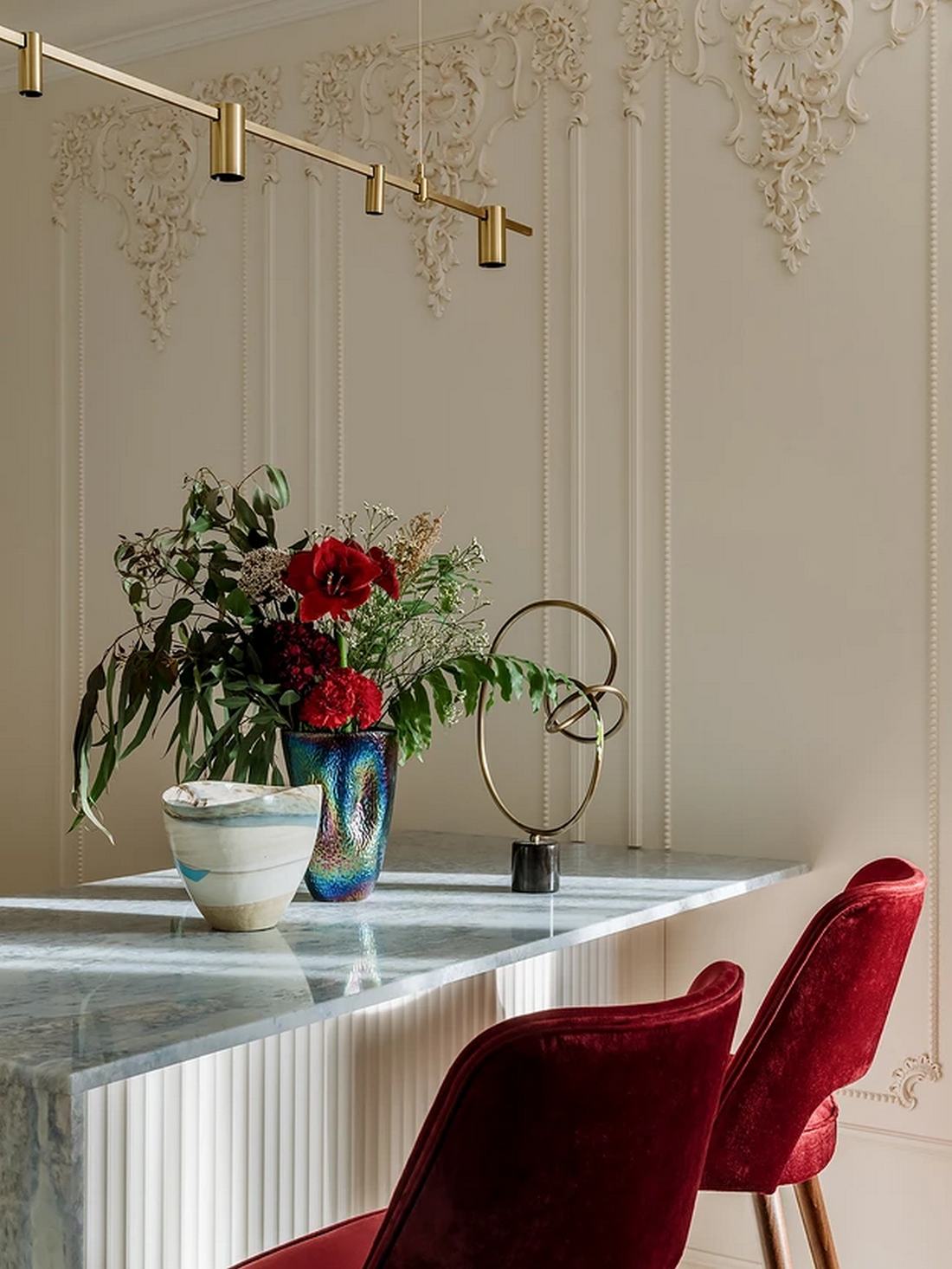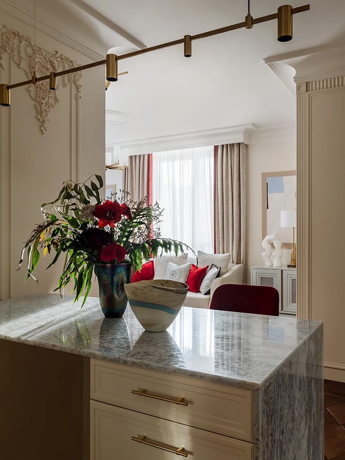 A lakás stílusa a klasszikus és a modern elemek keveréke, ami a lakberendező elmondása szerint az egyik legnépszerűbb kérés, ha egy ügyfél nem minimál, de nem is kimondottan klasszikus stílusban gondolkodik. A stukkók, a sárgaréz kiegészítők, a természetes kő és az igényes anyaghasználat ünnepélyes megjelenést kölcsönöznek az enteriőrnek, ugyanakkor a modern sínrendszeres lámpák és a szigorúbb formák finoman tompítják a fényűző hangulatot, a kortárs felé mozdítva el az összhatást.