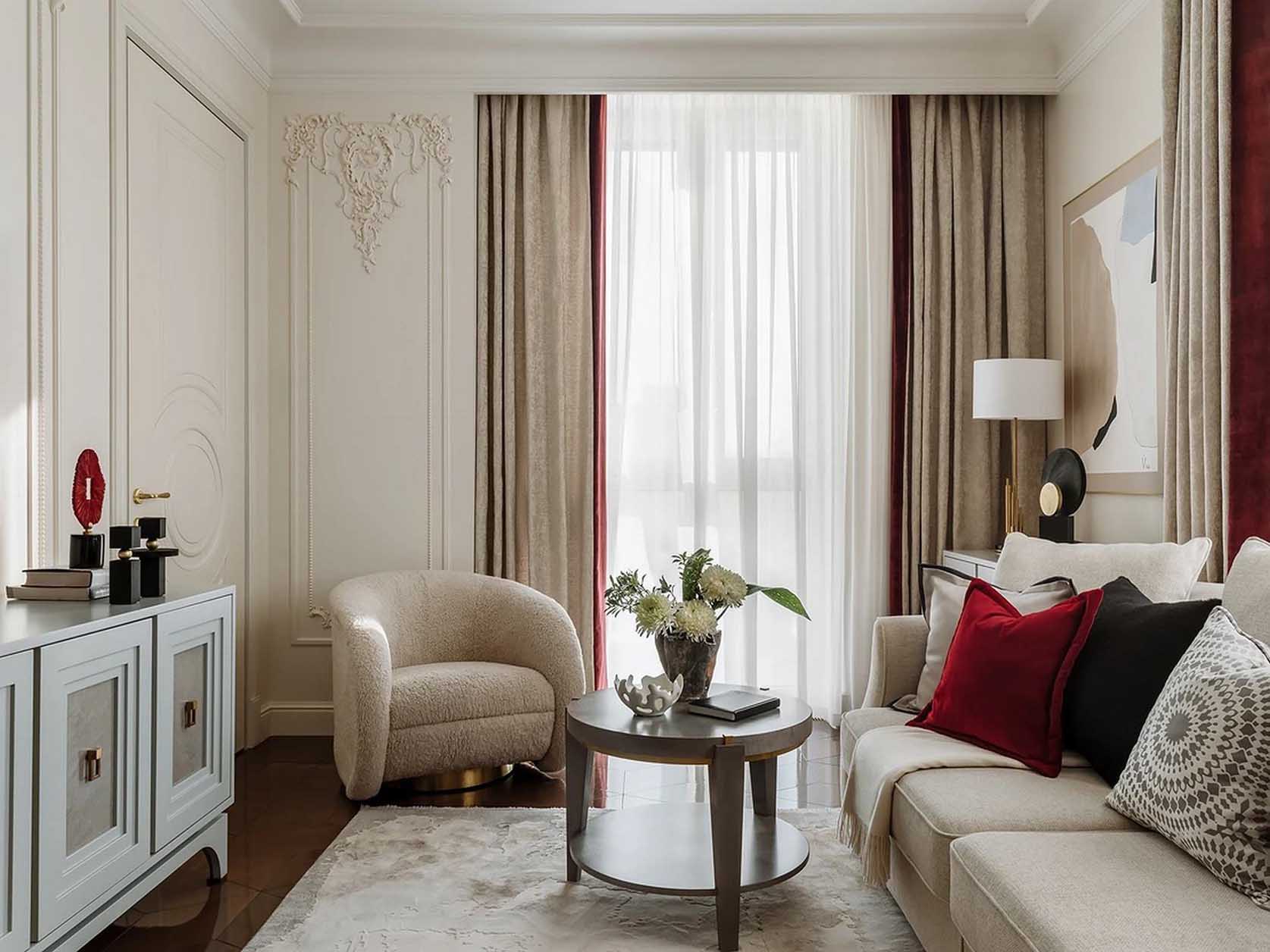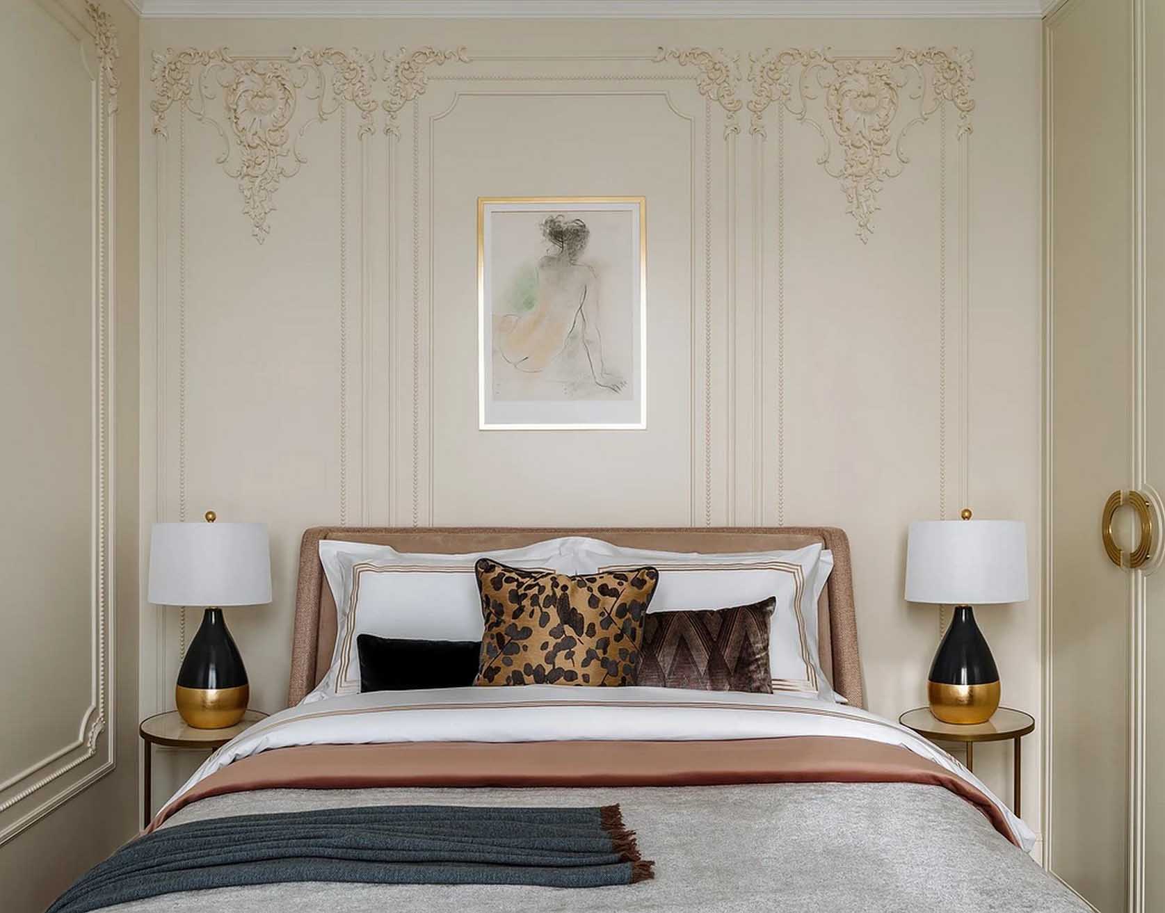 A falak a tojáshéj színét kapták, amelyeket klasszikus stílusú, elegáns díszlécek ékesítenek. A tervező a praktikum jegyében a gipsz helyett a modern duropolimert választotta. A mennyezet a falaknál világosabb árnyalatú, amelyet széles mennyezeti párkány keretez.
