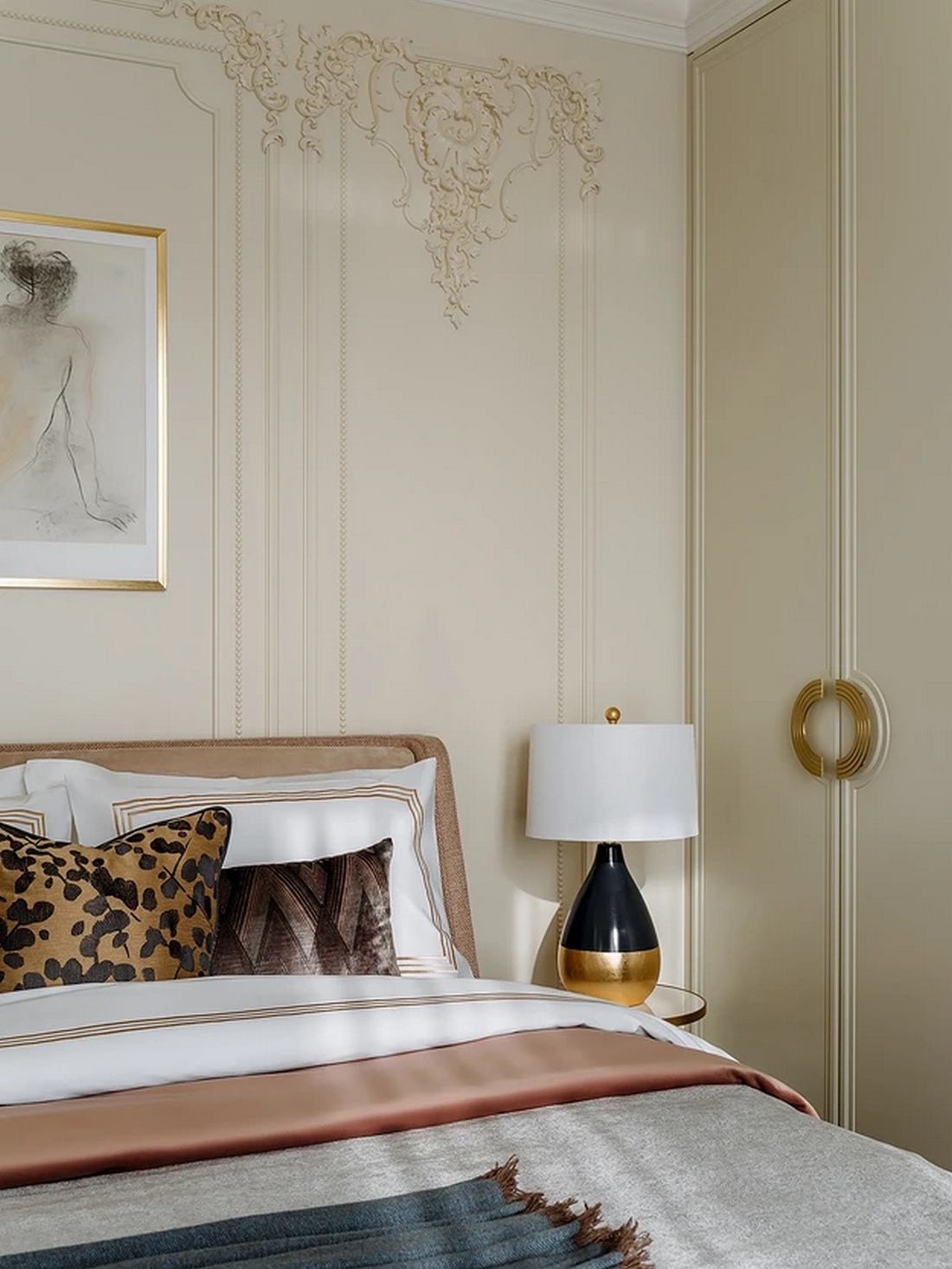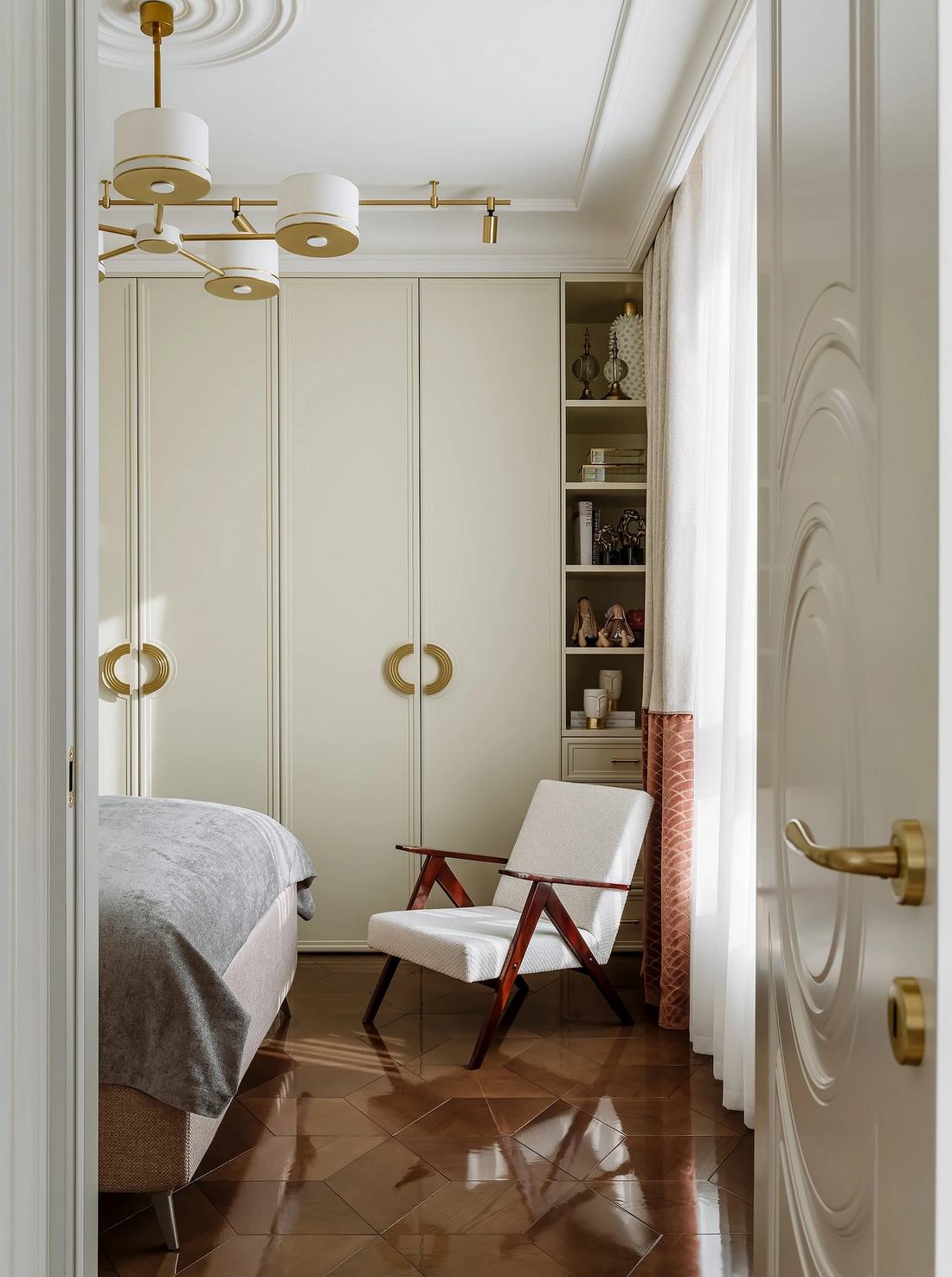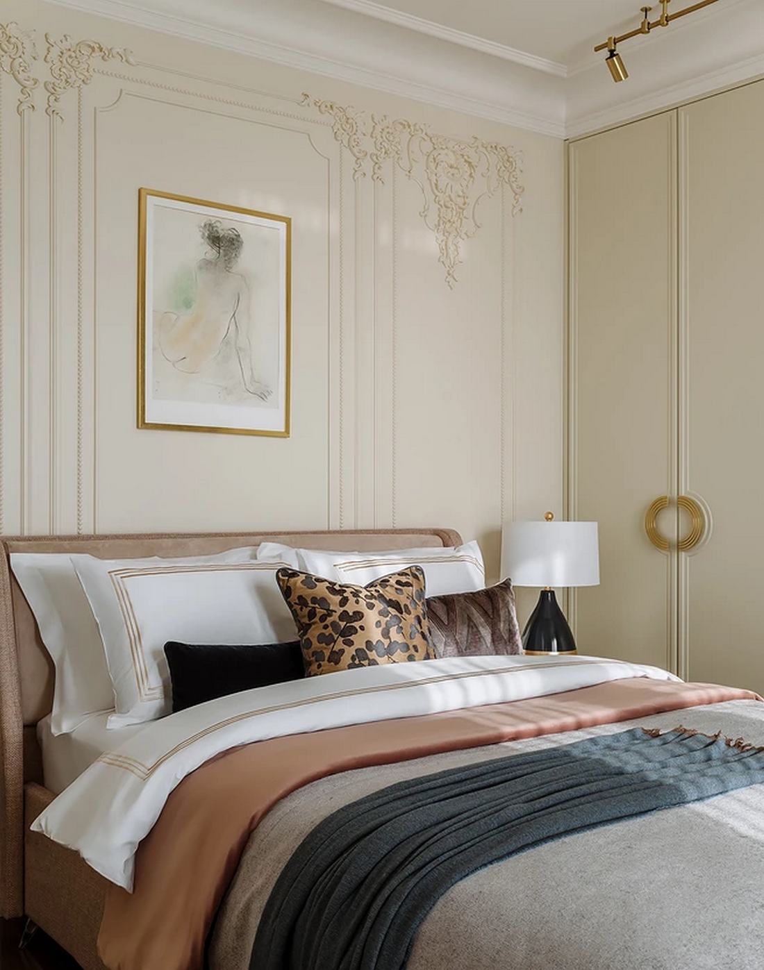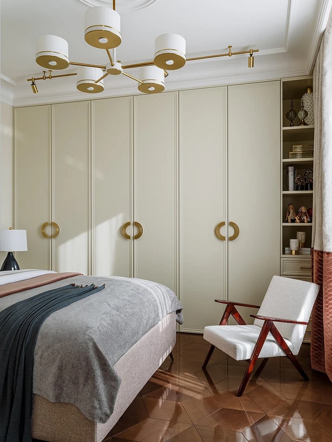 A hálószobában a tárolást egy újabb tágas beépített szekrény oldja meg. A berendezés különlegessége egy vintage fotel, amelyet a tervező vázlatai alapján restauráltak, egyedi karaktert adva a helyiségnek. A világítás itt különösen izgalmas: a klasszikus csillár mellett sárgaréz színű, modern sínlámpák is helyet kaptak, tökéletesen lekövetve a lakás kettős stílusvilágát.