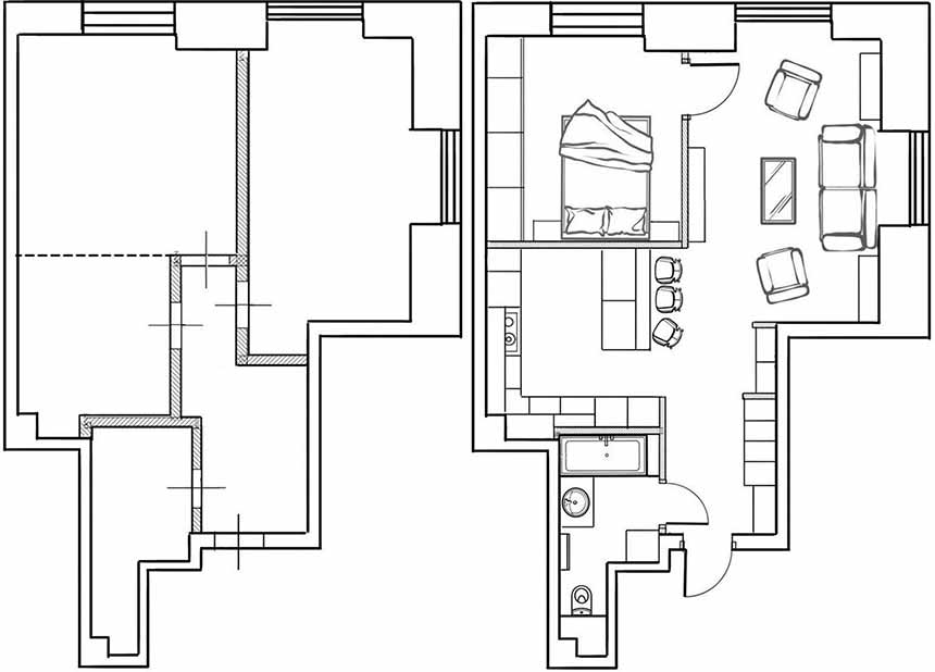 A lakás eredeti alaprajza nem volt szokványos, a helyiségek szabálytalan formájúak voltak, bár a funkciók elosztása a tipikus másfél szobás beosztást követte: amerikai konyhás nappali, hálószoba és külön fürdőszoba. A tervezés során a teret újragondolták: a konyhát és a nappalit úgy egyesítették, hogy a bejárati zóna és a közösségi tér között ne legyenek válaszfalak – ennek köszönhetően a természetes fény akadálytalanul jut el az előszobába is, tágasabb hatást eredményezve.