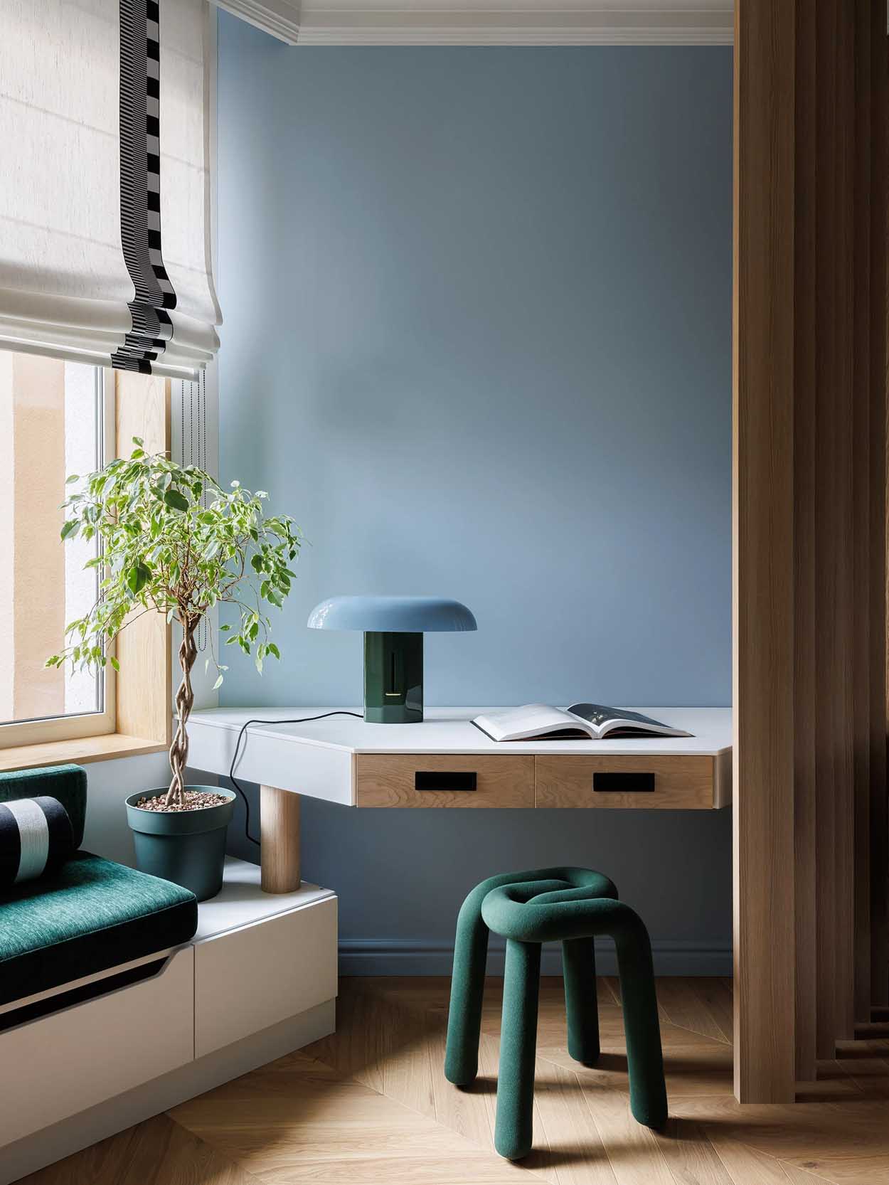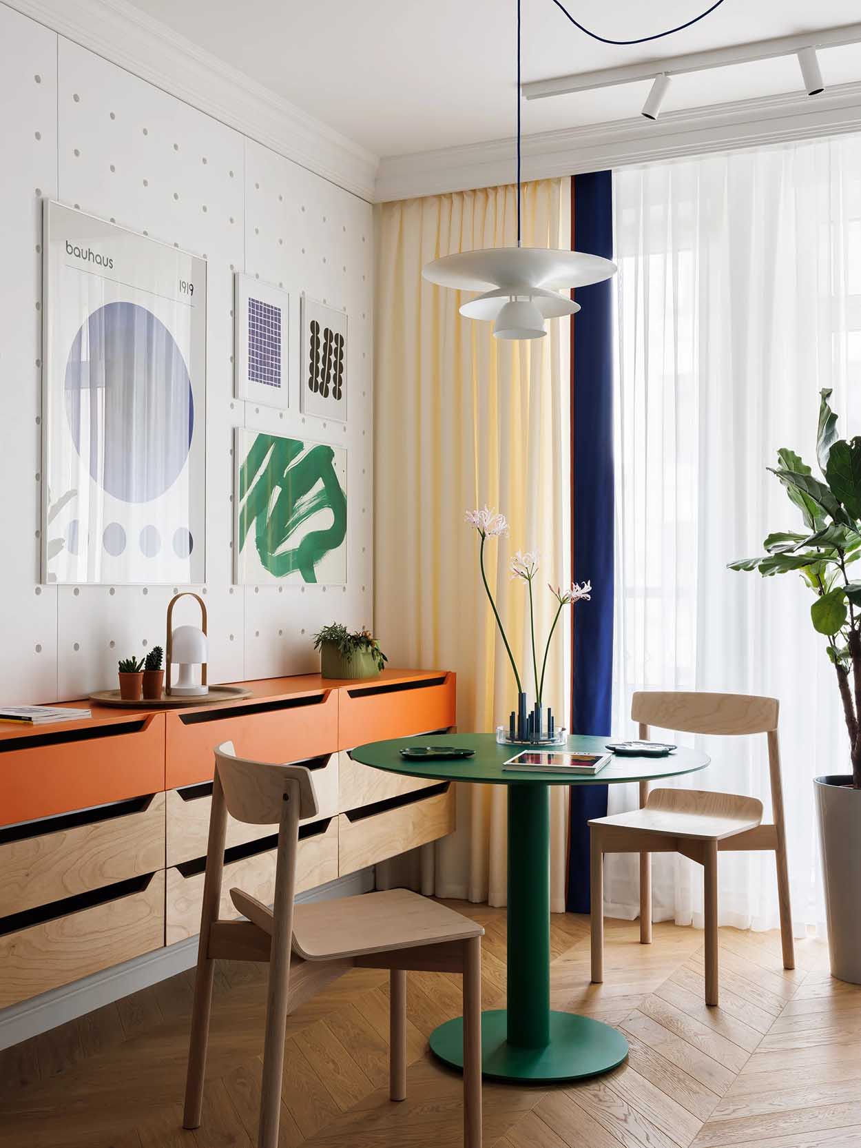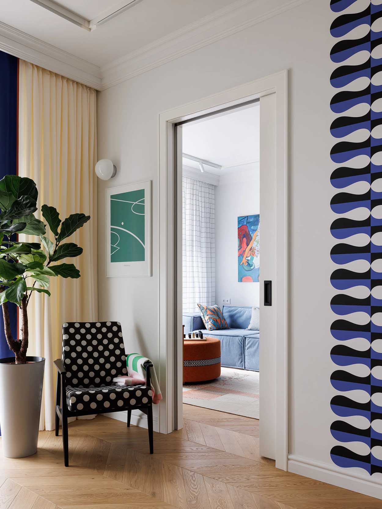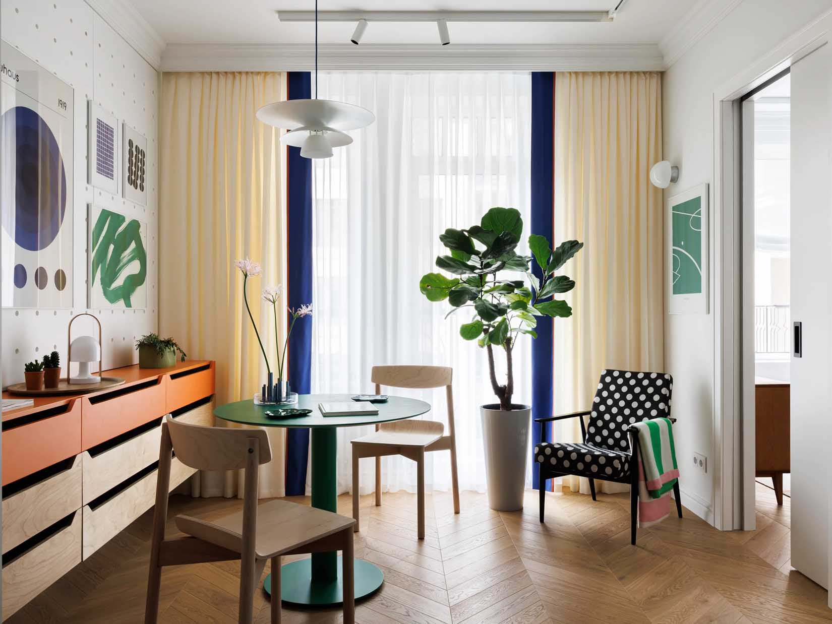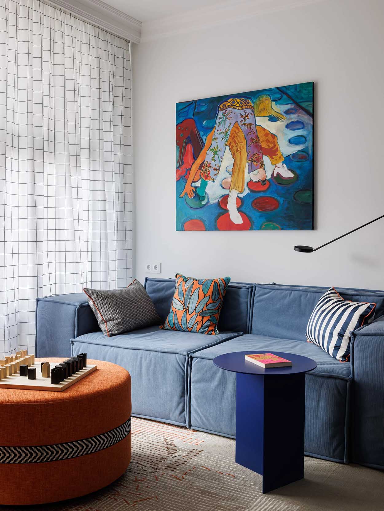 „A koncepció lényege a különböző színkombinációk harmonizálása volt, igazodva az egyes helyiségek funkciójához” – magyarázzák a szakemberek. „A palettában megtalálhatók mind a domináns, mind a csak részletekben felbukkanó árnyalatok. A komplex levendulakék mellett megjelenik a nyílt narancs, az élénkzöld, a mályvacukor-rózsaszín és az átható ultramarin. Az enteriőr könnyedséget és játékosságot sugároz, köszönhetően az élénk nyomatok, a szokatlan anyagok és az ornamensek merész társításának.”