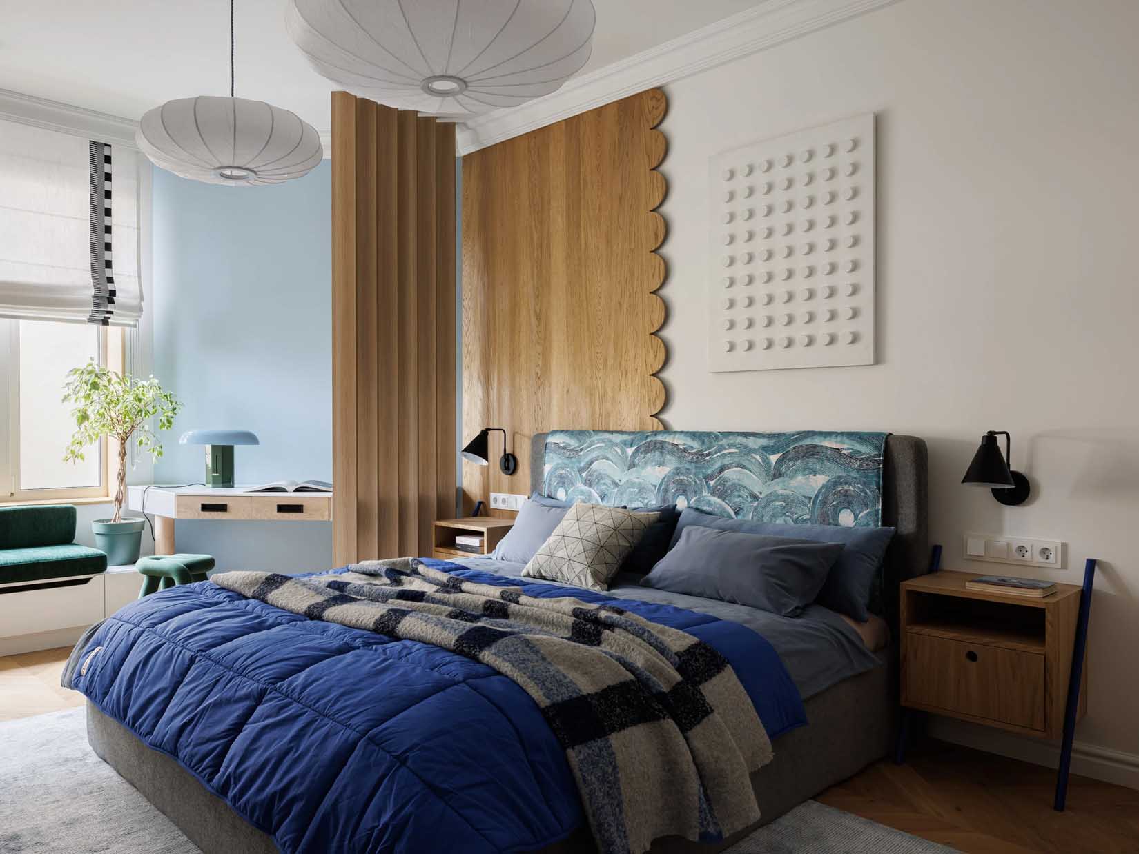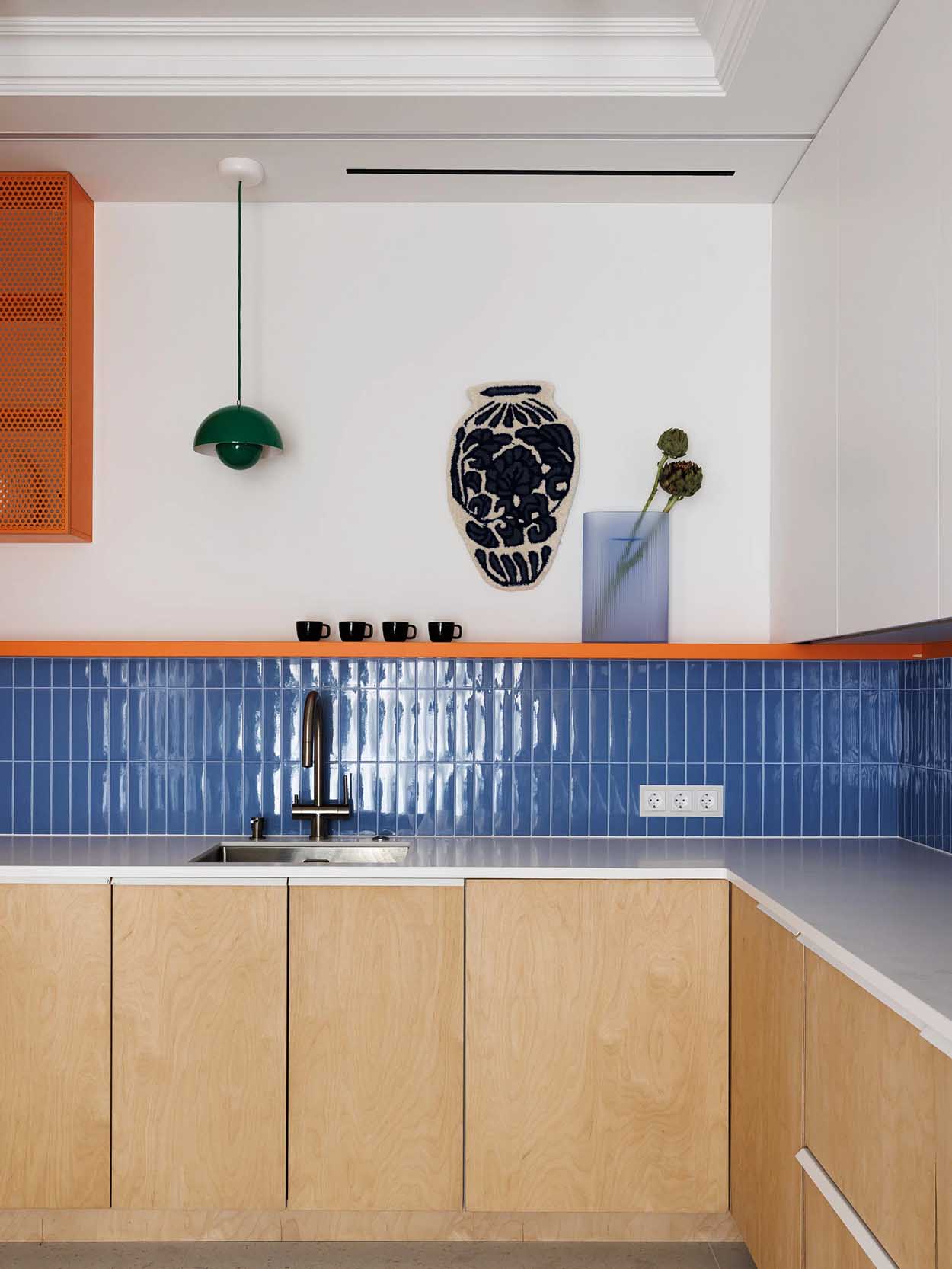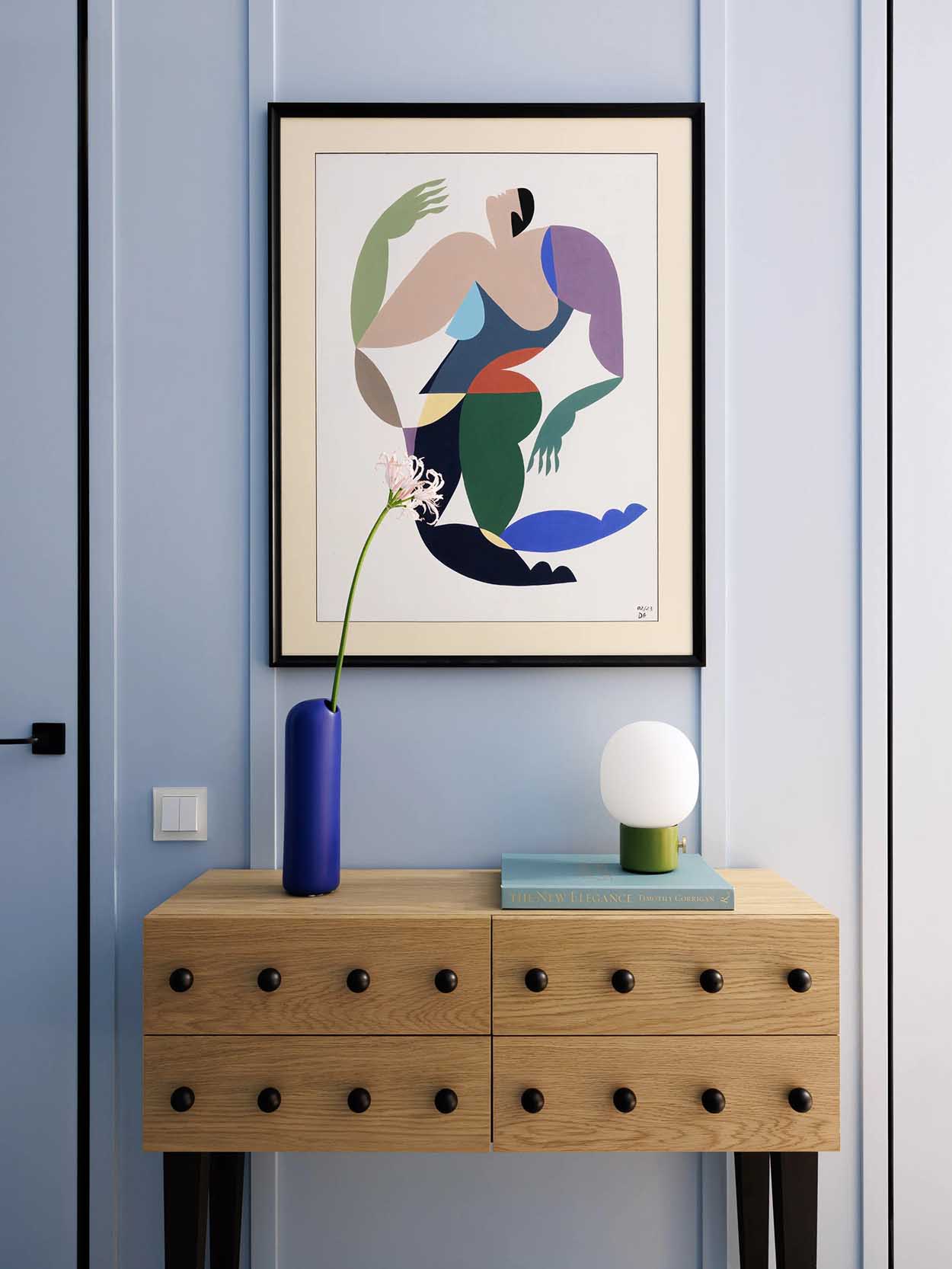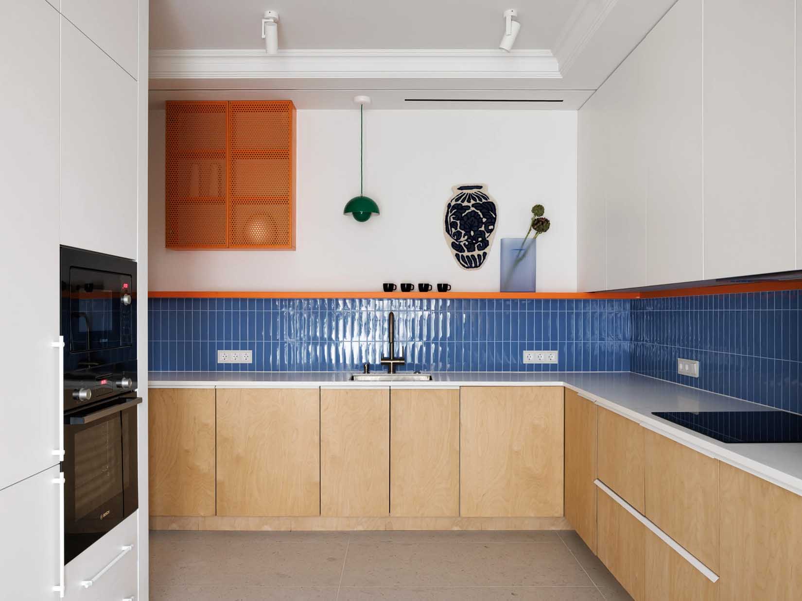 „A koncepció lényege a különböző színkombinációk harmonizálása volt, igazodva az egyes helyiségek funkciójához” – magyarázzák a szakemberek. „A palettában megtalálhatók mind a domináns, mind a csak részletekben felbukkanó árnyalatok. A komplex levendulakék mellett megjelenik a nyílt narancs, az élénkzöld, a mályvacukor-rózsaszín és az átható ultramarin. Az enteriőr könnyedséget és játékosságot sugároz, köszönhetően az élénk nyomatok, a szokatlan anyagok és az ornamensek merész társításának.”