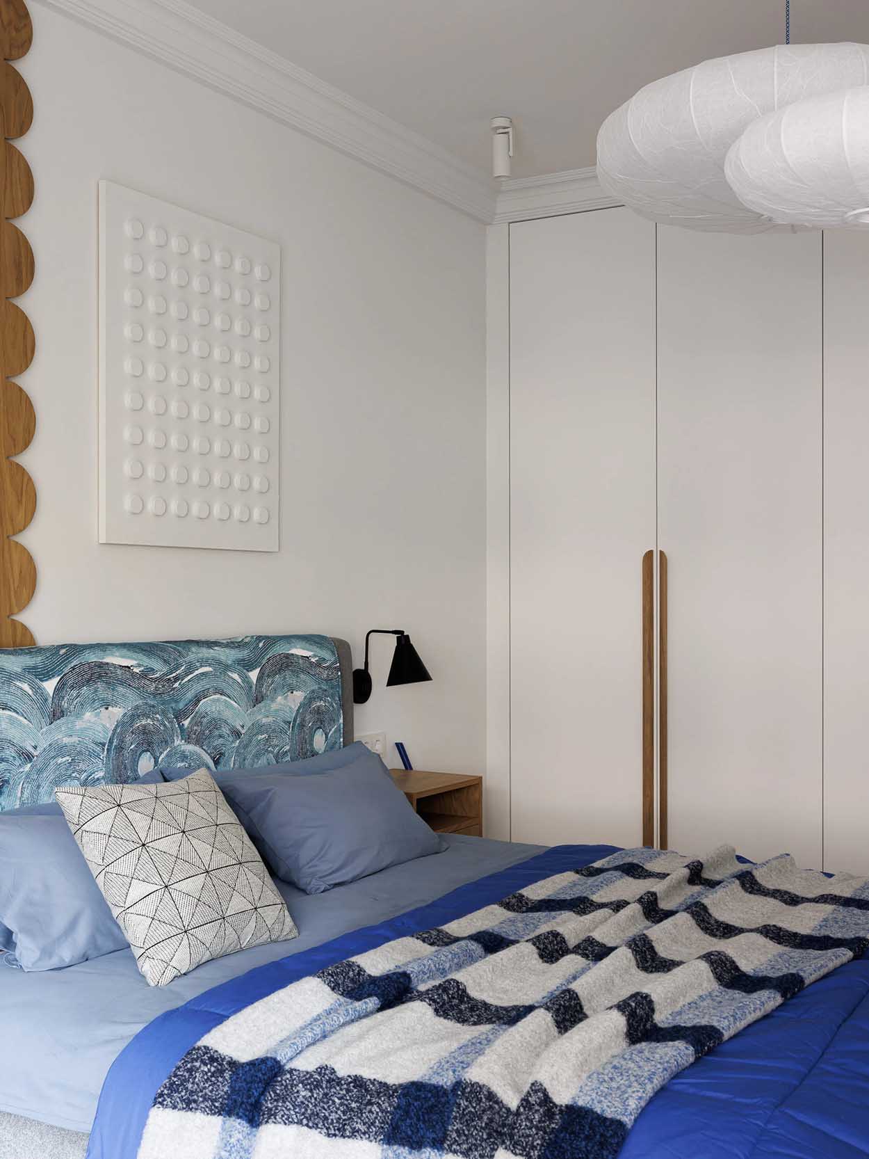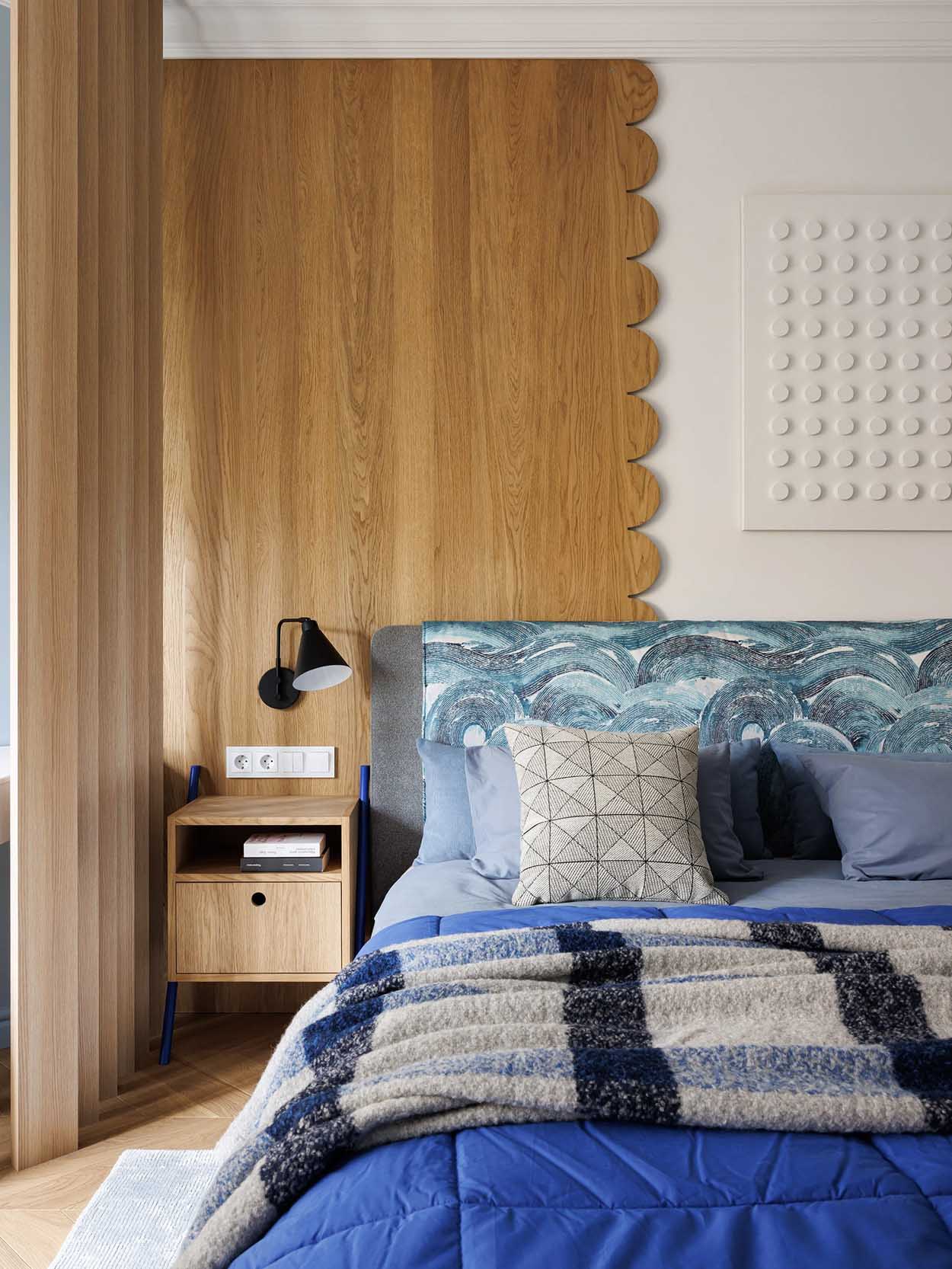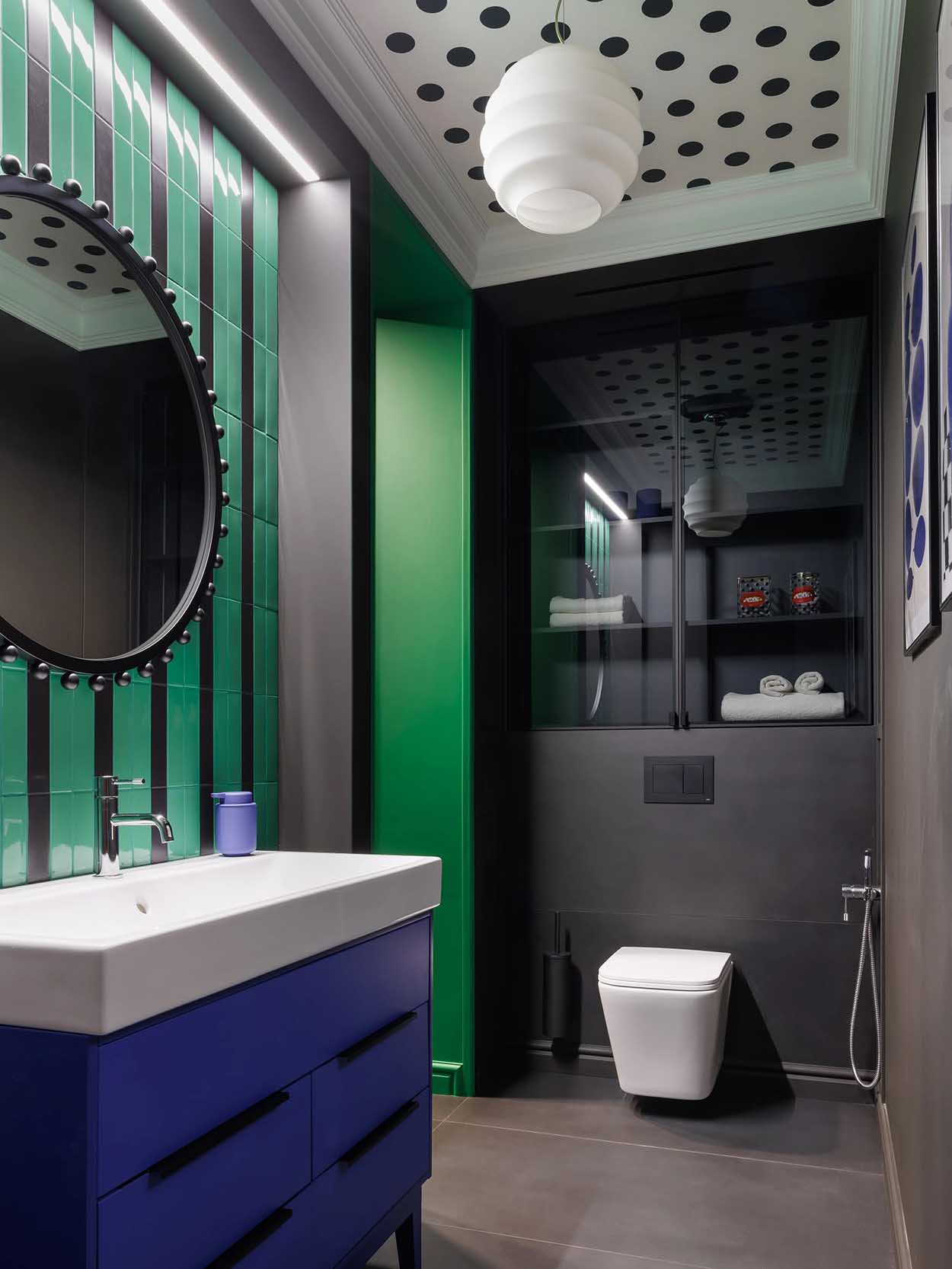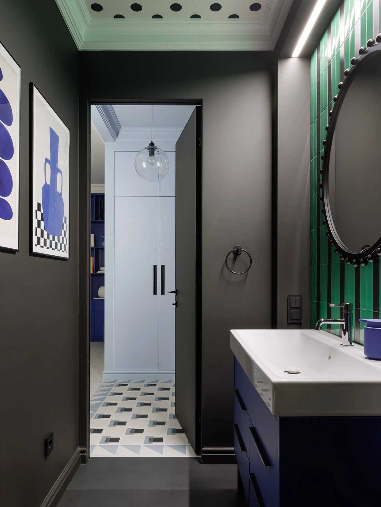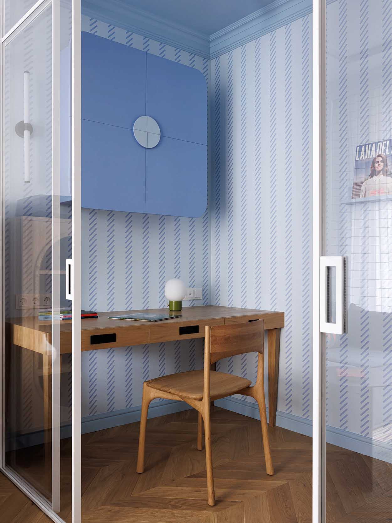 „A koncepció lényege a különböző színkombinációk harmonizálása volt, igazodva az egyes helyiségek funkciójához” – magyarázzák a szakemberek. „A palettában megtalálhatók mind a domináns, mind a csak részletekben felbukkanó árnyalatok. A komplex levendulakék mellett megjelenik a nyílt narancs, az élénkzöld, a mályvacukor-rózsaszín és az átható ultramarin. Az enteriőr könnyedséget és játékosságot sugároz, köszönhetően az élénk nyomatok, a szokatlan anyagok és az ornamensek merész társításának.”