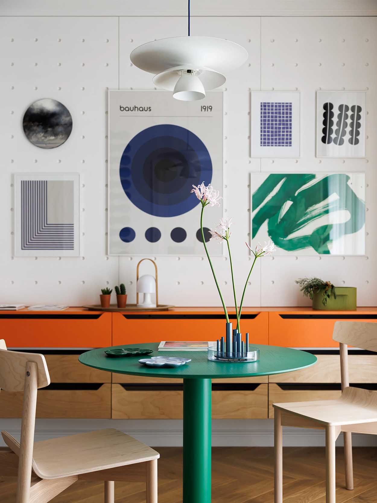 A városi lakást lakberendező a tipikus megoldásoktól eltérően, bátran és egyedien alakította ki egy fiatal pár megbízásából. Az enteriőr az eklektika jegyében született, mid-century elemekkel fűszerezve, ahol a szokatlan színpaletta és a geometriai minták játéka határozza meg a tér hangulatát.