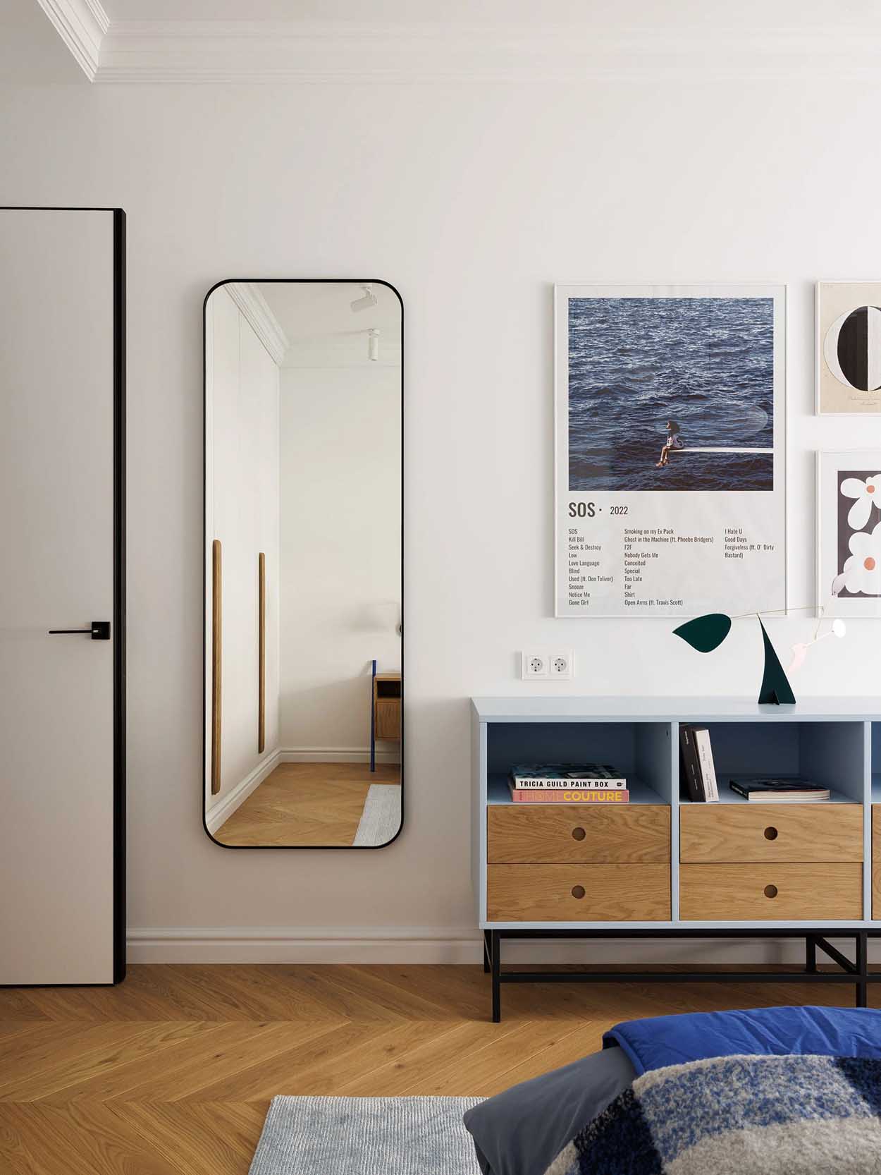 Így került a lakásba egy 1970-es évekből származó fotel új, élénk kárpittal, valamint olasz és dán vintage lámpák, illetve egy felújított, retró komód is. Különös figyelmet fordítottak a kárpitokra és a mintákra: a hálószobai ágyvég hangsúlyos textíliát kapott, a nappaliban lévő puffot geometriai mintás kontrasztos szegély díszíti, a vintage fotel pedig nagyméretű pöttyös szövettel lett áthúzva, ami tovább erősíti a tér eklektikus karakterét.