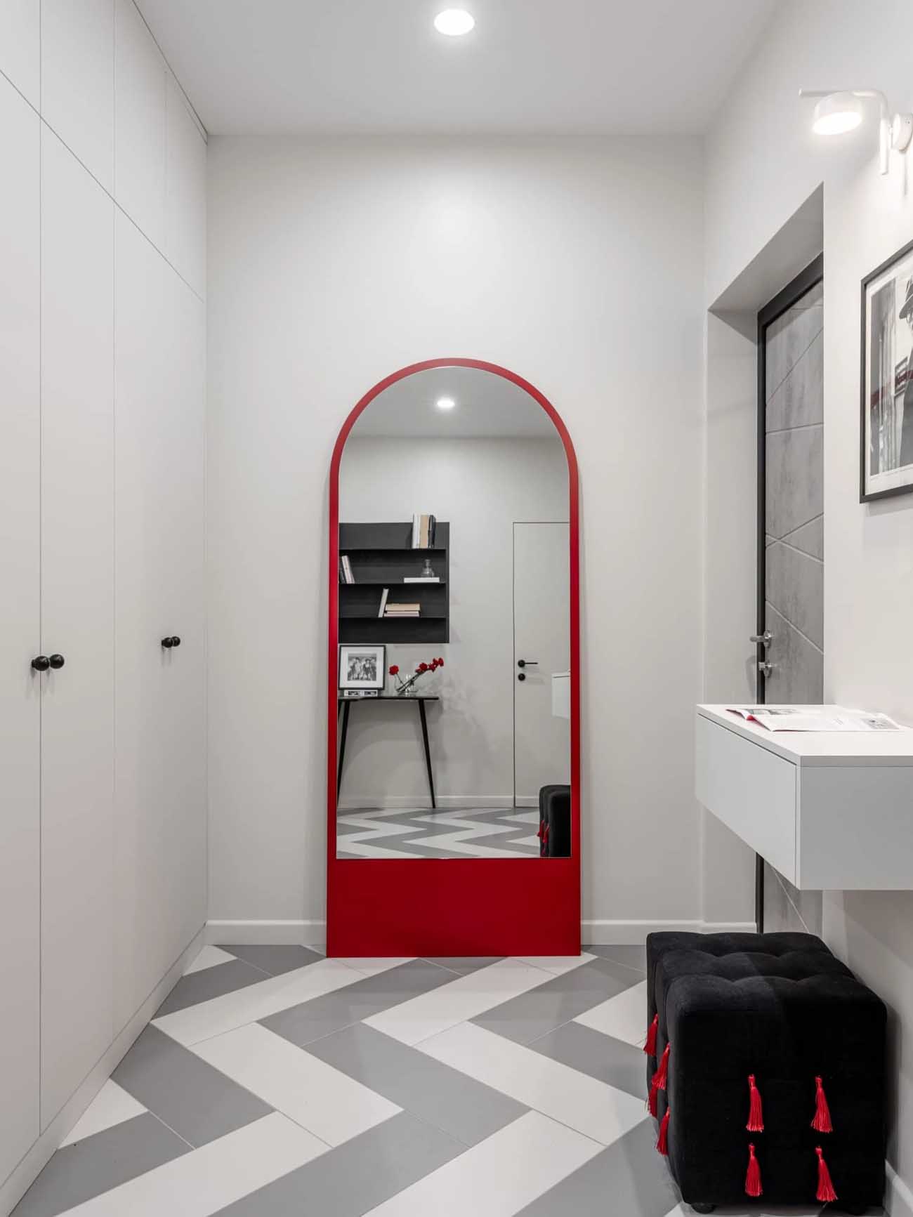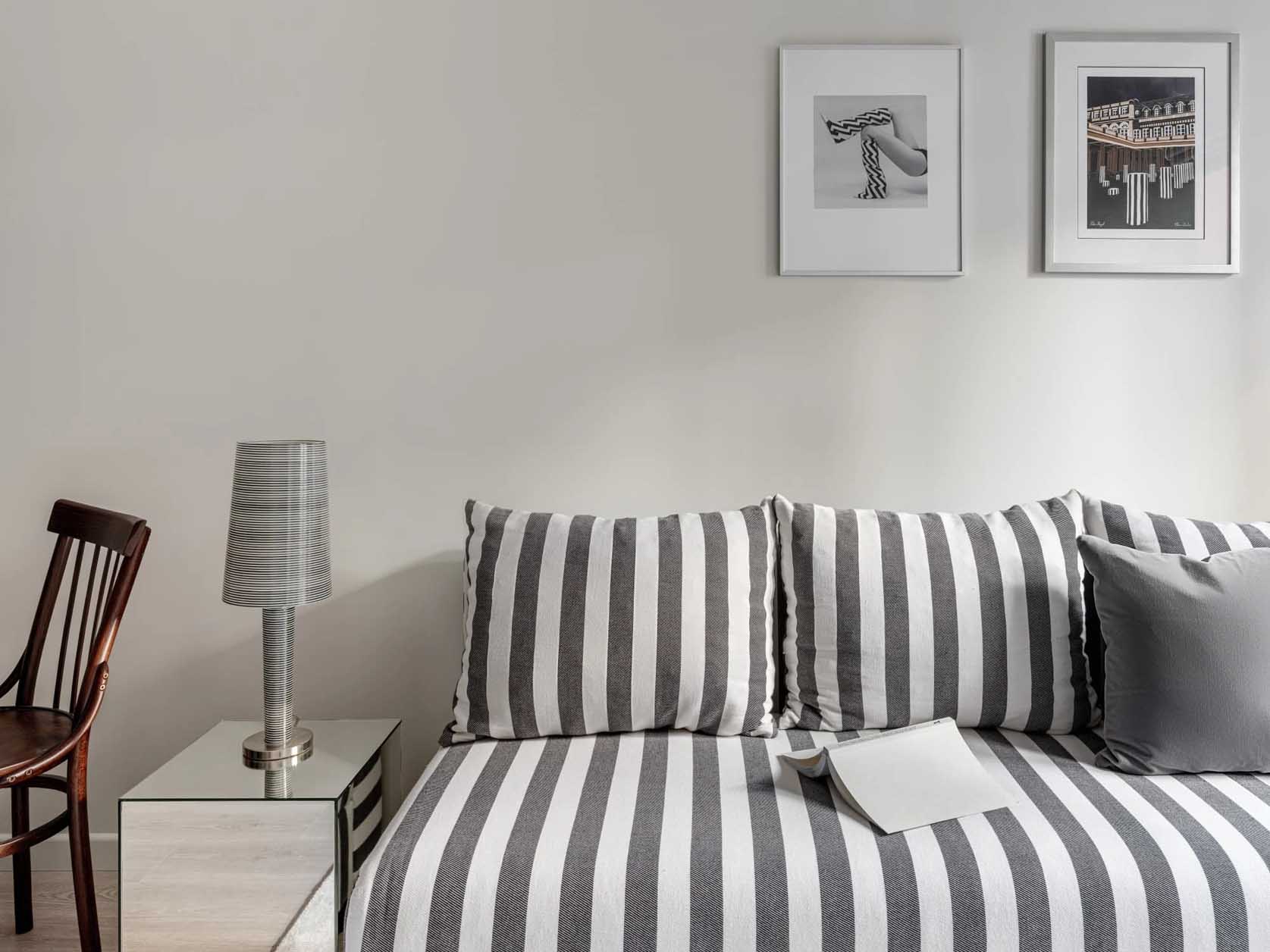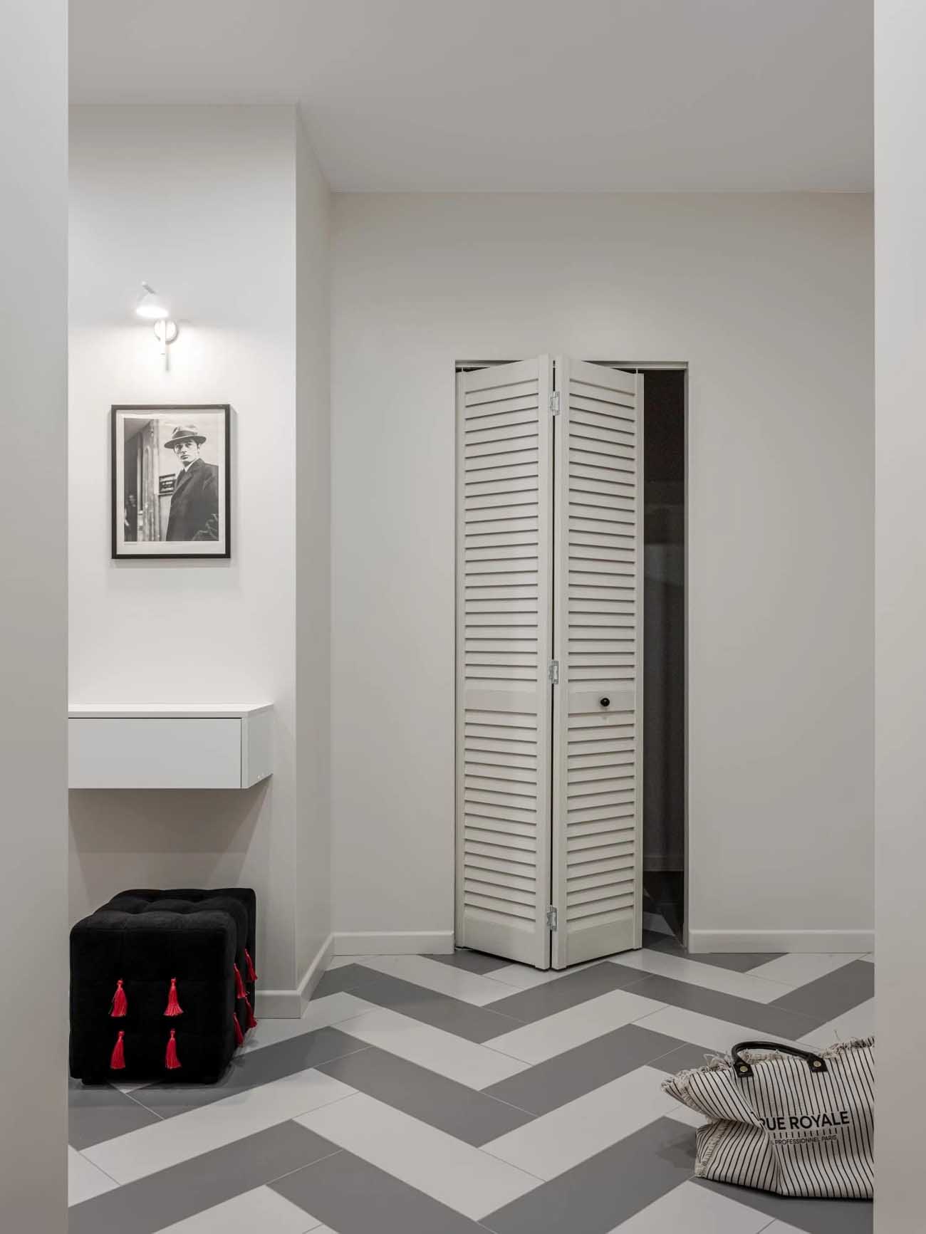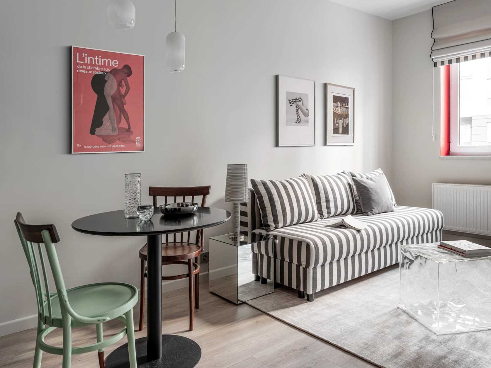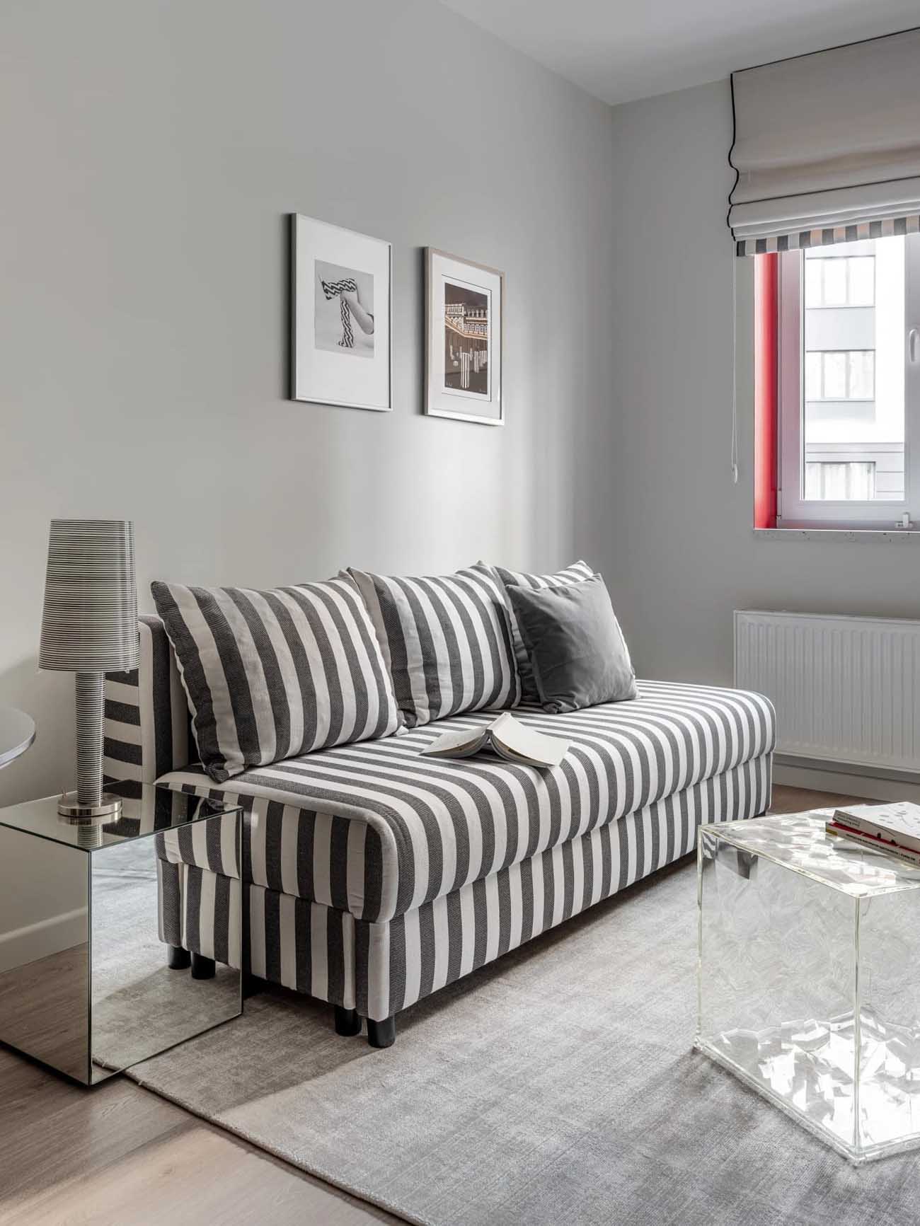 Az enteriőr egyik legfontosabb összekötő eleme a csíkos minta, amely különböző arányokban vonul végig a lakás zónáin: megjelenik a kanapén, a gardróbszekrényen, valamint az előszoba és a fürdőszoba padlóburkolatán is. Ez a motívum vizuálisan egységbe foglalja a teret.