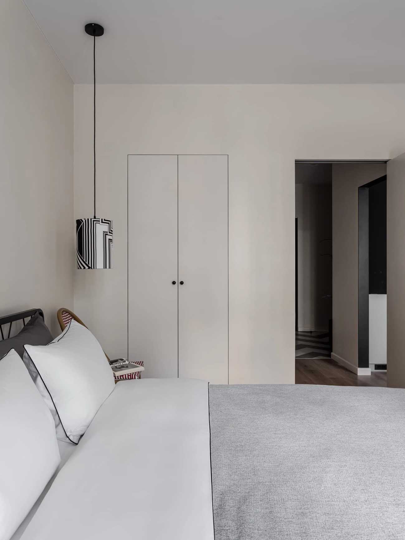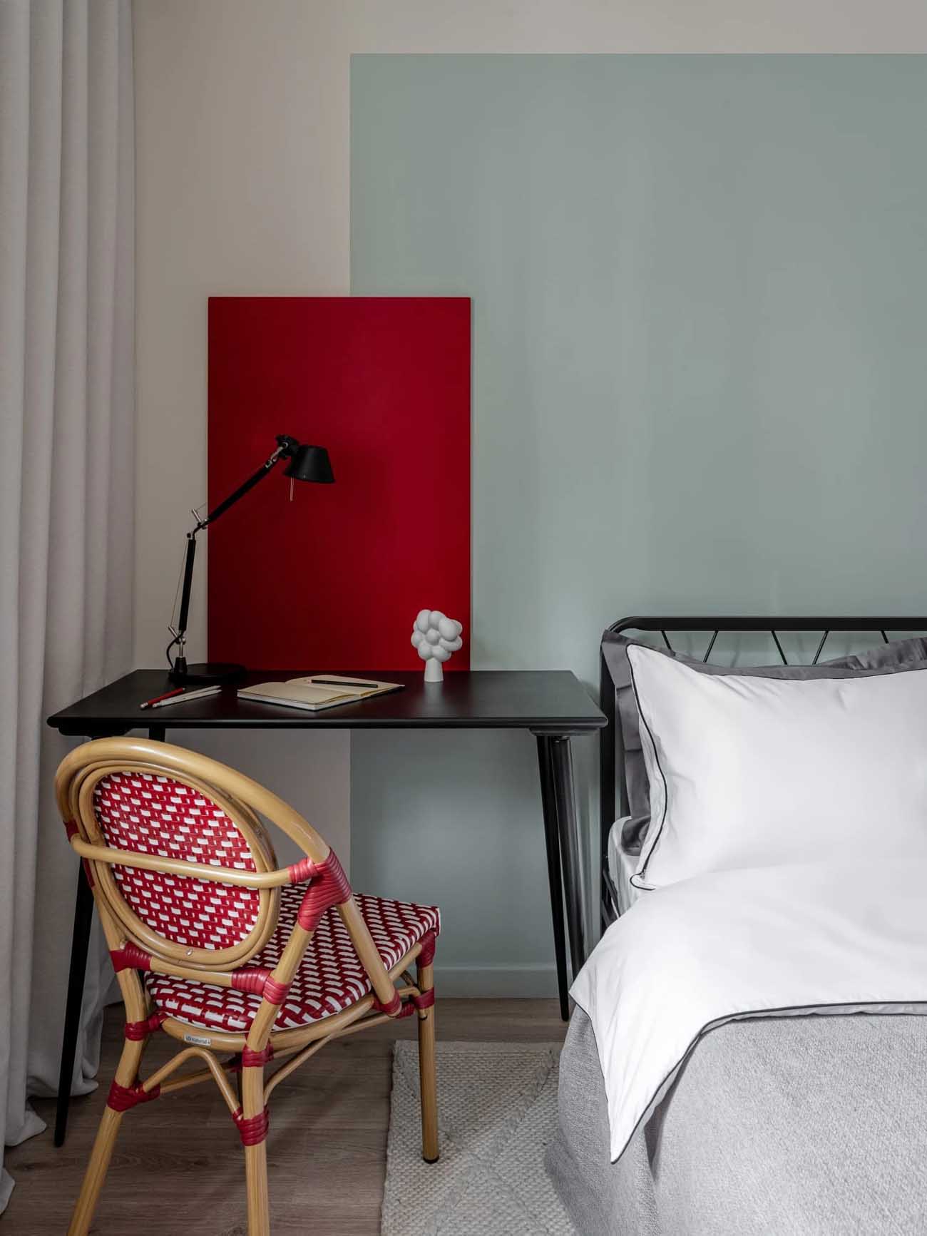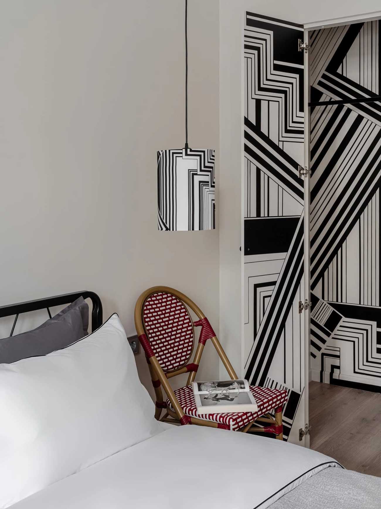 A hálószobában a tervezők a semleges felületeket élénk akcentusokkal „házasították”: a csíkos gardróbbal, az íróasztal melletti élénkvörös dekorpanellal és egy párizsi kávézókat idéző fonott székkel. A fekete-fehér grafikai elemek a gardrób zónáját szinte önálló műtárggyá emelik, ezzel becsempészve a művészetet a hétköznapokba. A falak belső festését és a lámpaernyők textilmintázatát is egyedi képzőművészeti megoldások ihlették.