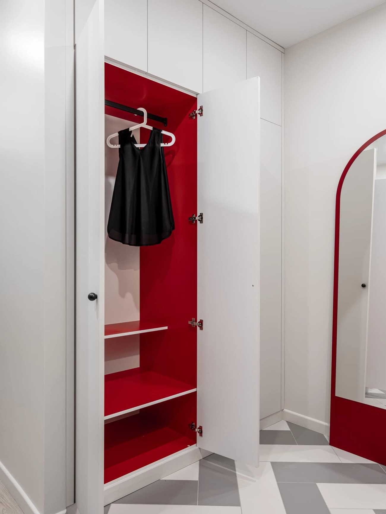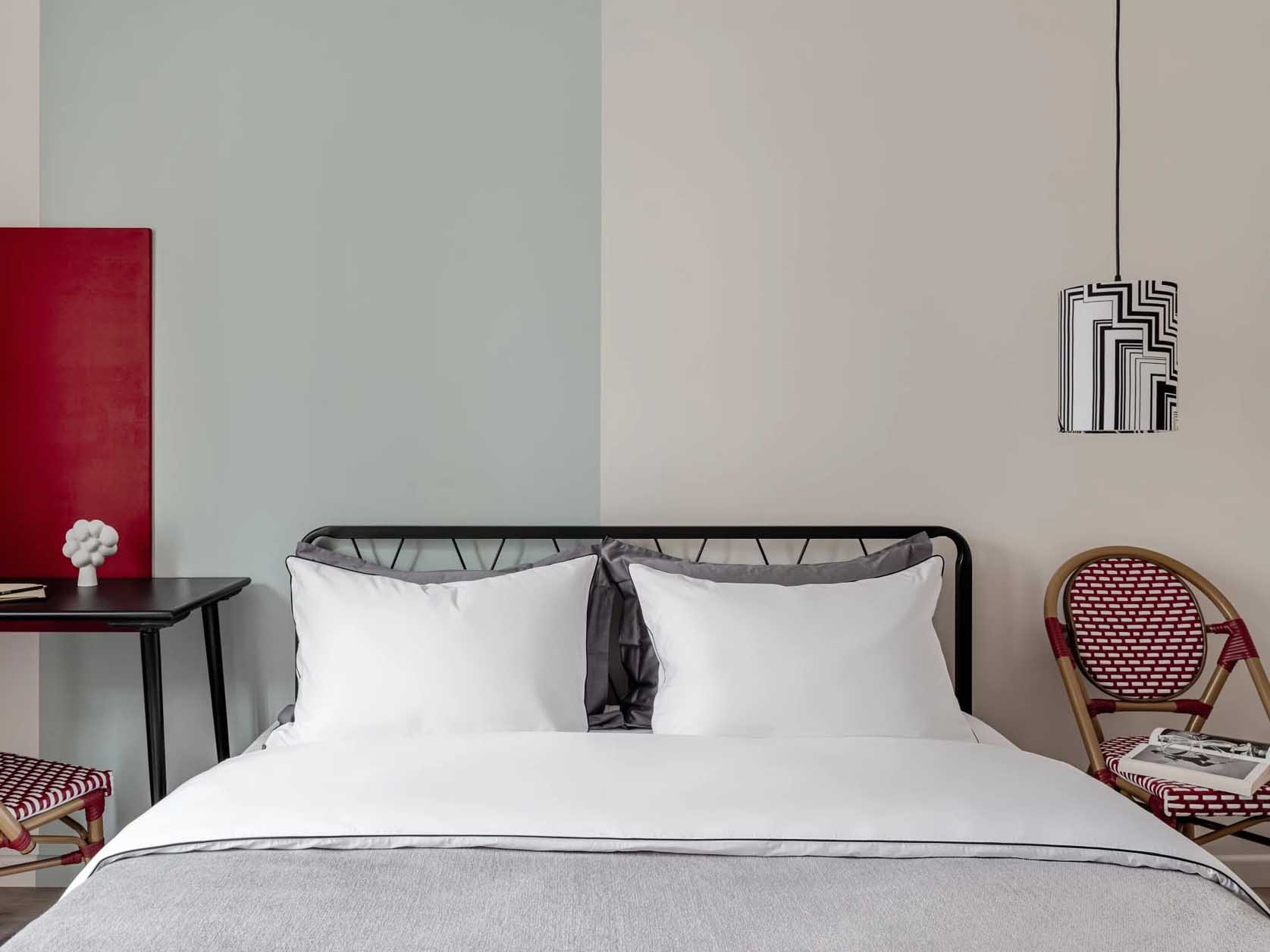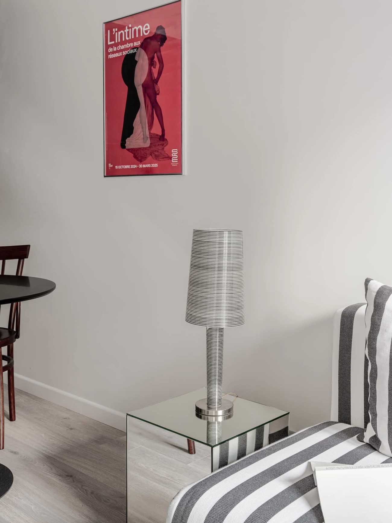A hálószobában a tervezők a semleges felületeket élénk akcentusokkal „házasították”: a csíkos gardróbbal, az íróasztal melletti élénkvörös dekorpanellal és egy párizsi kávézókat idéző fonott székkel. A fekete-fehér grafikai elemek a gardrób zónáját szinte önálló műtárggyá emelik, ezzel becsempészve a művészetet a hétköznapokba. A falak belső festését és a lámpaernyők textilmintázatát is egyedi képzőművészeti megoldások ihlették.