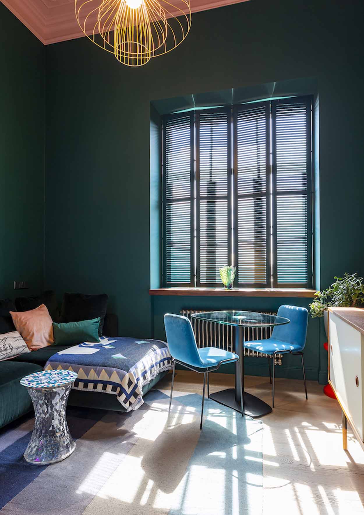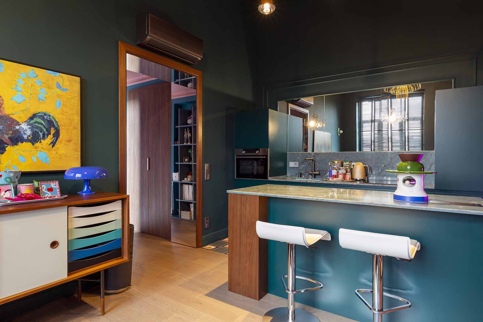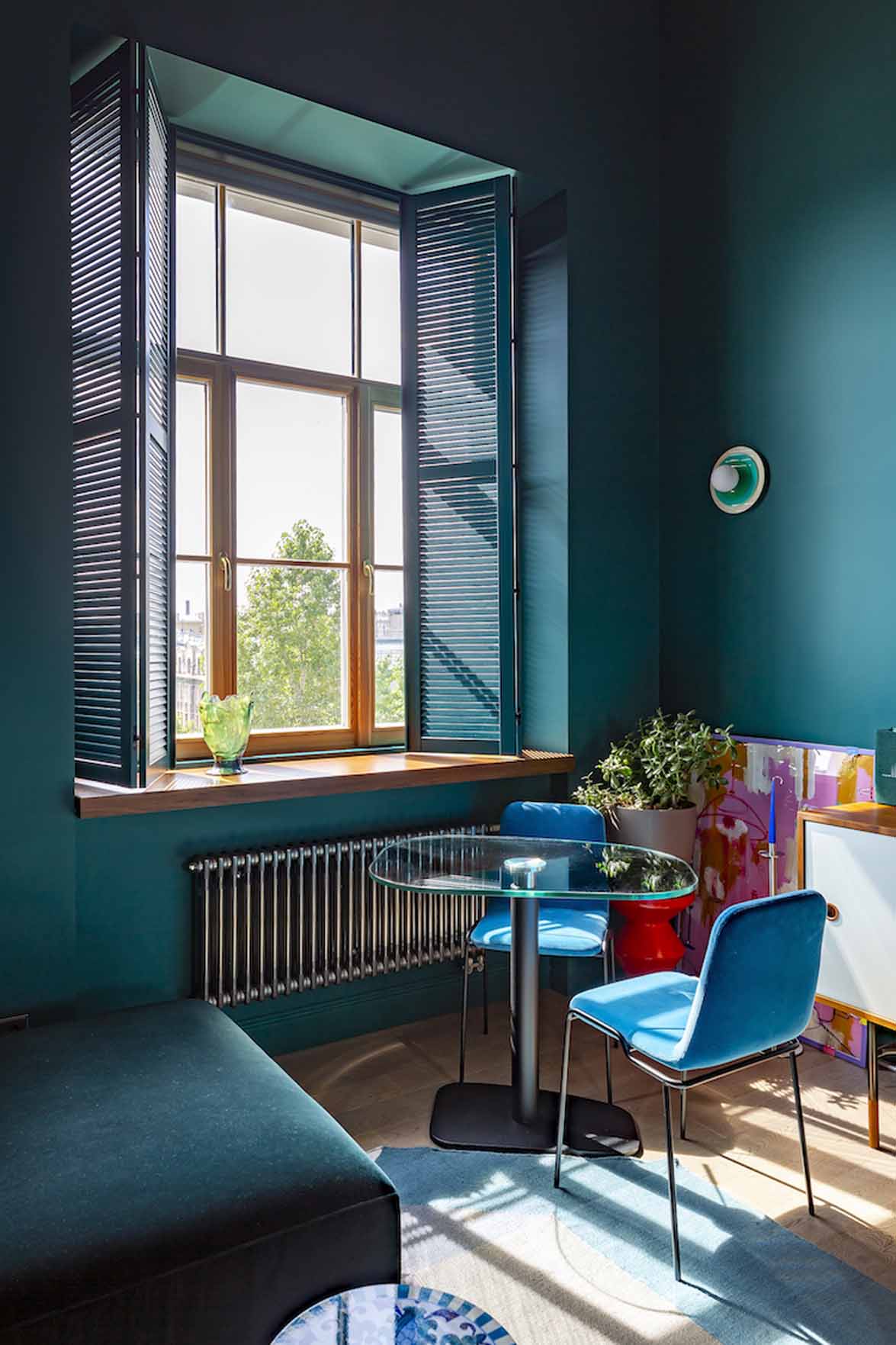 Az enteriőr legmeghatározóbb eleme a bátor színhasználat, amely a tulajdonos dinamikus személyiségét és szakmai hátterét tükrözi. A falakon uralkodó harsány ultramarinkék és smaragdzöld árnyalatok drámai alaphangot adnak a térnek. A szintén smaragdzöldre festett fa spaletták nemcsak árnyékolóként funkcionálnak, hanem az ablakokon beáradó napfény játékát is grafikai elemmé emelik.