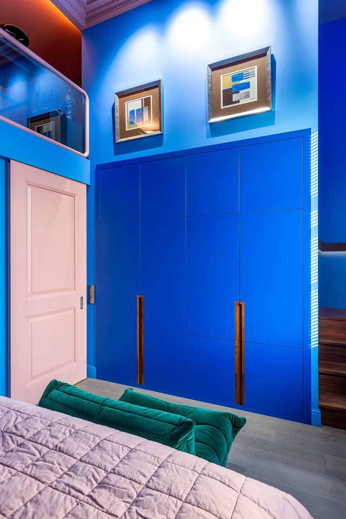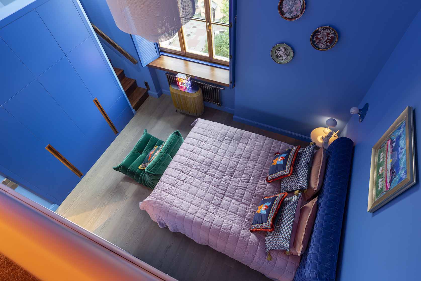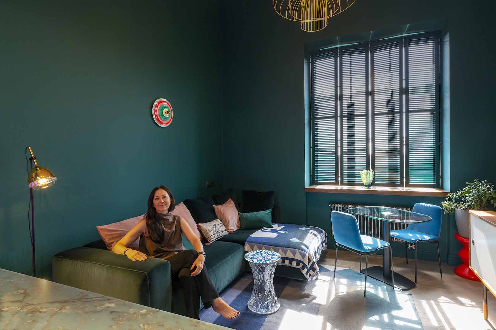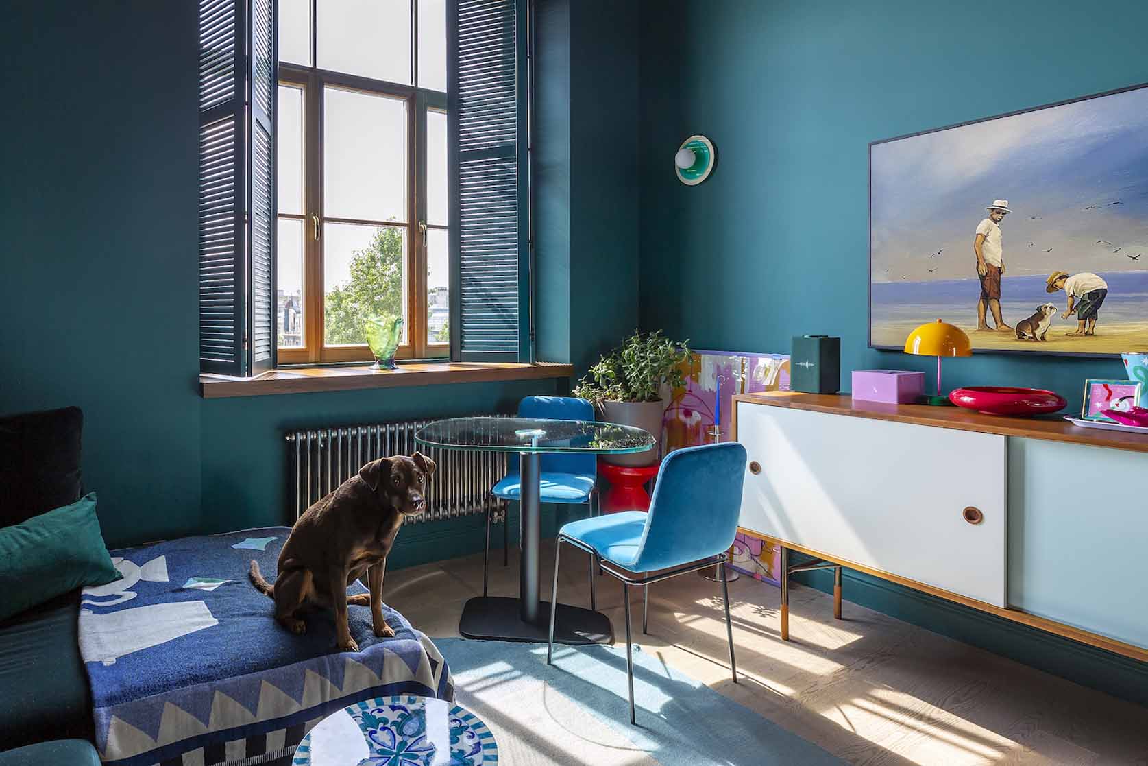 Az enteriőr legmeghatározóbb eleme a bátor színhasználat, amely a tulajdonos dinamikus személyiségét és szakmai hátterét tükrözi. A falakon uralkodó harsány ultramarinkék és smaragdzöld árnyalatok drámai alaphangot adnak a térnek. A szintén smaragdzöldre festett fa spaletták nemcsak árnyékolóként funkcionálnak, hanem az ablakokon beáradó napfény játékát is grafikai elemmé emelik.
