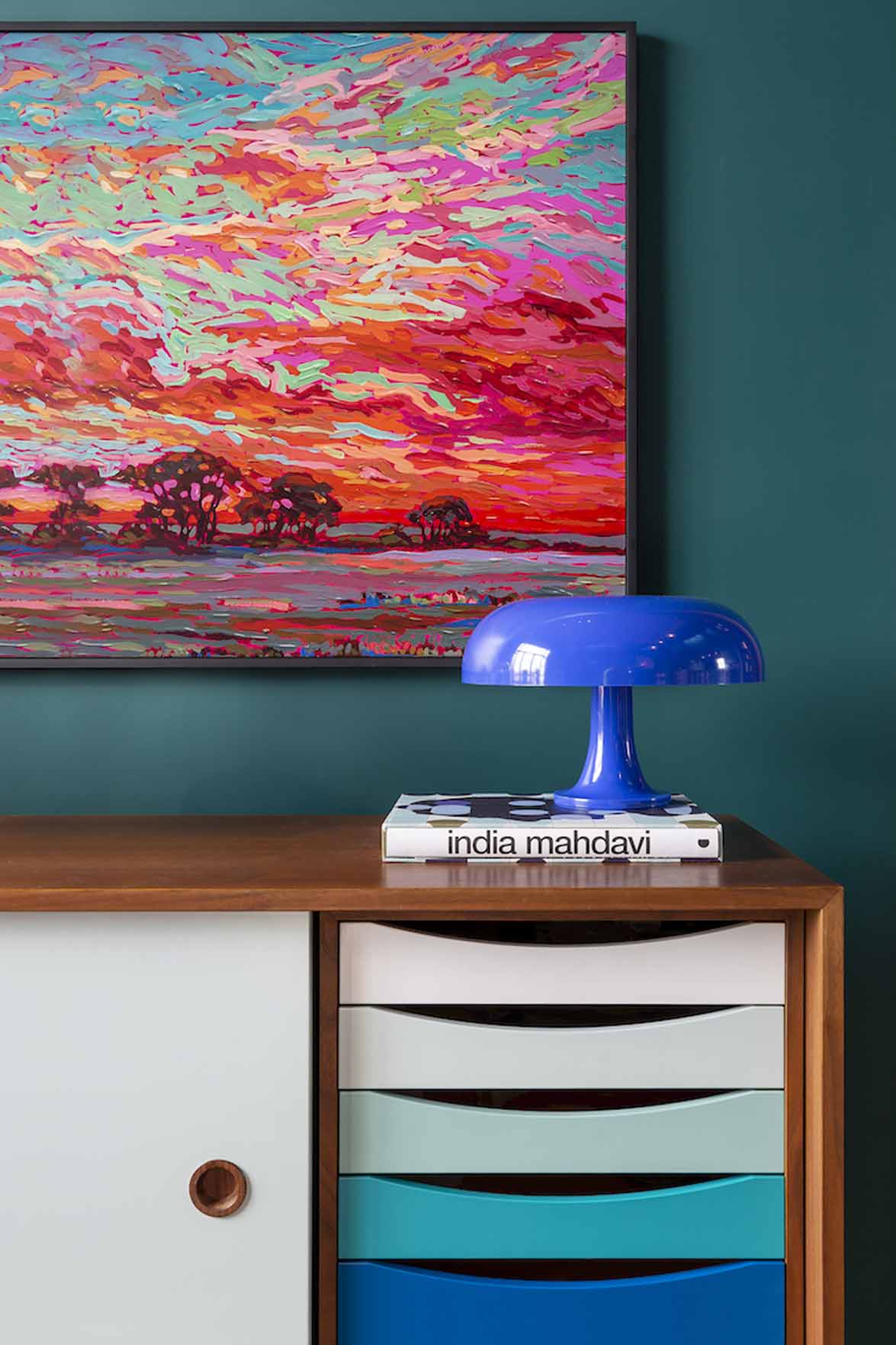 A tulajdonos által választott bútorok között ikonikus mid-century darabokat és kortárs tervezők munkáit láthatjuk, minden karakteres elem a szín- és fénydramaturgiát szolgálja. A lakás dekorációja attól működik igazán, hogy a merész színek nem öncélúak: a tér tagolását, a fény útját és a tárgyak „szerepét” egyszerre rendezik.